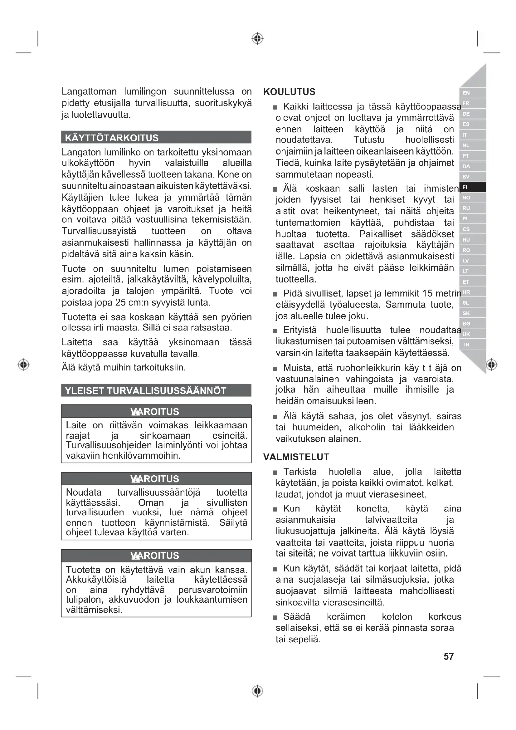 VAROITUS Laite on riittävän voimakas leikkaamaan raajat ja sinkoamaan esineitä. Turvallisuusohjeiden laiminlyönti voi johtaa vakaviin henkilövammoihin. VAROITUS Noudata turvallisuussääntöjä tuotetta käyttäessäsi. Oman ja sivullisten turvallisuuden vuoksi, lue nämä ohjeet ennen tuotteen käynnistämistä. Säilytä ohjeet tulevaa käyttöä varten. VAROITUS Tuotetta on käytettävä vain akun kanssa. Akkukäyttöistä laitetta käytettäessä on aina ryhdyttävä perusvarotoimiin tulipalon, akkuvuodon ja loukkaantumisen välttämiseksi. KOULUTUS ■ Kaikki laitteessa ja tässä käyttöoppaassa olevat ohjeet on luettava ja ymmärrettävä ennen laitteen käyttöä ja niitä on noudatettava. Tutustu huolellisesti ohjaimiin ja laitteen oikeanlaiseen käyttöön. Tiedä, kuinka laite pysäytetään ja ohjaimet sammutetaan nopeasti. ■ Älä koskaan salli lasten tai ihmisten, joiden fyysiset tai henkiset kyvyt tai aistit ovat heikentyneet, tai näitä ohjeita tuntemattomien käyttää, puhdistaa tai huoltaa tuotetta. Paikalliset säädökset saattavat asettaa rajoituksia käyttäjän iälle. Lapsia on pidettävä asianmukaisesti silmällä, jotta he eivät pääse leikkimään tuotteella. ■ Pidä sivulliset, lapset ja lemmikit 15 metrin etäisyydellä työalueesta. Sammuta tuote, jos alueelle tulee joku. ■ Erityistä huolellisuutta tulee noudattaa liukastumisen tai putoamisen välttämiseksi, varsinkin laitetta taaksepäin käytettäessä. ■ Muista, että ruohonleikkurin käy t t äjä on vastuunalainen vahingoista ja vaaroista, jotka hän aiheuttaa muille ihmisille ja heidän omaisuuksilleen. ■ Älä käytä sahaa, jos olet väsynyt, sairas tai huumeiden, alkoholin tai lääkkeiden vaikutuksen alainen. VALMISTELUT ■ Tarkista huolella alue, jolla laitetta käytetään, ja poista kaikki ovimatot, kelkat, laudat, johdot ja muut vierasesineet. ■ Kun käytät konetta, käytä aina asianmukaisia talvivaatteita ja liukusuojattuja jalkineita. Älä käytä löysiä vaatteita tai vaatteita, joista riippuu nuoria tai siteitä; ne voivat tarttua liikkuviin osiin. ■ Kun käytät, säädät tai korjaat laitetta, pidä aina suojalaseja tai silmäsuojuksia, jotka suojaavat silmiä laitteesta mahdollisesti sinkoavilta vierasesineiltä. ■ Säädä keräimen kotelon korkeus sellaiseksi, että se ei kerää pinnasta soraa tai sepeliä.58 | Suomi