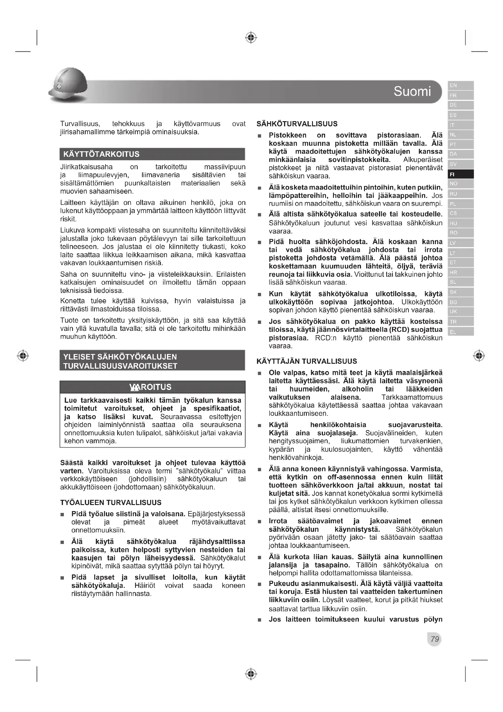 Ŷ Lue käyttöopas ja ohjeet huolellisesti ennen sahan käyttämistä. Ŷ Sähkötyökalun on oltava hyvässä kunnossa ja karan on oltava suora ja täristämätön. Ŷ Älä käytä sahaa ilman paikoilleen asennettuja suojia. Pidä suojukset hyvässä kunnossa ja huolla niitä asianmukaisesti. Ŷ Varmista, että sahan käyttäjä on hyvin perillä käyttöä koskevista varotoimista sekä sahan säädöistä ja toiminnasta. Ŷ Käytä sahalla työskennellessäsi aina suojalaseja ja kuulosuojaimia. Suojakäsineiden, turvallisten ja tukevapohjaisten kenkien, kuulosuojainten ja suojaesiliinan käyttöä suositellaan. Ŷ Tutustu käyttöoppaaseen ennen lisälaitteiden käyttöä. Lisälaitteen väärä käyttötapa voi johtaa vahinkoon ja mahdolliseen henkilövammaan. Ŷ Käytä ainoastaan tämän käyttöoppaan mukaisia teriä, jotka noudattavat EN 847-1 -standardia. Ŷ Noudata terään merkittyä maksiminopeutta. Varmista, että sahanterään merkitty nopeus on vähintään yhtä suuri kuin sahaan merkitty nopeus. Ŷ Käytä aina akselille sopivia teräkokoja ja -muotoja. Akselille sopimattomat terät eivät pyöri oikealla tavalla ja voivat aiheuttaa työkalun hallinnan menettämisen. Ŷ Älä käytä suositeltua suurempia tai pienempiä teriä. Älä käytä välilevyjä sovittaessasi terää karaan. Ŷ Aina ennen käytön alkamista tarkista, näkyykö sahanterän kärjissä vaurioita tai epäsäännöllistä kuluneisuutta. Vaurioituneet ja löystyneet kärjet voivat sinkoutua hallitsemattomasti ympäristöön ja aiheuttaa henkilövammoja.Suomi