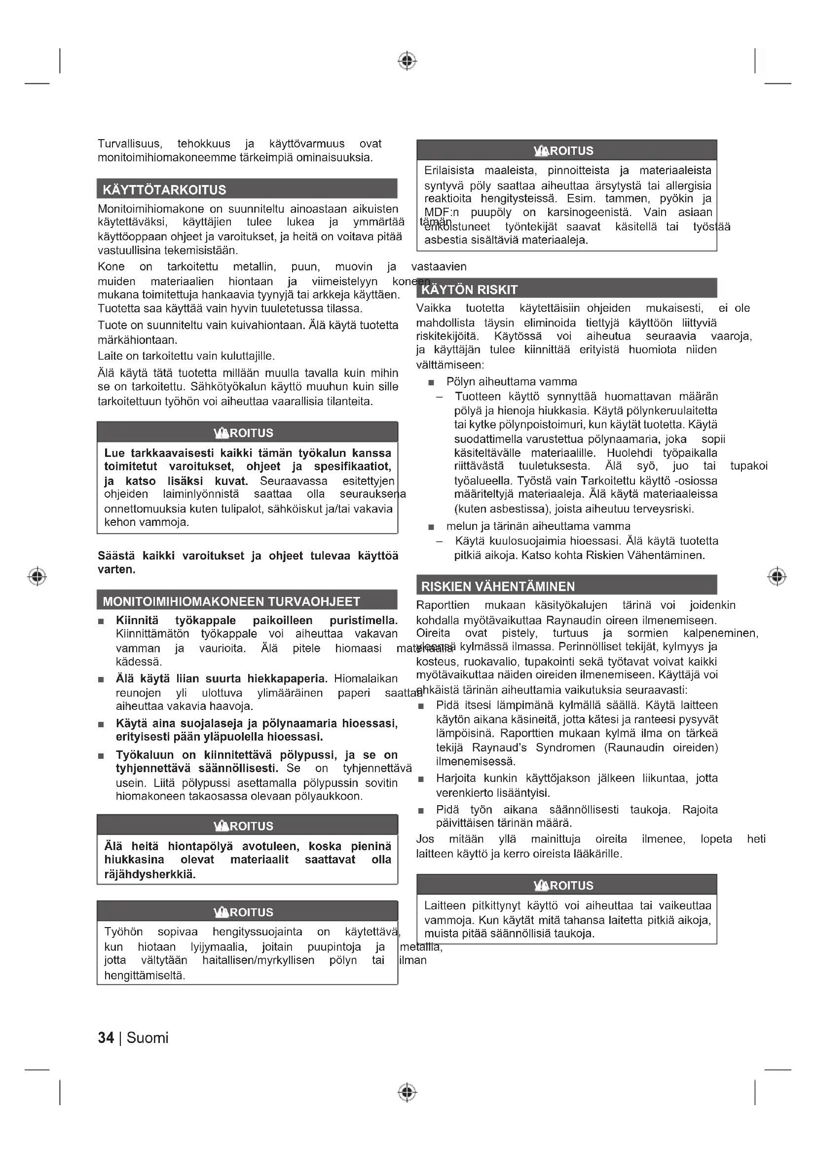9DLNND WXRWHWWD Nl\WHWWlLVLLQ RKMHLGHQ PXNDLVHVWL HL ROH PDKGROOLVWD Wl\VLQ HOLPLQRLGD WLHWW\Ml Nl\WW||Q OLLWW\YLl ULVNLWHNLM|LWl .l\W|VVl YRL DLKHXWXD VHXUDDYLD YDDURMD MD Nl\WWlMlQ WXOHH NLLQQLWWll HULW\LVWl KXRPLRWD QLLGHQ välttämiseen: Ŷ Pölyn aiheuttama vamma – Tuotteen käyttö synnyttää huomattavan määrän S|O\lMDKLHQRMDKLXNNDVLD.l\WlS|O\QNHUXXODLWHWWD tai kytke pölynpoistoimuri, kun käytät tuotetta. Käytä