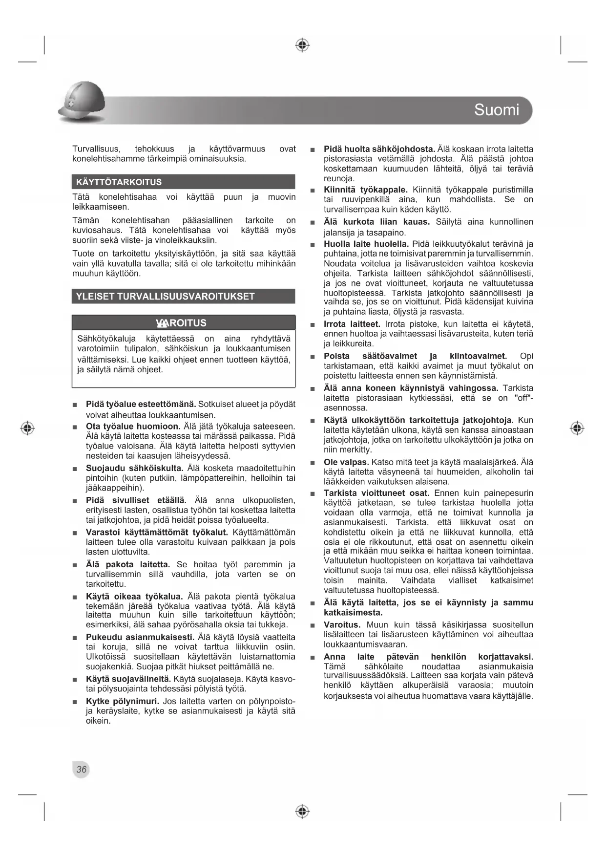 Tätä konelehtisahaa voi käyttää puun ja muovin leikkaamiseen. Tämän konelehtisahan pääasiallinen tarkoite on kuviosahaus. Tätä konelehtisahaa voi käyttää myös suoriin sekä viiste- ja vinoleikkauksiin. Tuote on tarkoitettu yksityiskäyttöön, ja sitä saa käyttää vain yllä kuvatulla tavalla; sitä ei ole tarkoitettu mihinkään muuhun käyttöön. YLEISET TURVALLISUUSVAROITUKSET VAROITUS Sähkötyökaluja käytettäessä on aina ryhdyttävä varotoimiin tulipalon, sähköiskun ja loukkaantumisen välttämiseksi. Lue kaikki ohjeet ennen tuotteen käyttöä, ja säilytä nämä ohjeet. Ŷ Pidä työalue esteettömänä. Sotkuiset alueet ja pöydät voivat aiheuttaa loukkaantumisen. Ŷ Ota työalue huomioon. Älä jätä työkaluja sateeseen. Älä käytä laitetta kosteassa tai märässä paikassa. Pidä työalue valoisana. Älä käytä laitetta helposti syttyvien nesteiden tai kaasujen läheisyydessä. Ŷ Suojaudu sähköiskulta. Älä kosketa maadoitettuihin pintoihin (kuten putkiin, lämpöpattereihin, helloihin tai jääkaappeihin). Ŷ Pidä sivulliset etäällä. Älä anna ulkopuolisten, erityisesti lasten, osallistua työhön tai koskettaa laitetta tai jatkojohtoa, ja pidä heidät poissa työalueelta. Ŷ Varastoi käyttämättömät työkalut. Käyttämättömän laitteen tulee olla varastoitu kuivaan paikkaan ja pois lasten ulottuvilta. Ŷ Älä pakota laitetta. Se hoitaa työt paremmin ja turvallisemmin sillä vauhdilla, jota varten se on tarkoitettu. Ŷ Käytä oikeaa työkalua. Älä pakota pientä työkalua tekemään järeää työkalua vaativaa työtä. Älä käytä laitetta muuhun kuin sille tarkoitettuun käyttöön; esimerkiksi, älä sahaa pyörösahalla oksia tai tukkeja. Ŷ Pukeudu asianmukaisesti. Älä käytä löysiä vaatteita tai koruja, sillä ne voivat tarttua liikkuviin osiin. Ulkotöissä suositellaan käytettävän luistamattomia suojakenkiä. Suojaa pitkät hiukset peittämällä ne. Ŷ Käytä suojavälineitä. Käytä suojalaseja. Käytä kasvo- tai pölysuojainta tehdessäsi pölyistä työtä. Ŷ Kytke pölynimuri. Jos laitetta varten on pölynpoisto- ja keräyslaite, kytke se asianmukaisesti ja käytä sitä oikein. Ŷ Pidä huolta sähköjohdosta. Älä koskaan irrota laitetta pistorasiasta vetämällä johdosta. Älä päästä johtoa koskettamaan kuumuuden lähteitä, öljyä tai teräviä reunoja. Ŷ Kiinnitä työkappale. Kiinnitä työkappale puristimilla tai ruuvipenkillä aina, kun mahdollista. Se on turvallisempaa kuin käden käyttö. Ŷ Älä kurkota liian kauas. Säilytä aina kunnollinen jalansija ja tasapaino. Ŷ Huolla laite huolella. Pidä leikkuutyökalut terävinä ja puhtaina, jotta ne toimisivat paremmin ja turvallisemmin. Noudata voitelua ja lisävarusteiden vaihtoa koskevia ohjeita. Tarkista laitteen sähköjohdot säännöllisesti, ja jos ne ovat vioittuneet, korjauta ne valtuutetussa huoltopisteessä. Tarkista jatkojohto säännöllisesti ja vaihda se, jos se on vioittunut. Pidä kädensijat kuivina ja puhtaina liasta, öljystä ja rasvasta. Ŷ Irrota laitteet. Irrota pistoke, kun laitetta ei käytetä, ennen huoltoa ja vaihtaessasi lisävarusteita, kuten teriä ja leikkureita. Ŷ Poista säätöavaimet ja kiintoavaimet. Opi tarkistamaan, että kaikki avaimet ja muut työkalut on poistettu laitteesta ennen sen käynnistämistä. Ŷ Älä anna koneen käynnistyä vahingossa. Tarkista laitetta pistorasiaan kytkiessäsi, että se on "off"- asennossa. Ŷ Käytä ulkokäyttöön tarkoitettuja jatkojohtoja. Kun laitetta käytetään ulkona, käytä sen kanssa ainoastaan jatkojohtoja, jotka on tarkoitettu ulkokäyttöön ja jotka on niin merkitty. Ŷ Ole valpas. Katso mitä teet ja käytä maalaisjärkeä. Älä käytä laitetta väsyneenä tai huumeiden, alkoholin tai lääkkeiden vaikutuksen alaisena. Ŷ Tarkista vioittuneet osat. Ennen kuin painepesurin käyttöä jatketaan, se tulee tarkistaa huolella jotta voidaan olla varmoja, että ne toimivat kunnolla ja asianmukaisesti. Tarkista, että liikkuvat osat on kohdistettu oikein ja että ne liikkuvat kunnolla, että osia ei ole rikkoutunut, että osat on asennettu oikein ja että mikään muu seikka ei haittaa koneen toimintaa. Valtuutetun huoltopisteen on korjattava tai vaihdettava vioittunut suoja tai muu osa, ellei näissä käyttöohjeissa toisin mainita. Vaihdata vialliset katkaisimet valtuutetussa huoltopisteessä. Ŷ Älä käytä laitetta, jos se ei käynnisty ja sammu katkaisimesta. Ŷ Varoitus. Muun kuin tässä käsikirjassa suositellun lisälaitteen tai lisäarusteen käyttäminen voi aiheuttaa loukkaantumisvaaran. Ŷ Anna laite pätevän henkilön korjattavaksi. Tämä sähkölaite noudattaa asianmukaisia turvallisuussäädöksiä. Laitteen saa korjata vain pätevä henkilö käyttäen alkuperäisiä varaosia; muutoin korjauksesta voi aiheutua huomattava vaara käyttäjälle. Suomi 36KONELEHTISAHAN TURVALLISUUSVAROITUKSET Ŷ Käytä konetta vasta kun se on ohjeiden mukaisesti täysin kokoonpantu ja asennettu. Ŷ Konelehtisaha on kiinnitettävä lujasti työpenkkiin. Jos työpenkki pyrkii liikkumaan työn aikana, se on kiinnitettävä lattiaan. Ŷ Kytke konelehtisaha irti virtalähteestä, kun asennat tai vaihdat teriä. Ŷ Terän hampaiden on osoitettava alaspäin. Ŷ Varmista ennen konelehtisahan käynnistämistä, että sen terä on oikealla tavalla kiristetty, liikaa kiristetty terä voi murtua. Ŷ Älä yritä leikata liian pientä työkappaletta, jota ei voi tukea turvallisesti. Ŷ Pidä kädet kaukana terästä. Ŷ Pidä työkappaletta aina lujasti pöytää vasten. Ŷ Kun leikkaat työkappaletta, älä syötä sitä liian nopeasti. Syötä työkappaletta vain sen verran kuin terä ehtii leikata sitä. Ŷ Käytä korvasuojia. Altistuminen melulle voi vahingoittaa kuuloa. Ŷ Käytä laitteella työskennellessäsi aina suojalaseja. Suojakäsineiden, turvallisten ja tukevapohjaisten kenkien, kuulosuojainten ja suojaesiliinan käyttöä suositellaa