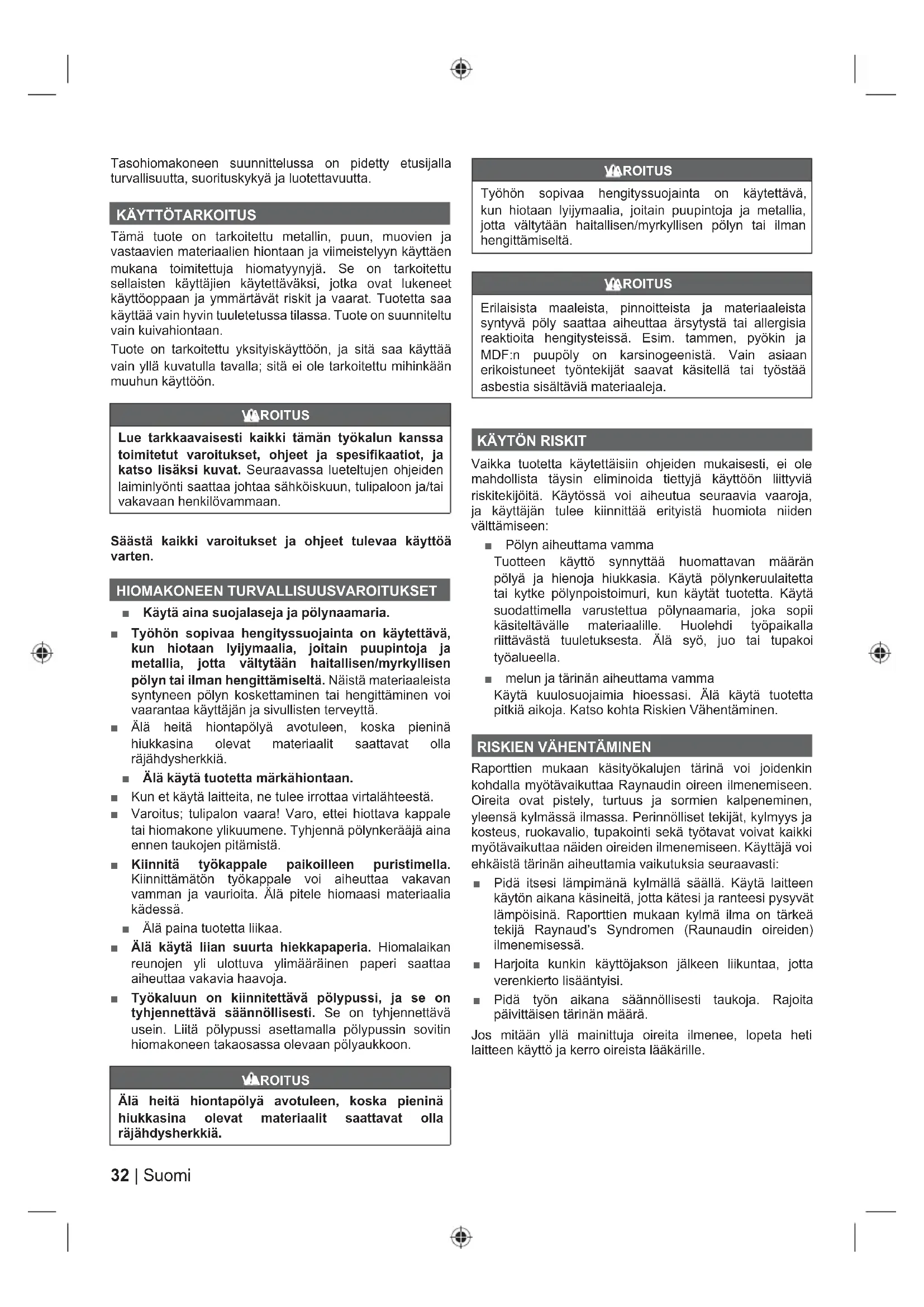 Vaikka tuotetta käytettäisiin ohjeiden mukaisesti, ei ole mahdollista täysin eliminoida tiettyjä käyttöön liittyviä riskitekijöitä. Käytössä voi aiheutua seuraavia vaaroja, ja käyttäjän tulee kiinnittää erityistä huomiota niiden välttämiseen: ■ Pölyn aiheuttama vamma Tuotteen käyttö synnyttää huomattavan määrän pölyä ja hienoja hiukkasia. Käytä pölynkeruulaitetta tai kytke pölynpoistoimuri, kun käytät tuotetta. Käytä suodattimella varustettua pölynaamaria, joka sopii käsiteltävälle materiaalille. Huolehdi työpaikalla riittävästä tuuletuksesta. Älä syö, juo tai tupakoi työalueella. ■ melun ja tärinän aiheuttama vamma Käytä kuulosuojaimia hioessasi. Älä käytä tuotetta pitkiä aikoja. Katso kohta Riskien Vähentäminen.
