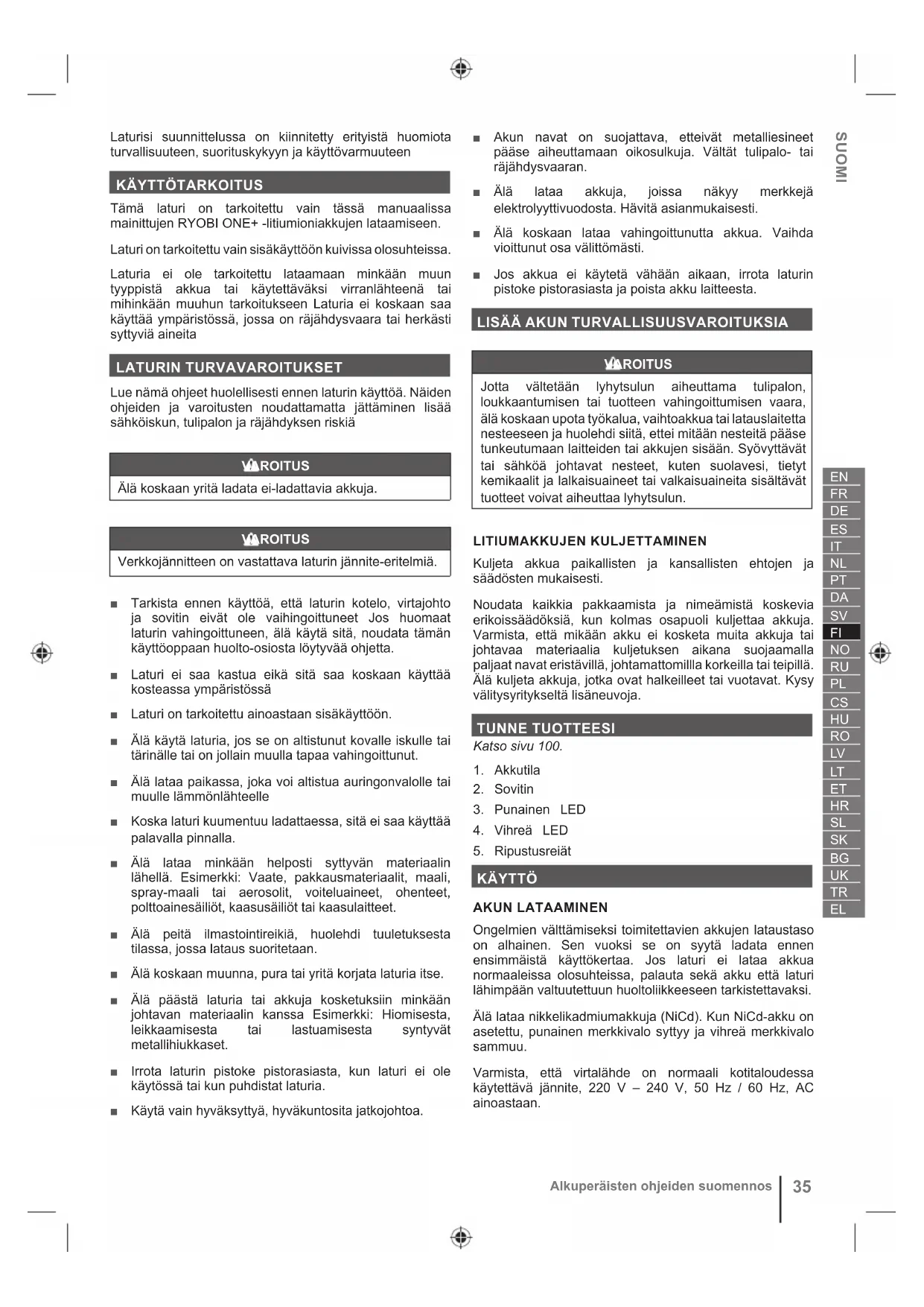 Tämä laturi on tarkoitettu vain tässä manuaalissa mainittujen RYOBI ONE+ -litiumioniakkujen lataamiseen. Laturi on tarkoitettu vain sisäkäyttöön kuivissa olosuhteissa. Laturia ei ole tarkoitettu lataamaan minkään muun tyyppistä akkua tai käytettäväksi virranlähteenä tai mihinkään muuhun tarkoitukseen Laturia ei koskaan saa käyttää ympäristössä, jossa on räjähdysvaara tai herkästi syttyviä aineita LATURIN TURVAVAROITUKSET Lue nämä ohjeet huolellisesti ennen laturin käyttöä. Näiden ohjeiden ja varoitusten noudattamatta jättäminen lisää sähköiskun, tulipalon ja räjähdyksen riskiä VAROITUS Älä koskaan yritä ladata ei-ladattavia akkuja. VAROITUS Verkkojännitteen on vastattava laturin jännite-eritelmiä. Ŷ Tarkista ennen käyttöä, että laturin kotelo, virtajohto ja sovitin eivät ole vaihingoittuneet Jos huomaat laturin vahingoittuneen, älä käytä sitä, noudata tämän käyttöoppaan huolto-osiosta löytyvää ohjetta. Ŷ Laturi ei saa kastua eikä sitä saa koskaan käyttää kosteassa ympäristössä Ŷ Laturi on tarkoitettu ainoastaan sisäkäyttöön. Ŷ Älä käytä laturia, jos se on altistunut kovalle iskulle tai tärinälle tai on jollain muulla tapaa vahingoittunut. Ŷ Älä lataa paikassa, joka voi altistua auringonvalolle tai muulle lämmönlähteelle Ŷ Koska laturi kuumentuu ladattaessa, sitä ei saa käyttää palavalla pinnalla. Ŷ Älä lataa minkään helposti syttyvän materiaalin lähellä. Esimerkki: Vaate, pakkausmateriaalit, maali, spray-maali tai aerosolit, voiteluaineet, ohenteet, polttoainesäiliöt, kaasusäiliöt tai kaasulaitteet. Ŷ Älä peitä ilmastointireikiä, huolehdi tuuletuksesta tilassa, jossa lataus suoritetaan. Ŷ Älä koskaan muunna, pura tai yritä korjata laturia itse. Ŷ Älä päästä laturia tai akkuja kosketuksiin minkään johtavan materiaalin kanssa Esimerkki: Hiomisesta, leikkaamisesta tai lastuamisesta syntyvät metallihiukkaset. Ŷ Irrota laturin pistoke pistorasiasta, kun laturi ei ole käytössä tai kun puhdistat laturia. Ŷ Käytä vain hyväksyttyä, hyväkuntosita jatkojohtoa. Ŷ Akun navat on suojattava, etteivät metalliesineet pääse aiheuttamaan oikosulkuja. Vältät tulipalo- tai räjähdysvaaran. Ŷ Älä lataa akkuja, joissa näkyy merkkejä elektrolyyttivuodosta. Hävitä asianmukaisesti. Ŷ Älä koskaan lataa vahingoittunutta akkua. Vaihda vioittunut osa välittömästi. Ŷ Jos akkua ei käytetä vähään aikaan, irrota laturin pistoke pistorasiasta ja poista akku laitteesta.
