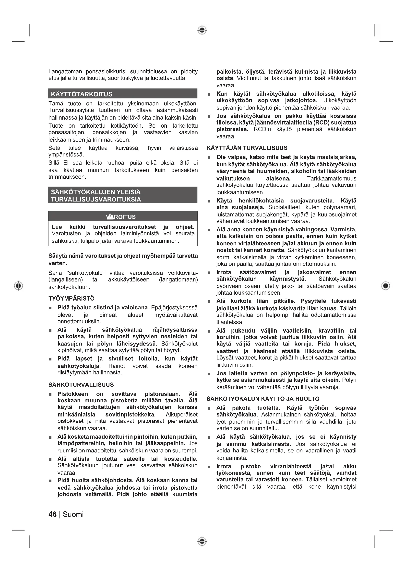 TURVALLISUUSVAROITUKSIA VAROITUS Lue kaikki turvallisuusvaroitukset ja ohjeet. Varoitusten ja ohjeiden laiminlyönnistä voi seurata sähköisku, tulipalo ja/tai vakava loukkaantuminen. Säilytä nämä varoitukset ja ohjeet myöhempää tarvetta varten. Sana ”sähkötyökalu” viittaa varoituksissa verkkovirta- (langalliseen) tai akkukäyttöiseen (langattomaan) sähkötyökaluun.