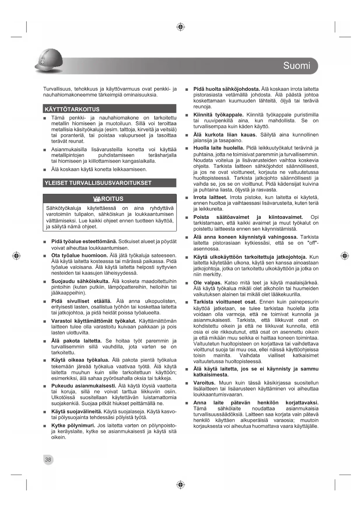 Ŷ Tämä penkki- ja nauhahiomakone on tarkoitettu metallin hiomiseen ja muotoiluun. Sillä voi teroittaa metallisia käsityökaluja (esim. talttoja, kirveitä ja veitsiä) tai poranteriä, tai poistaa valupurseet ja tasoittaa terävät reunat. Ŷ Asianmukaisilla lisävarusteilla konetta voi käyttää metallipintojen puhdistamiseen teräsharjalla tai hiomiseen ja kiillottamiseen kangaslaikalla. Ŷ Älä koskaan käytä konetta leikkaamiseen. YLEISET TURVALLISUUSVAROITUKSET VAROITUS Sähkötyökaluja käytettäessä on aina ryhdyttävä varotoimiin tulipalon, sähköiskun ja loukkaantumisen välttämiseksi. Lue kaikki ohjeet ennen tuotteen käyttöä, ja säilytä nämä ohjeet. Ŷ Pidä työalue esteettömänä. Sotkuiset alueet ja pöydät voivat aiheuttaa loukkaantumisen. Ŷ Ota työalue huomioon. Älä jätä työkaluja sateeseen. Älä käytä laitetta kosteassa tai märässä paikassa. Pidä työalue valoisana. Älä käytä laitetta helposti syttyvien nesteiden tai kaasujen läheisyydessä. Ŷ Suojaudu sähköiskulta. Älä kosketa maadoitettuihin pintoihin (kuten putkiin, lämpöpattereihin, helloihin tai jääkaappeihin). Ŷ Pidä sivulliset etäällä. Älä anna ulkopuolisten, erityisesti lasten, osallistua työhön tai koskettaa laitetta tai jatkojohtoa, ja pidä heidät poissa työalueelta. Ŷ Varastoi käyttämättömät työkalut. Käyttämättömän laitteen tulee olla varastoitu kuivaan paikkaan ja pois lasten ulottuvilta. Ŷ Älä pakota laitetta. Se hoitaa työt paremmin ja turvallisemmin sillä vauhdilla, jota varten se on tarkoitettu. Ŷ Käytä oikeaa työkalua. Älä pakota pientä työkalua tekemään järeää työkalua vaativaa työtä. Älä käytä laitetta muuhun kuin sille tarkoitettuun käyttöön; esimerkiksi, älä sahaa pyörösahalla oksia tai tukkeja. Ŷ Pukeudu asianmukaisesti. Älä käytä löysiä vaatteita tai koruja, sillä ne voivat tarttua liikkuviin osiin. Ulkotöissä suositellaan käytettävän luistamattomia suojakenkiä. Suojaa pitkät hiukset peittämällä ne. Ŷ Käytä suojavälineitä. Käytä suojalaseja. Käytä kasvo- tai pölysuojainta tehdessäsi pölyistä työtä. Ŷ Kytke pölynimuri. Jos laitetta varten on pölynpoisto- ja keräyslaite, kytke se asianmukaisesti ja käytä sitä oikein. Ŷ Pidä huolta sähköjohdosta. Älä koskaan irrota laitetta pistorasiasta vetämällä johdosta. Älä päästä johtoa koskettamaan kuumuuden lähteitä, öljyä tai teräviä reunoja. Ŷ Kiinnitä työkappale. Kiinnitä työkappale puristimilla tai ruuvipenkillä aina, kun mahdollista. Se on turvallisempaa kuin käden käyttö. Ŷ Älä kurkota liian kauas. Säilytä aina kunnollinen jalansija ja tasapaino. Ŷ Huolla laite huolella. Pidä leikkuutyökalut terävinä ja puhtaina, jotta ne toimisivat paremmin ja turvallisemmin. Noudata voitelua ja lisävarusteiden vaihtoa koskevia ohjeita. Tarkista laitteen sähköjohdot säännöllisesti, ja jos ne ovat vioittuneet, korjauta ne valtuutetussa huoltopisteessä. Tarkista jatkojohto säännöllisesti ja vaihda se, jos se on vioittunut. Pidä kädensijat kuivina ja puhtaina liasta, öljystä ja rasvasta. Ŷ Irrota laitteet. Irrota pistoke, kun laitetta ei käytetä, ennen huoltoa ja vaihtaessasi lisävarusteita, kuten teriä ja leikkureita. Ŷ Poista säätöavaimet ja kiintoavaimet. Opi tarkistamaan, että kaikki avaimet ja muut työkalut on poistettu laitteesta ennen sen käynnistämistä. Ŷ Älä anna koneen käynnistyä vahingossa. Tarkista laitetta pistorasiaan kytkiessäsi, että se on "off"- asennossa. Ŷ Käytä ulkokäyttöön tarkoitettuja jatkojohtoja. Kun laitetta käytetään ulkona, käytä sen kanssa ainoastaan jatkojohtoja, jotka on tarkoitettu ulkokäyttöön ja jotka on niin merkitty. Ŷ Ole valpas. Katso mitä teet ja käytä maalaisjärkeä. Älä käytä työkalua mikäli olet alkoholin tai huumeiden vaikutuksen alainen tai mikäli olet lääkekuurilla. Ŷ Tarkista vioittuneet osat. Ennen kuin painepesurin käyttöä jatketaan, se tulee tarkistaa huolella jotta voidaan olla varmoja, että ne toimivat kunnolla ja asianmukaisesti. Tarkista, että liikkuvat osat on kohdistettu oikein ja että ne liikkuvat kunnolla, että osia ei ole rikkoutunut, että osat on asennettu oikein ja että mikään muu seikka ei haittaa koneen toimintaa. Valtuutetun huoltopisteen on korjattava tai vaihdettava vioittunut suoja tai muu osa, ellei näissä käyttöohjeissa toisin mainita. Vaihdata vialliset katkaisimet valtuutetussa huoltopisteessä. Ŷ Älä käytä laitetta, jos se ei käynnisty ja sammu katkaisimesta. Ŷ Varoitus. Muun kuin tässä käsikirjassa suositellun lisälaitteen tai lisäarusteen käyttäminen voi aiheuttaa loukkaantumisvaaran. Ŷ Anna laite pätevän henkilön korjattavaksi. Tämä sähkölaite noudattaa asianmukaisia turvallisuussäädöksiä. Laitteen saa korjata vain pätevä henkilö käyttäen alkuperäisiä varaosia; muutoin korjauksesta voi aiheutua huomattava vaara käyttäjälle.Suomi