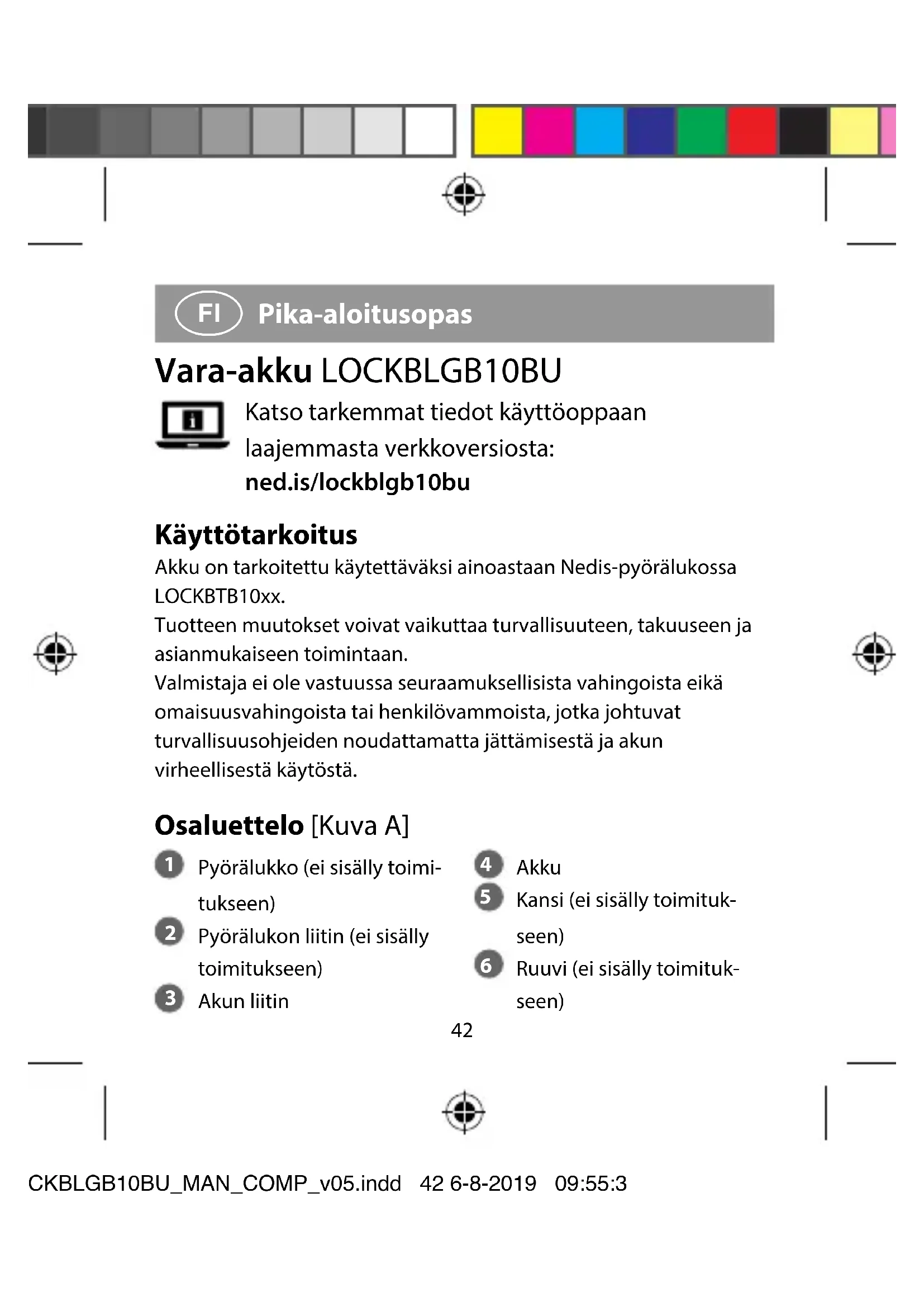 Pika-aloitusopas Vara-akku LOCKBLGB10BU Katso tarkemmat tiedot käyttöoppaan laajemmasta verkkoversiosta: ned.is/lockblgb10bu Käyttötarkoitus Akku on tarkoitettu käytettäväksi ainoastaan Nedis-pyörälukossa LOCKBTB10xx. Tuotteen muutokset voivat vaikuttaa turvallisuuteen, takuuseen ja asianmukaiseen toimintaan. Valmistaja ei ole vastuussa seuraamuksellisista vahingoista eikä omaisuusvahingoista tai henkilövammoista, jotka johtuvat turvallisuusohjeiden noudattamatta jättämisestä ja akun virheellisestä käytöstä. Osaluettelo [Kuva A]