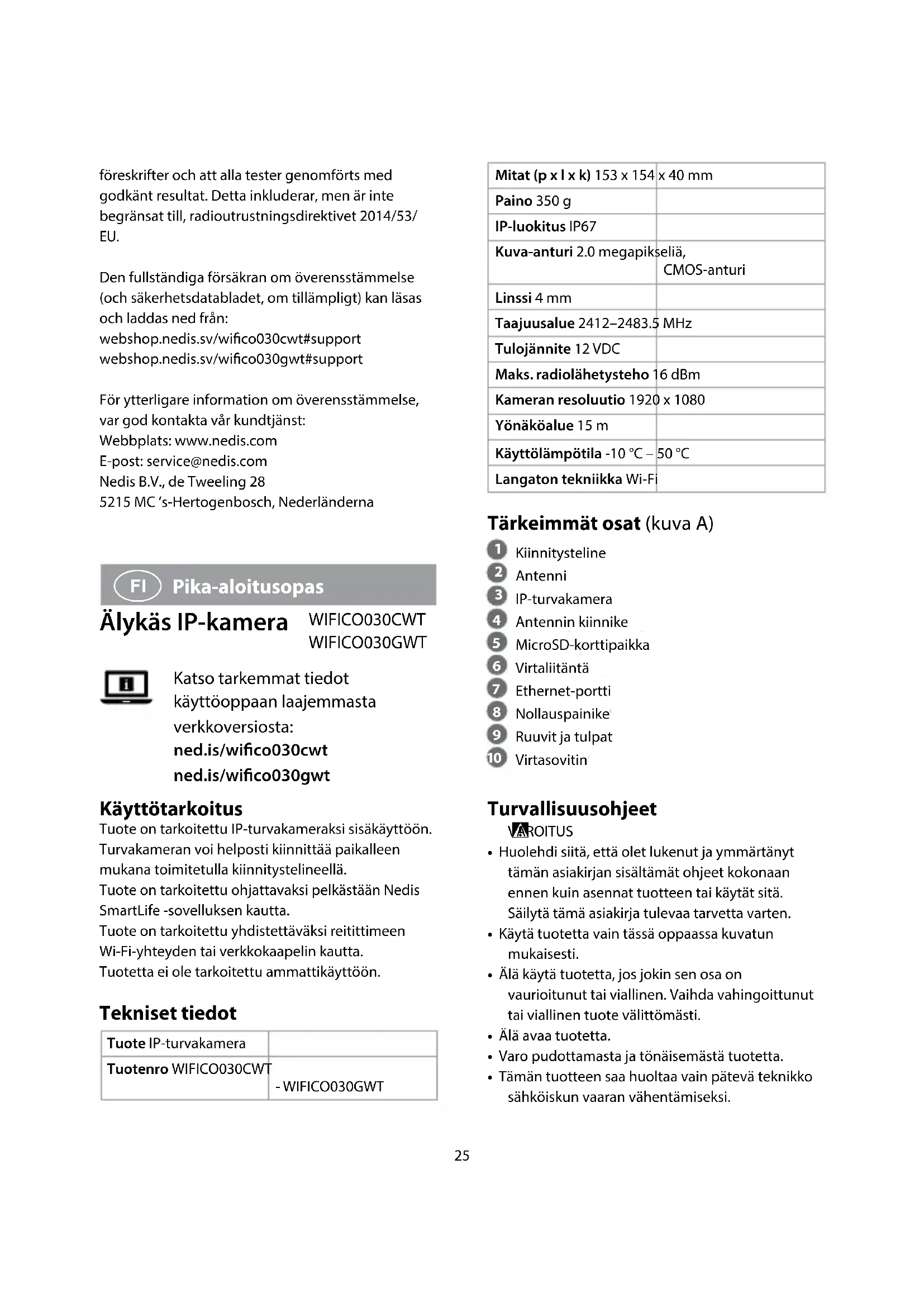 Pika-aloitusopas Älykäs IP-kamera WIFICO030CWT WIFICO030GWT Katso tarkemmat tiedot käyttöoppaan laajemmasta verkkoversiosta: ned.is/wico030cwt ned.is/wico030gwt Käyttötarkoitus Tuote on tarkoitettu IP-turvakameraksi sisäkäyttöön.Turvakameran voi helposti kiinnittää paikalleen mukana toimitetulla kiinnitystelineellä.Tuote on tarkoitettu ohjattavaksi pelkästään Nedis SmartLife -sovelluksen kautta.Tuote on tarkoitettu yhdistettäväksi reitittimeen Wi-Fi-yhteyden tai verkkokaapelin kautta.Tuotetta ei ole tarkoitettu ammattikäyttöön. Tekniset tiedot Tuote IP-turvakameraTuotenro WIFICO030CWT - WIFICO030GWT26 -sovelluksessa.
