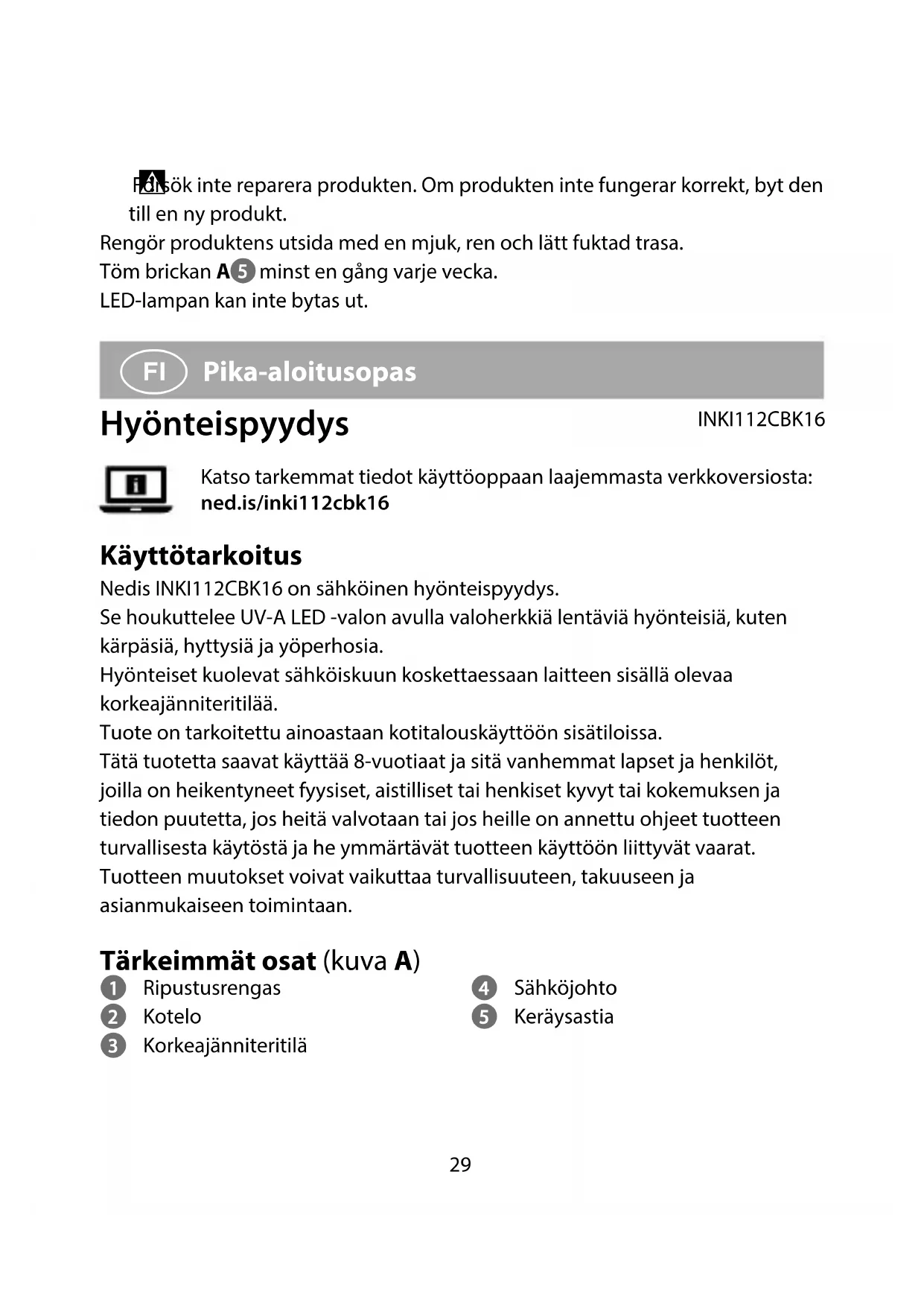 Pika-aloitusopas Hyönteispyydys INKI112CBK16Katso tarkemmat tiedot käyttöoppaan laajemmasta verkkoversiosta: ned.is/inki112cbk16 Käyttötarkoitus Nedis INKI112CBK16 on sähköinen hyönteispyydys.Se houkuttelee UV-A LED -valon avulla valoherkkiä lentäviä hyönteisiä, kuten kärpäsiä, hyttysiä ja yöperhosia.Hyönteiset kuolevat sähköiskuun koskettaessaan laitteen sisällä olevaa korkeajänniteritilää.Tuote on tarkoitettu ainoastaan kotitalouskäyttöön sisätiloissa.Tätä tuotetta saavat käyttää 8-vuotiaat ja sitä vanhemmat lapset ja henkilöt, joilla on heikentyneet fyysiset, aistilliset tai henkiset kyvyt tai kokemuksen ja tiedon puutetta, jos heitä valvotaan tai jos heille on annettu ohjeet tuotteen turvallisesta käytöstä ja he ymmärtävät tuotteen käyttöön liittyvät vaarat.Tuotteen muutokset voivat vaikuttaa turvallisuuteen, takuuseen ja asianmukaiseen toimintaan. Tärkeimmät osat (kuva A) 1 Ripustusrengas 2 Kotelo 3 Korkeajänniteritilä 4 Sähköjohto 5 Keräysastia30 Turvallisuusohjeet