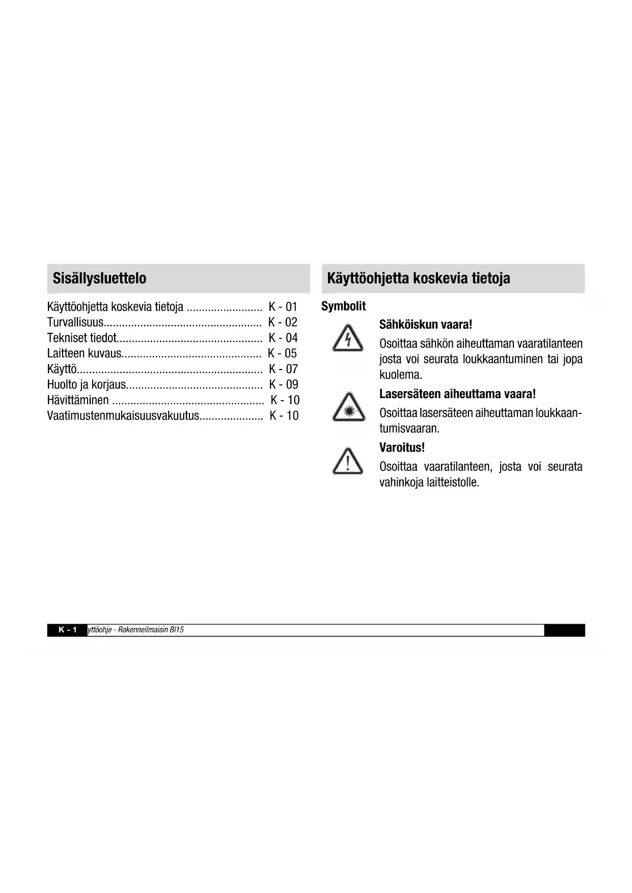 – Hvis der findes metal, vises linjer på displayet. Med lille afstand til træet vandrer linjerne ind til midten af displayet (se illustrationen på side J - 6). – Hvis der detekteres en kant, vises symbolet „EDGE“ (15) og der lyder en bip-tone. Detektering af vekselstrøm Detekteringen af vekselstrøm er altid tændt. Detekteres der en vekselstrømsførende ledning, lyser LED´en (3), og der lyder en bip-tone. Laserponter Tryk på tasten „Laser“ (5) for at tænde/slukke laseren. Drej på dåselibellen (2) for at dreje laserpointeren i trin à 45°. Slukke Apparatet slukkes, så snart du slipper tasten „On“ (8).J - 9 Betjeningsvejledning - Ledningsdetektor Bl15 DA Batteriskift Forsigtig! Sørg for, at apparatets overflade er tør, og at apparatet er slukket. Rengøring Rengør apparatet med en blød, let fugtig, fnugfri klud. Sørg for, at der ikke kommer fugt ind i huset. Brug ikke sprays, opløsningsmidler, alkoholholdige rengøringsmidler eller skuremidler, men kun rent vand til at fugte kluden. Reparation Foretag ikke ændringer på apparatet, og monter ikke reservedele. Henvend dig til producenten i forbindelse med reparation eller kontrol af apparatet. Vedligeholdelse og reparationDA Betjeningsvejledning - Ledningsdetektor Bl15 J - 10 Elektroniske apparater hører ikke til i husholdningsaffaldet, men skal i EU – i henhold til EUROPA-PARLAMENTETS OG RÅDETS DIREKTIV 2002/96/EF af 27. januar 2003 om affald af elektrisk og elektronisk udstyr – bortskaffes på en faglig korrekt måde. Bortskaf dette apparat i henhold til bestemmelserne i den gældende lovgivning, når det ikke skal bruges længere. i henhold til EF-lavspændingsdirektivet 2006/95/EF, bilag III, afsnit B, og EF-direktivet 2004/108/EF om elektromagnetisk kompatibilitet. Hermed erklærer vi, at måleapparatet BI15 er udviklet, konstrueret og fremstillet i overensstemmelse med de nævnte EF-direktiver. Producent: Trotec GmbH & Co. KG Telefon: +49 2452 962-400 Grebbener Straße 7 Fax: +49 2452 962-200 D-52525 Heinsberg E-mail: info@trotec.de Heinsberg, den 05.04.2012 Direktør: Detlef von der Lieck Bortskaffelse OverensstemmelseserklæringK - 1 Käyttöohje - Rakenneilmaisin Bl15 FI Käyttöohjetta koskevia tietoja ......................... K - 01 Turvallisuus.................................................... K - 02 Tekniset tiedot................................................ K - 04 Laitteen kuvaus.............................................. K - 05 Käyttö............................................................. K - 07 Huolto ja korjaus............................................. K - 09 Hävittäminen .................................................. K - 10 Vaatimustenmukaisuusvakuutus..................... K - 10 Symbolit Sähköiskun vaara! Osoittaa sähkön aiheuttaman vaaratilanteen josta voi seurata loukkaantuminen tai jopa kuolema. Lasersäteen aiheuttama vaara! Osoittaa lasersäteen aiheuttaman loukkaan- tumisvaaran. Varoitus! Osoittaa vaaratilanteen, josta voi seurata vahinkoja laitteistolle. Sisällysluettelo Käyttöohjetta koskevia tietojaFI Käyttöohje - Rakenneilmaisin Bl15 K - 2 Oikeudellinen tiedote Tämä julkaisu korvaa kaikki edelliset julkaisut. Mitään osaa tästä julkaisusta ei saa jäljentää tai käsitellä, monistaa tai levittää elektronisia järjestelmiä käyttäen missään muodossa ilman yrityksen Trotec kirjallista lupaa. Oikeudet teknisiin muutoksiin pidätetään. Kaikki oikeudet pidätetään. Tuotenimiä käytetään takaamatta vapaata käytettävyyttä ja olennaisesti valmistajan kirjoi- tustapaa noudattaen. Kaikki tuotenimet ovat rekisteröi- tyjä. Pidätämme oikeuden rakenteellisiin sekä muoto- ja värimuutoksiin jatkuvan tuotekehityksen vuoksi. Toimituksen sisältö voi poiketa tuotekuvista. Tämä dokumentti on laadittu vaadittavalla huolellisuudella. Trotec ei vastaa virheistä ja puutteista. © Trotec Määräystenmukainen käyttö Laite on tarkoitettu ainoastaan puun, metallin ja sähkö- johtojen paikantamiseen teknisissä tiedoissa ilmoitetun mittausalueen sisällä. Laitetta käyttävien on luettava ja ymmärrettävä käyttöohje, erityisesti kappale "Turvalli- suus". Määräystenvastainen käyttö Laitetta ei saa käyttää räjähdysalttiissa ympäristöissä, kosteissa olosuhteissa tai korkeassa ilmankosteudessa. Trotec ei ota vastuuta vahinkoista, jotka johtuvat määräysten vastaisesta käytöstä. Tässä tapauksessa takuukorvausvaatimukset raukeavat. TurvallisuusK - 3 Käyttöohje - Rakenneilmaisin Bl15 FI Varoitus!