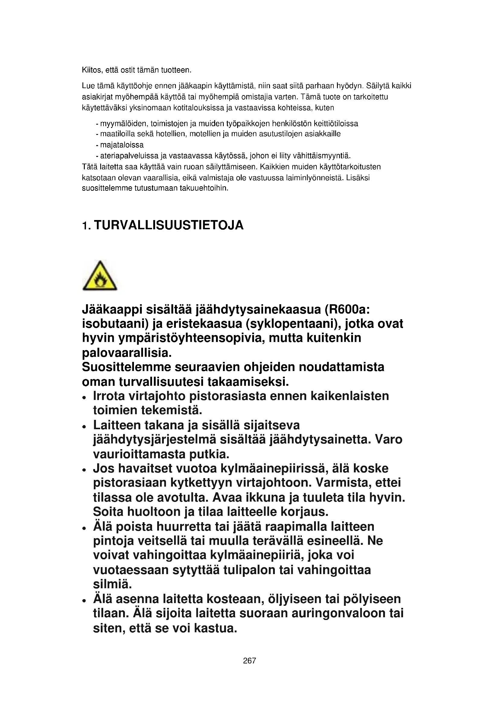 Jääkaappi sisältää jäähdytysainekaasua (R600a: isobutaani) ja eristekaasua (syklopentaani), jotka ovat hyvin ympäristöyhteensopivia, mutta kuitenkin palovaarallisia. Suosittelemme seuraavien ohjeiden noudattamista oman turvallisuutesi takaamiseksi.
