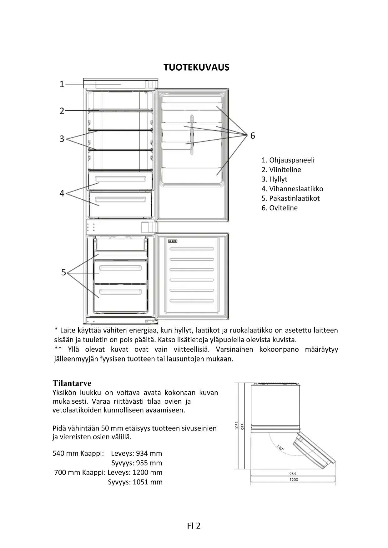 - Laite käyttää vähiten energiaa, kun hyllyt, laatikot ja ruokalaatikko on asetettu laitteen sisään ja tuuletin on pois päältä. Katso lisätietoja yläpuolella olevista kuvista. ** Yllä olevat kuvat ovat vain viitteellisiä. Varsinainen kokoonpano määräytyy jälleenmyyjän fyysisen tuotteen tai lausuntojen mukaan.Tilantarve Yksikön luukku on voitava avata kokonaan kuvan mukaisesti. Varaa riittävästi tilaa ovien ja vetolaatikoiden kunnolliseen avaamiseen. Pidä vähintään 50 mm etäisyys tuotteen sivuseinien ja viereisten osien välillä.