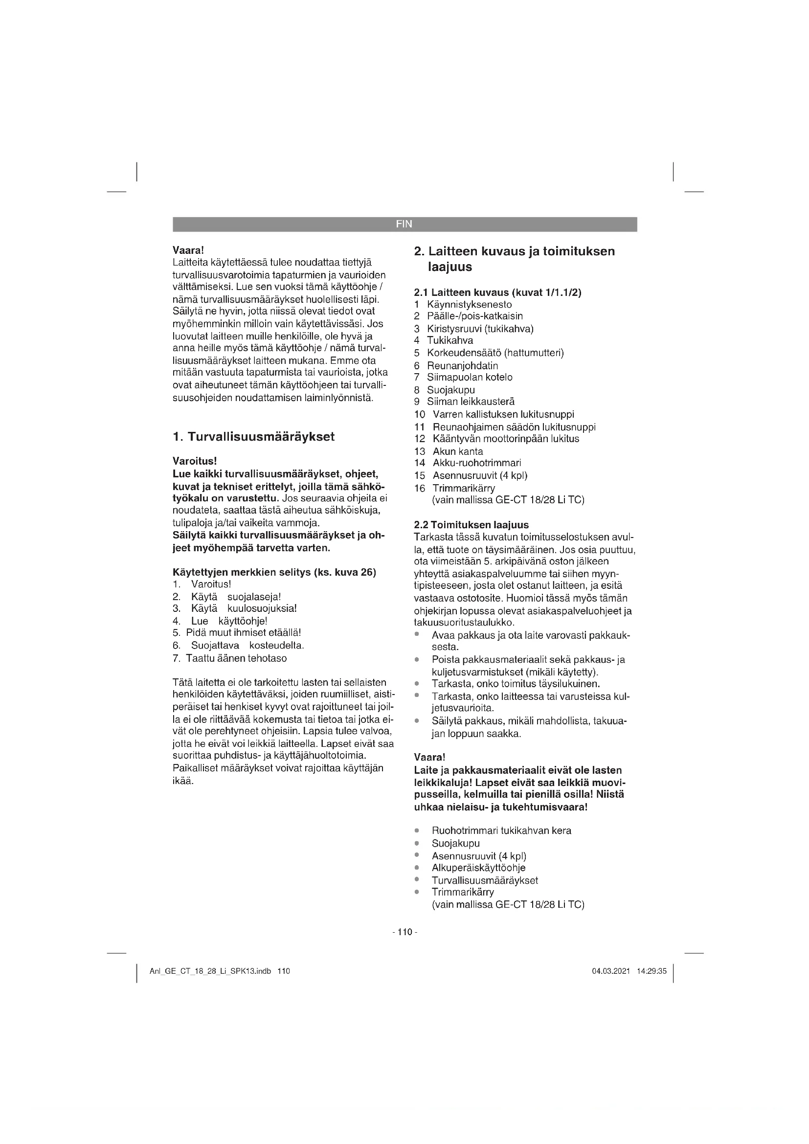 Paino ...................................... 3,0 kg / 5,8 kg (TC) Trimmarikärry (vain mallissa GE-CT 18/28 Li TC) Leikkauskorkeuden säätö 35/ 55 mm; 2-portainen Huomio! Laite toimitetaan ilman akkuja ja latauslaitetta ja sitä saa käyttää ainoastaan Power X-Change -sarjan litiumi-ioniakkujen kera! Power X-Change -sarjan litiumi-ioniakut saa lada- ta vain Power X-Charger -latauslaitteella. Koneen melunpäästö saattaa ylittää arvon 85 dB(A). Tässä tapauksessa tarvitaan käyttäjää koskevia meluntorjuntatoimenpiteitä. Melunpääs- töt on mitattu standardien EN ISO 11201: 2010 ja EN ISO 3744: 2010 mukaisesti. Kahvasta lähte- vän tärinän arvo on mitattu standardin EN 28662- 1: 1992 mukaisesti. Annettu tärinäarvo on mitattu standardisoidulla koestusmenetelmällä ja sitä voidaan käyttää erilaisten tuotteiden vertailemiseen keskenään. Lisäksi tätä arvoa voidaan käyttää arvioimaan en- nakolta käyttäjään kohdistuvat tärinärasitukset. Varo! Siitä riippuen, miten laitetta käytetään, sen todel- liset tärinäarvot voivat poiketa annetuista arvois- ta! Ryhdy suojatoimenpiteisiin tärinärasituksia vastaan! Huomioi tässä koko työjakso, siis myös ajankohdat, jolloin laite käy kuormittamattomana tai on sammutettu! Soveliaisiin toimenpiteisiin ku- uluvat muun muassa laitteen sekä siihen liitettävi- en työkalujen säännöllinen huolto ja hoito, käsien lämpimänä pitäminen, säännölliset tauot sekä työnkulun hyvä suunnittelu! Rajoita melunpäästöt ja tärinä mahdollisim- man vähäisiksi!