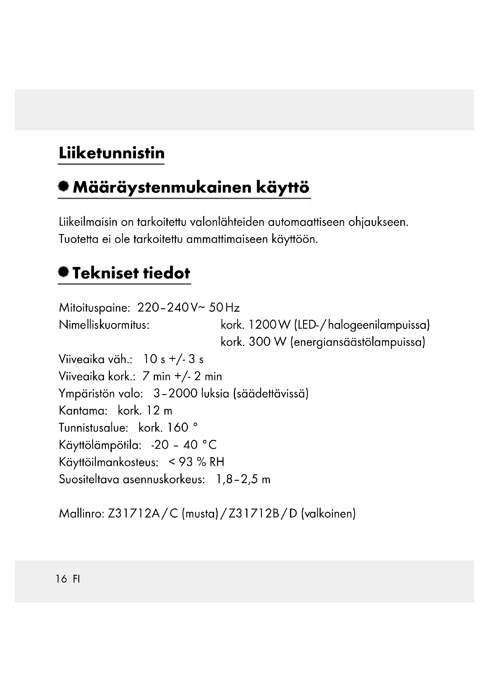 voi vahingoittua. Puhdista tuote kuivalla nukattomalla liinalla.23 FI Hävittäminen Pakkaus on valmistettu ympäristöystävällisistä materiaaleista, jotka voidaan hävittää paikallisen kierrätyspisteen kautta. Kysy lisätietoja käytöstä poistetun tuotteen hävittämisestä kunnan- / kaupunginvirastosta. Älä heitä käytettyä tuotetta talousjätteisiin. Toimi ympäristöys- tävällisesti toimittamalla tuote ongelmajätteiden keräyspistee- seen. Lisätietoja kierrätyspisteistä ja niiden aukioloajoista saat kuntasi viranomaisilta. Takuu Laite on valmistettu huolellisesti tiukkojen laatudirektiivien mukaan ja tarkistettu huolella ennen toimitusta. Jos tuote on virheellinen, sinulla on ostajana lakisääteiset oikeudet esittää vaatimuksia tuotteen myyjää koh- taan. Seuraavassa esitetty takuu ei rajoita lakisääteisiä oikeuksiasi. Laitteelle myönnetty takuu on voimassa 3 vuotta ostopäivästä lukien. Ta- kuun voimassaolo alkaa tuotteen ostopäivästä. Säilytä aina alkuperäinen kassakuitti. Se toimii todisteena tehdystä ostoksesta.24 FI Jos kolmen vuoden sisällä tuotteen ostopäivästä alkaen tuotteesta löytyy materiaali- tai valmistusvirhe, korjaamme tuotteen ilmaiseksi tai toimi- tamme tilalle uuden tuotteen harkintamme mukaan. Takuu raukeaa, jos tuote on vioittunut asiattoman käytön tai huollon vuoksi. Takuu koskee materiaali- ja valmistusvirheitä. Takuu ei kata tuotteen osia, jotka kuluvat normaalissa käytössä ja siitä syystä pidetään kuluvina osina (esim. paristot) tai vaurioita särkyvissä osissa esim. kytkimessä, akuissa tai lasista valmistetuissa osissa.25 SE Ändamålsenlig användning ........................... Sidan 26 Tekniska data ............................................................... Sidan 26 Leveransomfattning ............................................... Sidan 27 Beskrivning av delarna ...................................... Sidan 27 Säkerhet ............................................................................ Sidan 28 Montering Välj en lämplig plats för installationen ................................ Sidan 30 Installation ............................................................................. Sidan 30 Idrifttagning Inställning av sensorns känslighet ........................................ Sidan 31 Inställning av förbrukarens lystid.......................................... Sidan 32 Inställning av dag- / nattdrift ................................................. Sidan 32 Rengöring och skötsel .......................................... Sidan 32 Avfallshantering ........................................................ Sidan 33 Garanti ................................................................................ Sidan 3326 SE Rörelsedetektor Ändamålsenlig användning Rörelsevakten är till för automatisk styrning av ljuskällor. Denna produkt är ej avsedd för yrkesmässig användning. Tekniska data Märkspänning: 220–240 V∼ 50 Hz Märklast: max. 1200 Watt (med lysdioder/ halogenlampor) max. 300 Watt (med lågenergilampor) Fördröjningstid min.: 10 s +/- 3 s Fördröjningstid max.: 7 min +/- 2 min Omgivnings: 3–2000 lux (inställbart) Räckvidd: max. 12 m Avkänningsområde: max. 160 ° Arbetstemperatur: -20 – 40 °C Luftfuktighet vid drift: < 93 % rF Rekommenderad installationshöjd: 1,8–2,5 m Modell-nr.: Z31712A / C (svart) / Z31712B / D (vit)27 SE Leveransomfattning 1 rörelsevakt 2 skruvar 2 pluggar 1 bruksanvisning Beskrivning av delarna