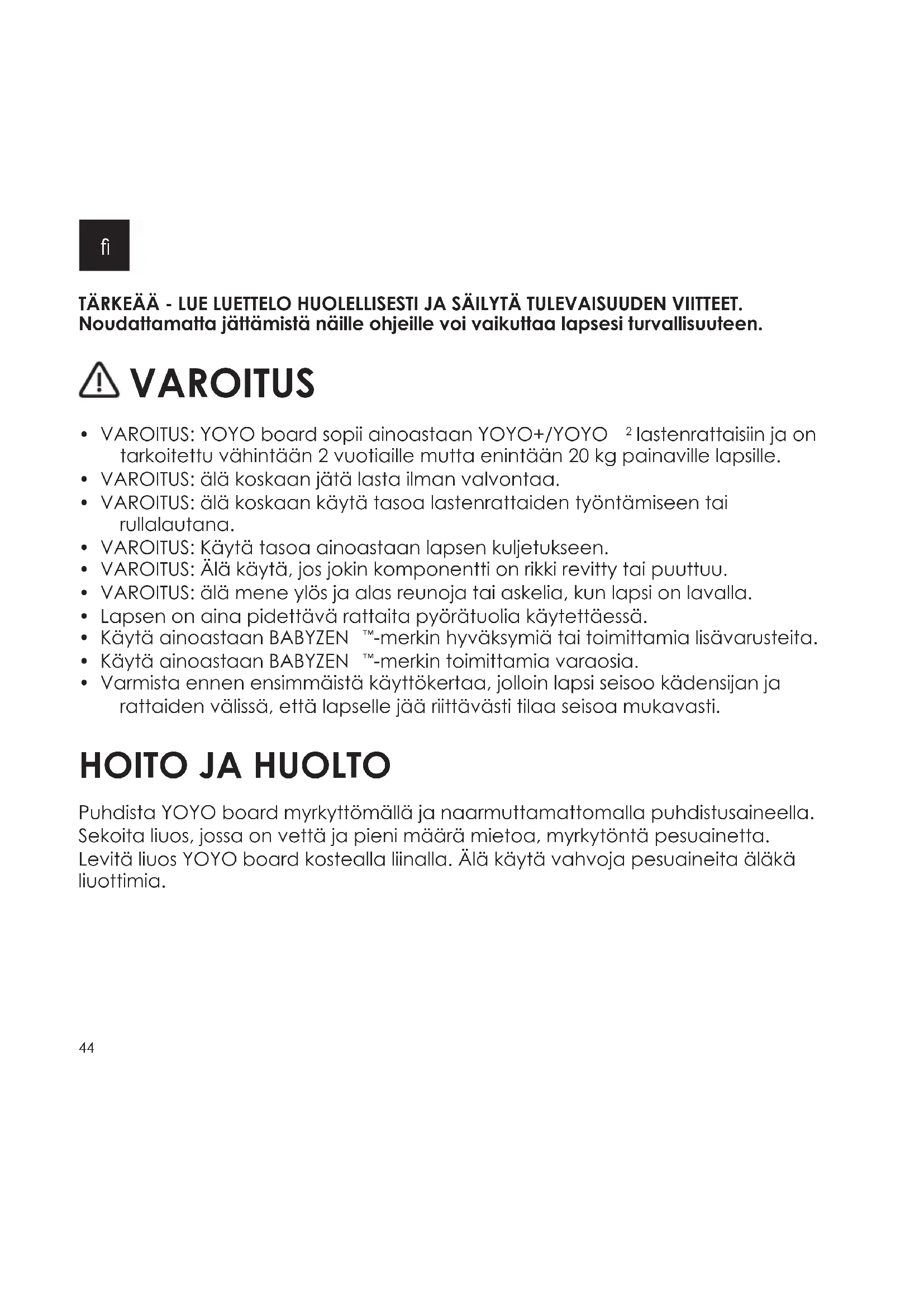Puhdista YOYO board myrkyttömällä ja naarmuttamattomalla puhdistusaineella. Sekoita liuos, jossa on vettä ja pieni määrä mietoa, myrkytöntä pesuainetta. Levitä liuos YOYO board kostealla liinalla. Älä käytä vahvoja pesuaineita äläkä liuottimia. 44fi
