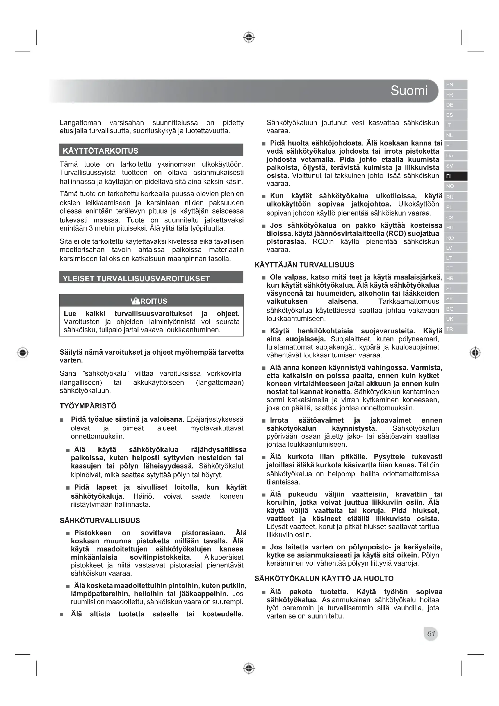 ■ Ole valpas, katso mitä teet ja käytä maalaisjärkeä, kun käytät sähkötyökalua. Älä käytä sähkötyökalua väsyneenä tai huumeiden, alkoholin tai lääkkeiden vaikutuksen alaisena. Tarkkaamattomuus sähkötyökalua käytettäessä saattaa johtaa vakavaan loukkaantumiseen. ■ Käytä henkilökohtaisia suojavarusteita. Käytä aina suojalaseja. Suojalaitteet, kuten pölynaamari, luistamattomat suojakengät, kypärä ja kuulosuojaimet vähentävät loukkaantumisen vaaraa. ■ Älä anna koneen käynnistyä vahingossa. Varmista, että katkaisin on poissa päältä, ennen kuin kytket koneen virtalähteeseen ja/tai akkuun ja ennen kuin nostat tai kannat konetta. Sähkötyökalun kantaminen sormi katkaisimella ja virran kytkeminen koneeseen, joka on päällä, saattaa johtaa onnettomuuksiin. ■ Irrota säätöavaimet ja jakoavaimet ennen sähkötyökalun käynnistystä. Sähkötyökalun pyörivään osaan jätetty jako- tai säätöavain saattaa johtaa loukkaantumiseen. ■ Älä kurkota liian pitkälle. Pysyttele tukevasti jaloillasi äläkä kurkota käsivartta liian kauas. Tällöin sähkötyökalua on helpompi hallita odottamattomissa tilanteissa. ■ Älä pukeudu väljiin vaatteisiin, kravattiin tai koruihin, jotka voivat juuttua liikkuviin osiin. Älä käytä väljiä vaatteita tai koruja. Pidä hiukset, vaatteet ja käsineet etäällä liikkuvista osista. Löysät vaatteet, korut ja pitkät hiukset saattavat tarttua liikkuviin osiin. ■ Jos laitetta varten on pölynpoisto- ja keräyslaite, kytke se asianmukaisesti ja käytä sitä oikein. Pölyn kerääminen voi vähentää pölyyn liittyviä vaaroja. SÄHKÖTYÖKALUN KÄYTTÖ JA HUOLTO ■ Älä pakota tuotetta. Käytä työhön sopivaa sähkötyökalua. Asianmukainen sähkötyökalu hoitaa työt paremmin ja turvallisemmin sillä vauhdilla, jota varten se on suunniteltu.Suomi