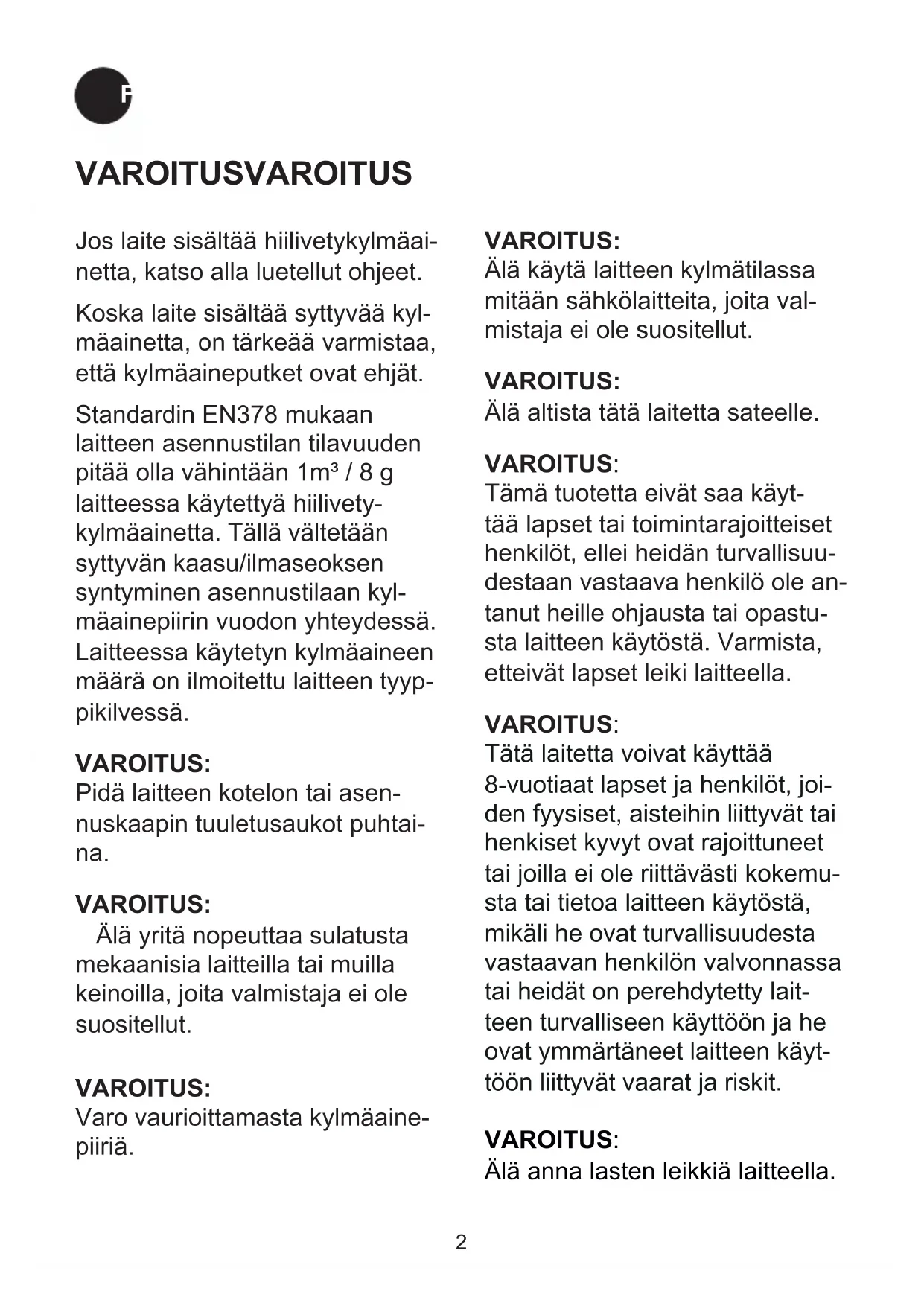 - DEFI Tekniset tiedot Laite täyttää sovellettavien EU-direktiivien vaatimukset ml pienjännitedirektiivi 2006/95/ ETY ja EMC-direktiivi 2004/108/ETY. Tyyppikilvessä on kerrottu erilaisia teknisiä tietoja sekä tyyppi ja valmistenumero. Pistorasiaan tulee päästä hyvin käsiksi. Liitä laite 220/240 V / 50Hz via en vaihto- virtaan ainoastaan määräysten mukaisesti asennetun pistorasian kautta. Pistorasia tulee suojata 10 A Tai suurempi Laitteissa, joita käytetään Euroopan ulko- puolisissa maissa, on tarkistettava tyyppi- kilvestä, onko sähköverkon liitäntäjännite ja virtalaji sama kuin laitteessa. Tyyppikilpi on sijoitettu kylmälaitteen vasempaan alalai- taan. Jännite ja teho / energia on ilmoitettu tyyppikilvessä Jos verkkoliitäntäjohto on vaihdettava, sen saa tehdä vain valtuutettu sähköasentaja. Sisältö VAROITUS p. 2