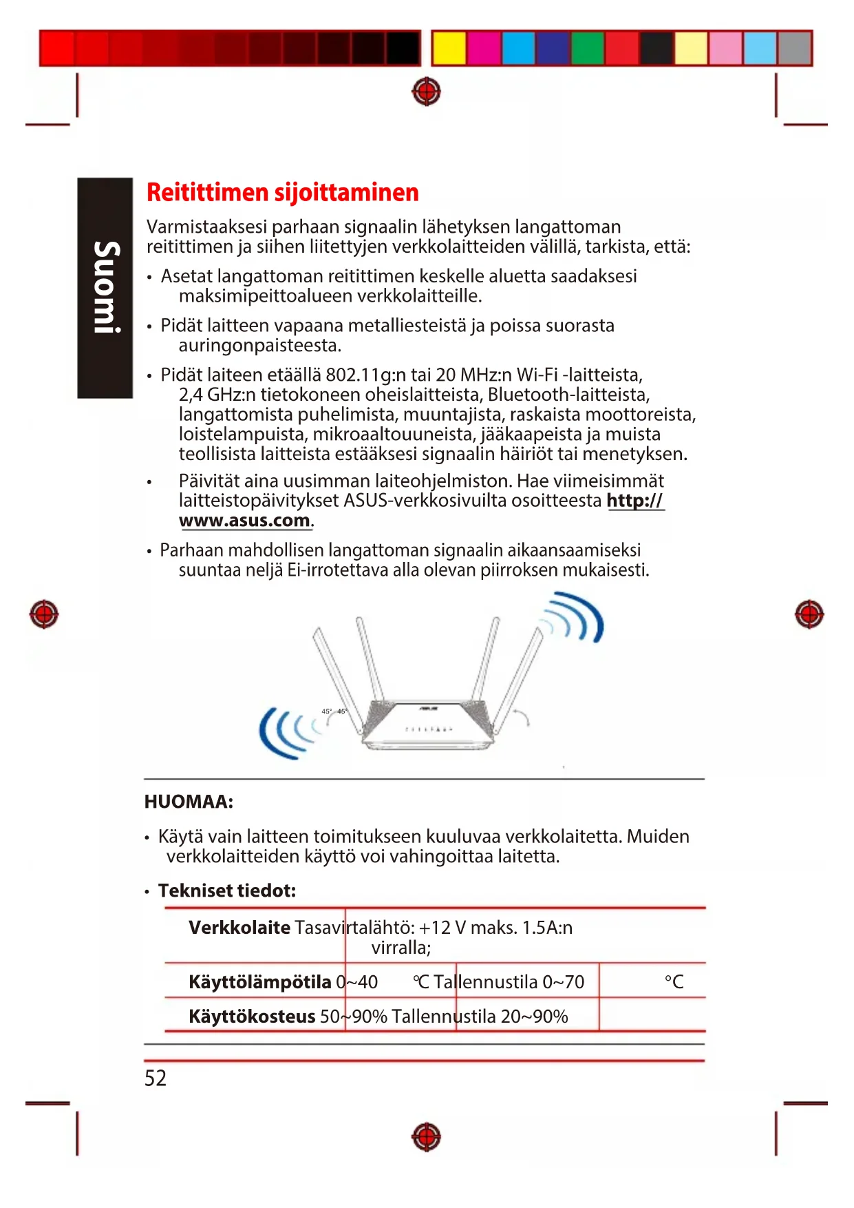 Suomi Reitittimen sijoittaminen Reitittimen sijoittaminen Varmistaaksesi parhaan signaalin lähetyksen langattoman reitittimen ja siihen liitettyjen verkkolaitteiden välillä, tarkista, että: