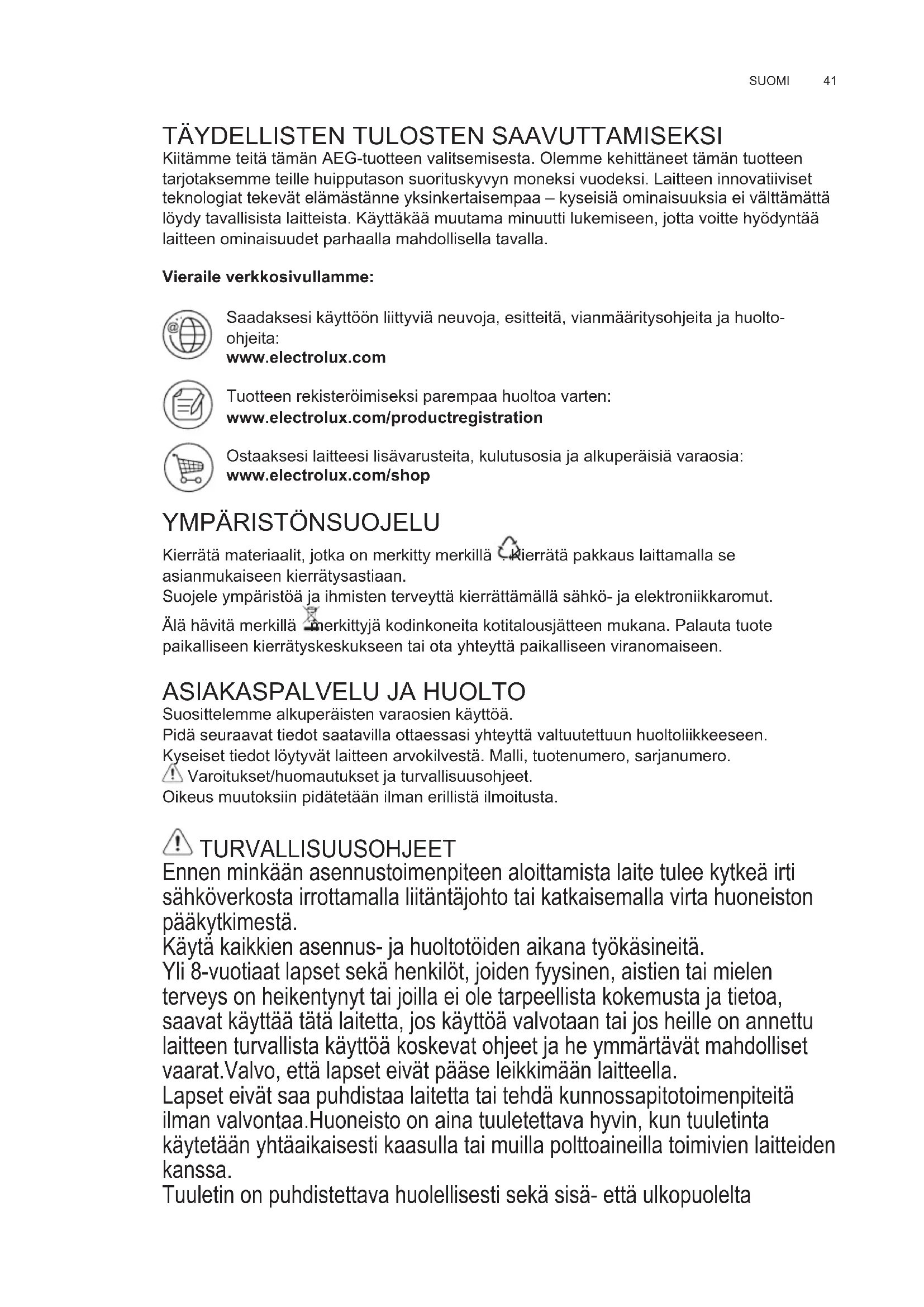 Kiitämme teitä tämän AEG-tuotteen valitsemisesta. Olemme kehittäneet tämän tuotteen tarjotaksemme teille huipputason suorituskyvyn moneksi vuodeksi Laitteen innovatiiviset teknologiat tekevät elämästänne yksinkertaisempaa – kyseisiä ominaisuuksia ei välttämättä löydy tavallisista laitteista. Käyttäkää muutama minuutti lukemiseen, jotta voitte hyödyntää laitteen ominaisuudet parhaalla mahdollisella tavalla Vieraile verkkosivullamme: Saadaksesi käyttöön liittyviä neuvoja, esitteitä, vianmääritysohjeita ja huolto- ohjeita: www.electrolux.com Tuotteen rekisteröimiseksi parempaa huoltoa varten: www.electrolux.com/productregistration Ostaaksesi laitteesi lisävarusteita, kulutusosia ja alkuperäisiä varaosia: www.electrolux.com/shop