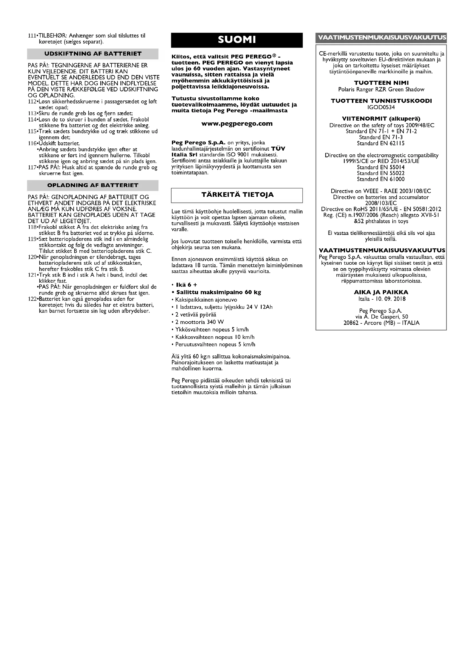 Italia - 10. 09. 2018 Peg Perego S.p.A. via A. De Gasperi, 50 20862 - Arcore (MB) – ITALIA VAATIMUSTENMUKAISUUSVAKUUTUS Lue tämä käyttöohje huolellisesti, jotta tutustut mallin käyttöön ja voit opettaa lapsen ajamaan oikein, turvallisesti ja mukavasti. Säilytä käyttöohje vastaisen varalle. Jos luovutat tuotteen toiselle henkilölle, varmista että ohjekirja seuraa sen mukana. Ennen ajoneuvon ensimmäistä käyttöä akkua on ladattava 18 tuntia. Tämän menettelyn laiminlyöminen saattaa aiheuttaa akulle pysyviä vaurioita.