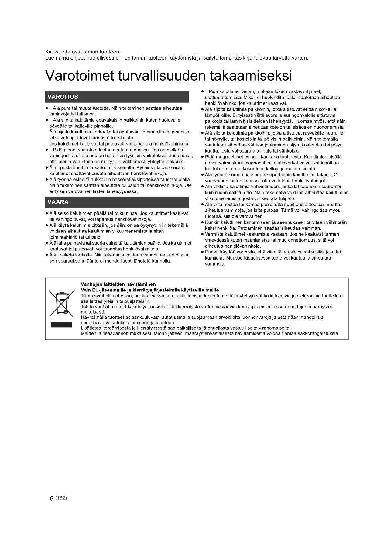 Variationsvidd för luftfuktighet vid drift 20 % till 80 % RH (ingen kondensbildning) (131) SB-G90M2_TQBM0786_E_mst.book 19 ページ 2021年8月3日 火曜日 午後2時40分6 Kiitos, että ostit tämän tuotteen. Lue nämä ohjeet huolellisesti ennen tämän tuotteen käyttämistä ja säilytä tämä käsikirja tulevaa tarvetta varten. Varotoimet turvallisuuden takaamiseksi ≥ Älä pura tai muuta tuotetta. Näin tekeminen saattaa aiheuttaa vahinkoja tai tulipalon. ≥ Älä sijoita kaiuttimia epävakaisiin paikkoihin kuten huojuvalle pöydälle tai kalteville pinnoille. Älä sijoita kaiuttimia korkealle tai epätasaisille pinnoille tai pinnoille, jotka vahingoittuvat tärinästä tai iskuista. Jos kaiuttimet kaatuvat tai putoavat, voi tapahtua henkilövahinkoja. ≥ Pidä pienet varusteet lasten ulottumattomissa. Jos ne niellään vahingossa, siitä aiheutuu haitallisia fyysisiä vaikutuksia. Jos epäilet, että pieniä varusteita on nielty, ota välittömästi yhteyttä lääkäriin. ≥ Älä ripusta kaiuttimia kattoon tai seinälle. Kyseissä tapauksessa kaiuttimet saattavat pudota aiheuttaen henkilövahinkoja. ≥ Älä työnnä esineitä aukkoihin bassorefleksiporteissa taustapuolella. Näin tekeminen saattaa aiheuttaa tulipalon tai henkilövahinkoja. Ole erityisen varovainen lasten läheisyydessä. ≥ Älä seiso kaiuttimien päällä tai roiku niistä. Jos kaiuttimet kaatuvat tai vahingoittuvat, voi tapahtua henkilövahinkoja. ≥ Älä käytä kaiuttimia pitkään, jos ääni on säröytynyt. Niin tekemällä voidaan aiheuttaa kaiuttimien ylikuumenemista ja siten toimintahäiriö tai tulipalo. ≥ Älä laita painavia tai suuria esineitä kaiuttimien päälle. Jos kaiuttimet kaatuvat tai putoavat, voi tapahtua henkilövahinkoja. ≥ Älä kosketa kartioita. Niin tekemällä voidaan vaurioittaa kartioita ja sen seurauksena ääntä ei mahdollisesti lähetetä kunnolla. ≥ Pidä kaiuttimet lasten, mukaan lukien vastasyntyneet, ulottumattomissa. Mikäli ei huolehdita tästä, saatetaan aiheuttaa henkilövahinko, jos kaiuttimet kaatuvat. ≥ Älä sijoita kaiuttimia paikkoihin, jotka altistuvat erittäin korkeille lämpötiloille. Erityisesti vältä suoralle auringonvalolle altistuvia paikkoja tai lämmityslaitteiden läheisyyttä. Huomaa myös, että näin tekemällä saatetaan aiheuttaa kotelon tai sisäosien huononemista. ≥ Älä sijoita kaiuttimia paikkoihin, jotka altistuvat rasvaisille huuruille tai höyrylle, tai kosteisiin tai pölyisiin paikkoihin. Näin tekemällä saatetaan aiheuttaa sähkön johtuminen öljyn, kosteuden tai pölyn kautta, josta voi seurata tulipalo tai sähköisku. ≥ Pidä magneettiset esineet kaukana tuotteesta. Kaiuttimien sisällä olevat voimakkaat magneetit ja kaiutinverkot voivat vahingoittaa luottokortteja, matkakortteja, kelloja ja muita esineitä. ≥ Älä työnnä sormia bassorefleksiportteihin kaiuttimien takana. Ole varovainen lasten kanssa, jotta vältetään henkilövahingot. ≥ Älä yhdistä kaiuttimia vahvistimeen, jonka lähtöteho on suurempi kuin niiden sallittu otto. Näin tekemällä voidaan aiheuttaa kaiuttimien ylikuumenemista, josta voi seurata tulipalo. ≥ Älä yritä nostaa tai kantaa päälaitetta nupit päälaitteessa. Saattaa aiheutua vammoja, jos laite putoaa. Tämä voi vahingoittaa myös tuotetta, siis ole varovainen. ≥ Kunkin kaiuttimen kantamiseen ja asennukseen tarvitaan vähintään kaksi henkilöä. Putoaminen saattaa aiheuttaa vamman. ≥ Varmista kaiuttimet kaatumista vastaan. Jos ne kaatuvat turman yhteydessä kuten maanjäristys tai muu onnettomuus, siitä voi aiheutua henkilövahinkoja. ≥ Ennen käyttöä varmista, että kiinnität aluslevyt sekä piikkijalat tai kumijalat. Muussa tapauksessa tuote voi kaatua ja aiheuttaa vammoja. VAROITUS VAARA Vanhojen laitteiden hävittäminen Vain EU-jäsenmaille ja kierrätysjärjestelmää käyttäville maille Tämä symboli tuotteissa, pakkauksessa ja/tai asiakirjoissa tarkoittaa, että käytettyjä sähköllä toimivia ja elektronisia tuotteita ei saa laittaa yleisiin talousjätteisiin. Johda vanhat tuotteet käsittelyä, uusiointia tai kierrätystä varten vastaaviin keräyspisteisiin laissa annettujen määräysten mukaisesti. Hävittämällä tuotteet asiaankuuluvasti autat samalla suojaamaan arvokkaita luonnonvaroja ja estämään mahdollisia negatiivisia vaikutuksia ihmiseen ja luontoon. Lisätietoa keräämisestä ja kierrätyksestä saa paikalliselta jätehuollosta vastuulliselta viranomaiselta. Maiden lainsäädännön mukaisesti tämän jätteen määräystenvastaisesta hävittämisestä voidaan antaa sakkorangaistuksia. (132) SB-G90M2_TQBM0786_E_mst.book 6 ページ 2021年8月3日 火曜日 午後2時40分Suomi