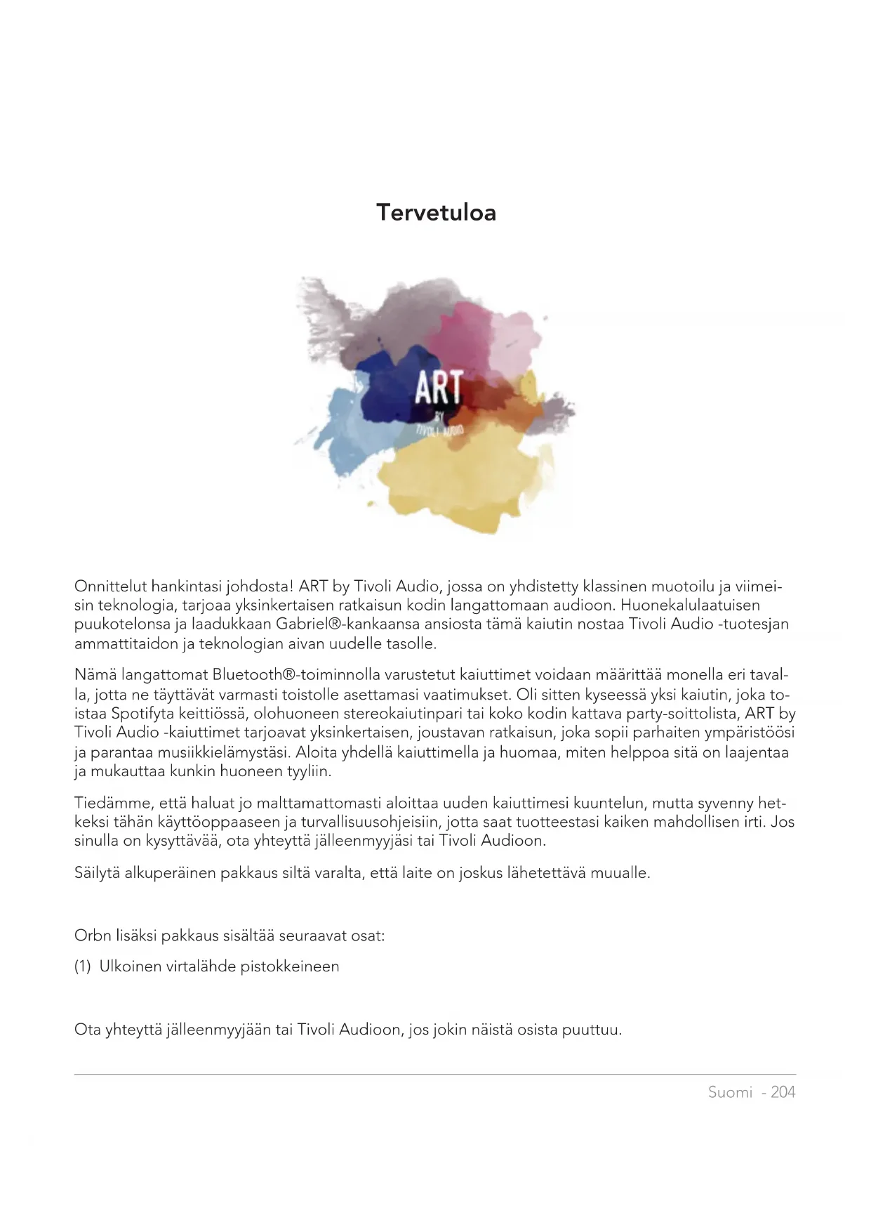 - Usein kysytyt kysymykset Suomi - 204 Tervetuloa Onnittelut hankintasi johdosta! ART by Tivoli Audio, jossa on yhdistetty klassinen muotoilu ja viimei- sin teknologia, tarjoaa yksinkertaisen ratkaisun kodin langattomaan audioon. Huonekalulaatuisen puukotelonsa ja laadukkaan Gabriel®-kankaansa ansiosta tämä kaiutin nostaa Tivoli Audio -tuotesjan ammattitaidon ja teknologian aivan uudelle tasolle. Nämä langattomat Bluetooth®-toiminnolla varustetut kaiuttimet voidaan määrittää monella eri taval- la, jotta ne täyttävät varmasti toistolle asettamasi vaatimukset. Oli sitten kyseessä yksi kaiutin, joka to- istaa Spotifyta keittiössä, olohuoneen stereokaiutinpari tai koko kodin kattava party-soittolista, ART by Tivoli Audio -kaiuttimet tarjoavat yksinkertaisen, joustavan ratkaisun, joka sopii parhaiten ympäristöösi ja parantaa musiikkielämystäsi. Aloita yhdellä kaiuttimella ja huomaa, miten helppoa sitä on laajentaa ja mukauttaa kunkin huoneen tyyliin. Tiedämme, että haluat jo malttamattomasti aloittaa uuden kaiuttimesi kuuntelun, mutta syvenny het- keksi tähän käyttöoppaaseen ja turvallisuusohjeisiin, jotta saat tuotteestasi kaiken mahdollisen irti. Jos sinulla on kysyttävää, ota yhteyttä jälleenmyyjäsi tai Tivoli Audioon. Säilytä alkuperäinen pakkaus siltä varalta, että laite on joskus lähetettävä muualle. Orbn lisäksi pakkaus sisältää seuraavat osat: (1) Ulkoinen virtalähde pistokkeineen Ota yhteyttä jälleenmyyjään tai Tivoli Audioon, jos jokin näistä osista puuttuu.Suomi - 205 Toimintojen yleiskuvaus Etupaneeli Tivoli Audio -logo: Kapasitiivinen hipaisukytkin puupinnan alla. Langattomassa tilassa se käynnistää tai keskeyttää musiikin toiston. Bluetooth-tilassa se vaimentaa kaiuttimen. Toimintojen yleiskuvausSuomi - 206 Alaosa A. VIRTAPAINIKE: Kytke laite päälle virtapainiketta painamalla. Kytke laite pois päältä pitämällä painiketta alhaalla. B. SETUP (asetus): Liitä kaiutin kotiverkkoosi tätä painiketta painamalla. C. ADD/DROP (lisää/poista): Jos kaiutin on liitetty ryhmään, voit poistaa sen ryhmästä pitämällä tätä painiketta alaspainettuna. Jos kaiutinta ei ole liitetty ryhmään, tätä painiketta painamalla voit liittää sen seuraavaan mahdolliseen ryhmään. Löydät tarkempia tietoja tämän käyttöoppaan kappaleesta “LISÄÄ/POISTA-painike”. D. PARTY MODE: Pitämällä Party Mode -painiketta alaspainettuna lähetät tämän kaiuttimen musiikin kaikkiin liitettyihin kaiuttimiin. Löydät tarkempia tietoja tämän käyttöoppaan kappaleesta “PARTY MODE”. E. SOURCE: Tätä painiketta napauttamalla voit vaihtaa audiolähdettä. Audiolähde ilmaistaan LED-valon värillä. Bluetooth-tilassa voit käynnistää laiteparin muodostamistilan pitämällä painiket- ta alhaalla yhden sekunnin ajan, jos LED-valo jo vilkkuu. Jos LED-valo palaa, pidä painiketta alhaal- la, kunnes se alkaa vilkkua. Vihreä LED-valo – langaton tila Sininen LED-valo – Bluetooth-tila Violetti LED-valo – Lisälaitetila F. VOLUME - (äänenvoimakkuus miinus): Vähennä äänenvoimakkuutta painiketta painamalla. G. VOLUME + (äänenvoimakkuus plus): Lisää äänenvoimakkuutta painiketta painamalla. H. DC-tulo: Yhdistä Tivoli-verkkolaite tähän porttiin akun latausta tai kaiuttimen virransyöttöä varten. Käytä vain tämän tuotteen mukana toimitettua verkkolaitetta. p. 226
