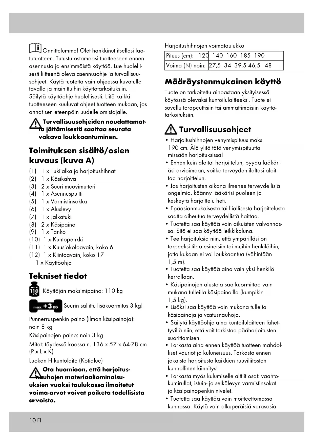 Käyttäjän maksimipaino: 110 kg Suurin sallittu lisäkuormitus 3 kg! Punnerruspenkin paino (ilman käsipainoja): noin 8 kg Käsipainojen paino: noin 3 kg Mitat: täydessä koossa n. 136 x 57 x 64-78 cm (P x L x K) Luokan H kuntolaite (Kotialue) Ota huomioon, että harjoitus- nauhojen materiaaliominaisu- uksien vuoksi taulukossa ilmoitetut voima-arvot voivat poiketa todellisista arvoista. Harjoitushihnojen voimataulukko Pituus (cm): 120 140 160 185 190 Voima (N) noin: 27,5 34 39,5 46,5 48 Määräystenmukainen käyttö Tuote on tarkoitettu ainoastaan yksityisessä käytössä olevaksi kuntoilulaitteeksi. Tuote ei sovellu terapeuttisiin tai ammattimaisiin käyttö- tarkoituksiin. Turvallisuusohjeet