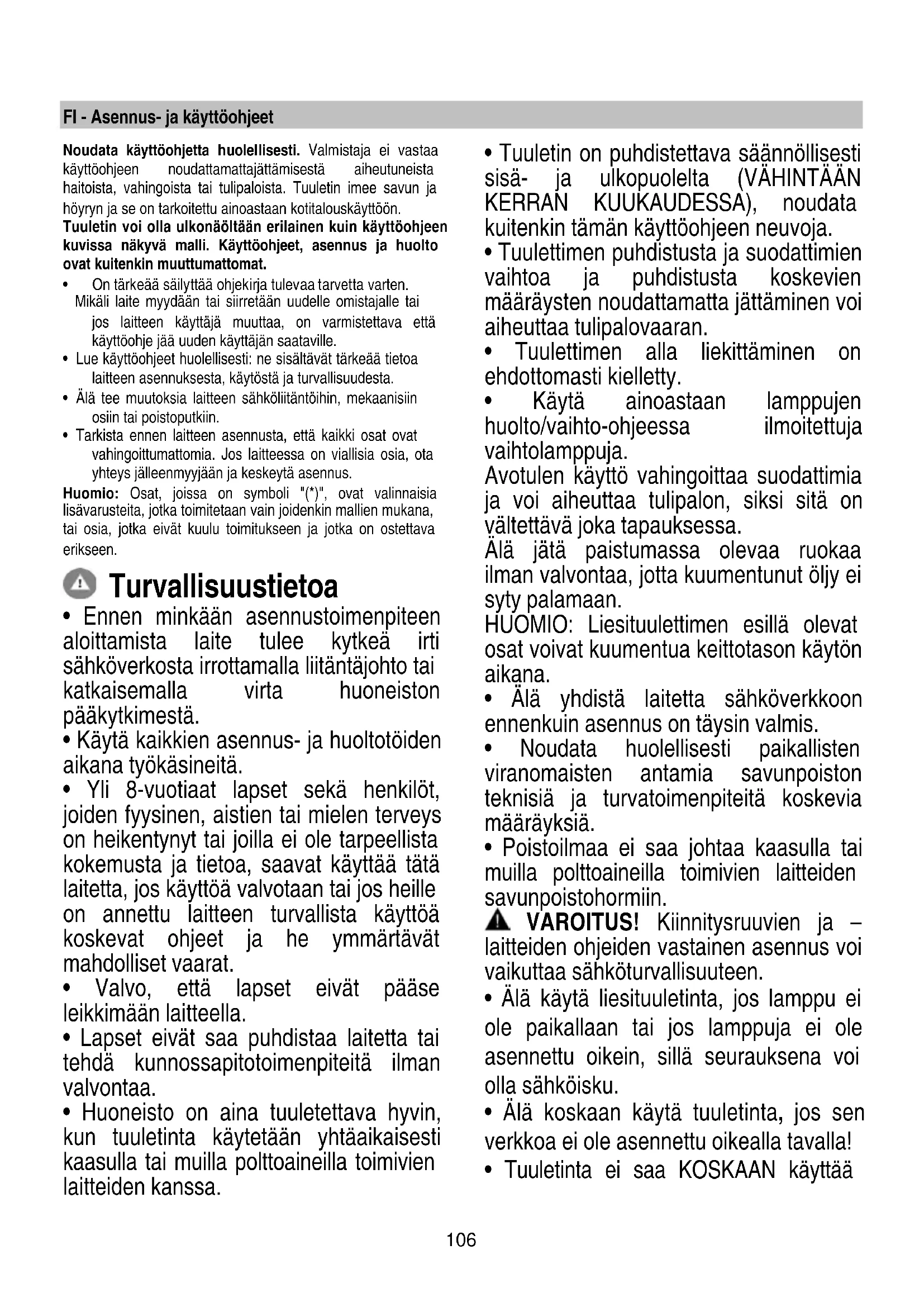 - Huoneisto on aina tuuletettava hyvin, kun tuuletinta käytetään yhtäaikaisesti kaasulla tai muilla polttoaineilla toimivien laitteiden kanssa.