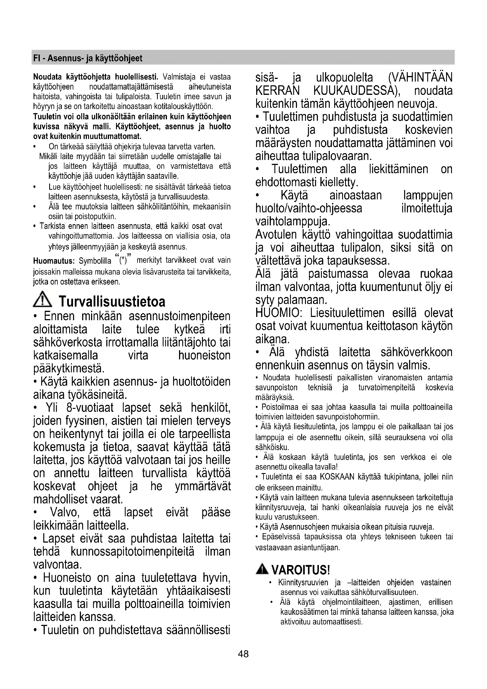 - Tuulettimen puhdistusta ja suodattimien vaihtoa ja puhdistusta koskevien määräysten noudattamatta jättäminen voi aiheuttaa tulipalovaaran.