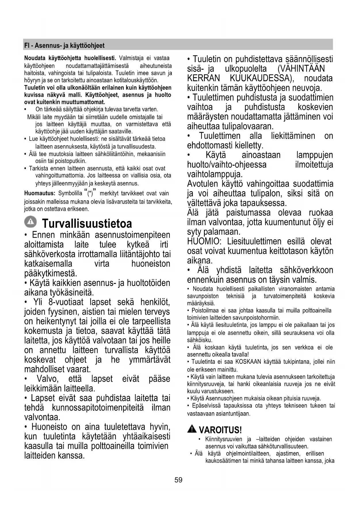 - Tuulettimen puhdistusta ja suodattimien vaihtoa ja puhdistusta koskevien määräysten noudattamatta jättäminen voi aiheuttaa tulipalovaaran.