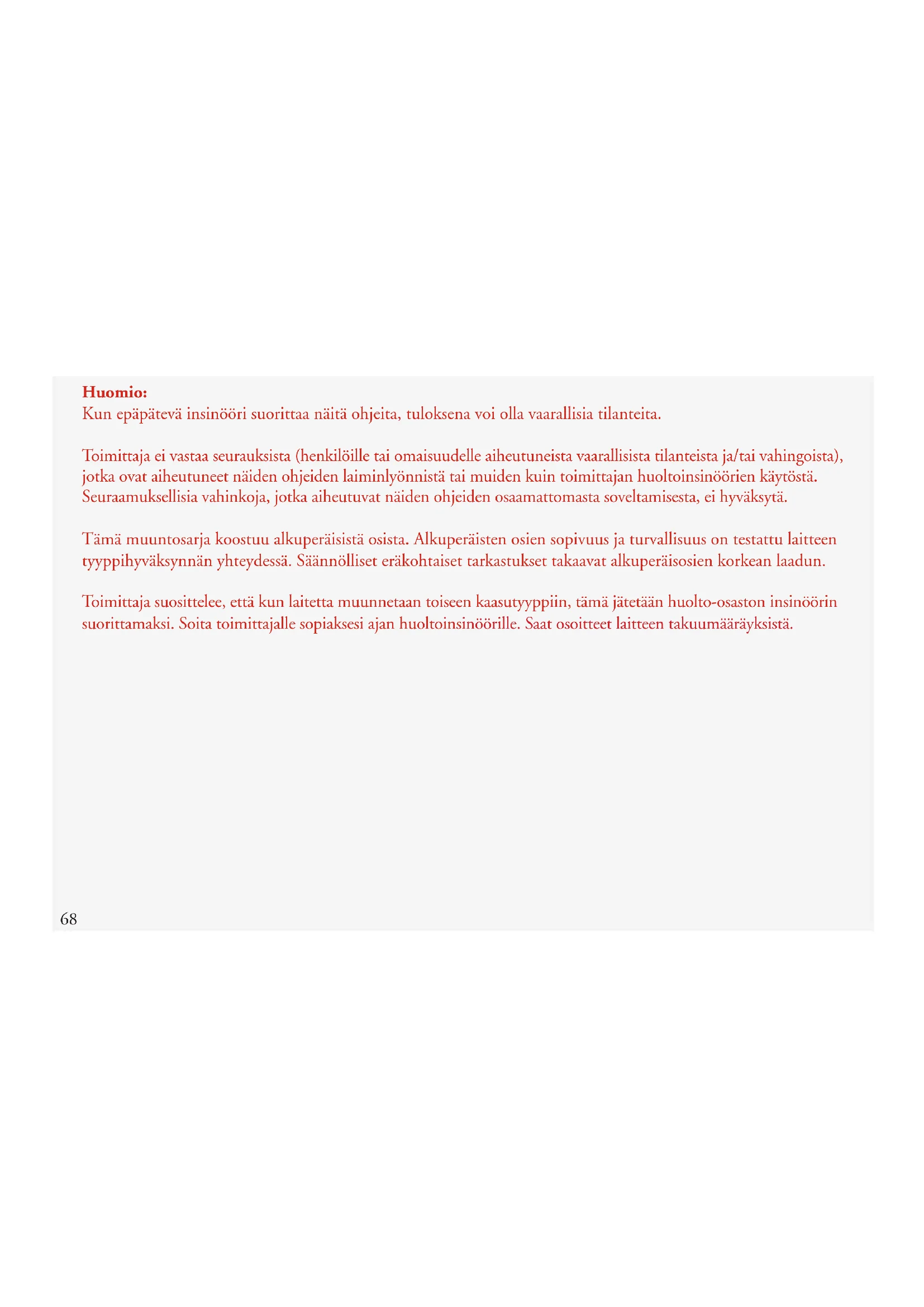Huomio: Kun epäpätevä insinööri suorittaa näitä ohjeita, tuloksena voi olla vaarallisia tilanteita. Toimittaja ei vastaa seurauksista (henkilöille tai omaisuudelle aiheutuneista vaarallisista tilanteista ja/tai vahingoista), jotka ovat aiheutuneet näiden ohjeiden laiminlyönnistä tai muiden kuin toimittajan huoltoinsinöörien käytöstä. Seuraamuksellisia vahinkoja, jotka aiheutuvat näiden ohjeiden osaamattomasta soveltamisesta, ei hyväksytä. Tämä muuntosarja koostuu alkuperäisistä osista. Alkuperäisten osien sopivuus ja turvallisuus on testattu laitteen tyyppihyväksynnän yhteydessä. Säännölliset eräkohtaiset tarkastukset takaavat alkuperäisosien korkean laadun. Toimittaja suosittelee, että kun laitetta muunnetaan toiseen kaasutyyppiin, tämä jätetään huolto-osaston insinöörin suorittamaksi. Soita toimittajalle sopiaksesi ajan huoltoinsinöörille. Saat osoitteet laitteen takuumääräyksistä.69