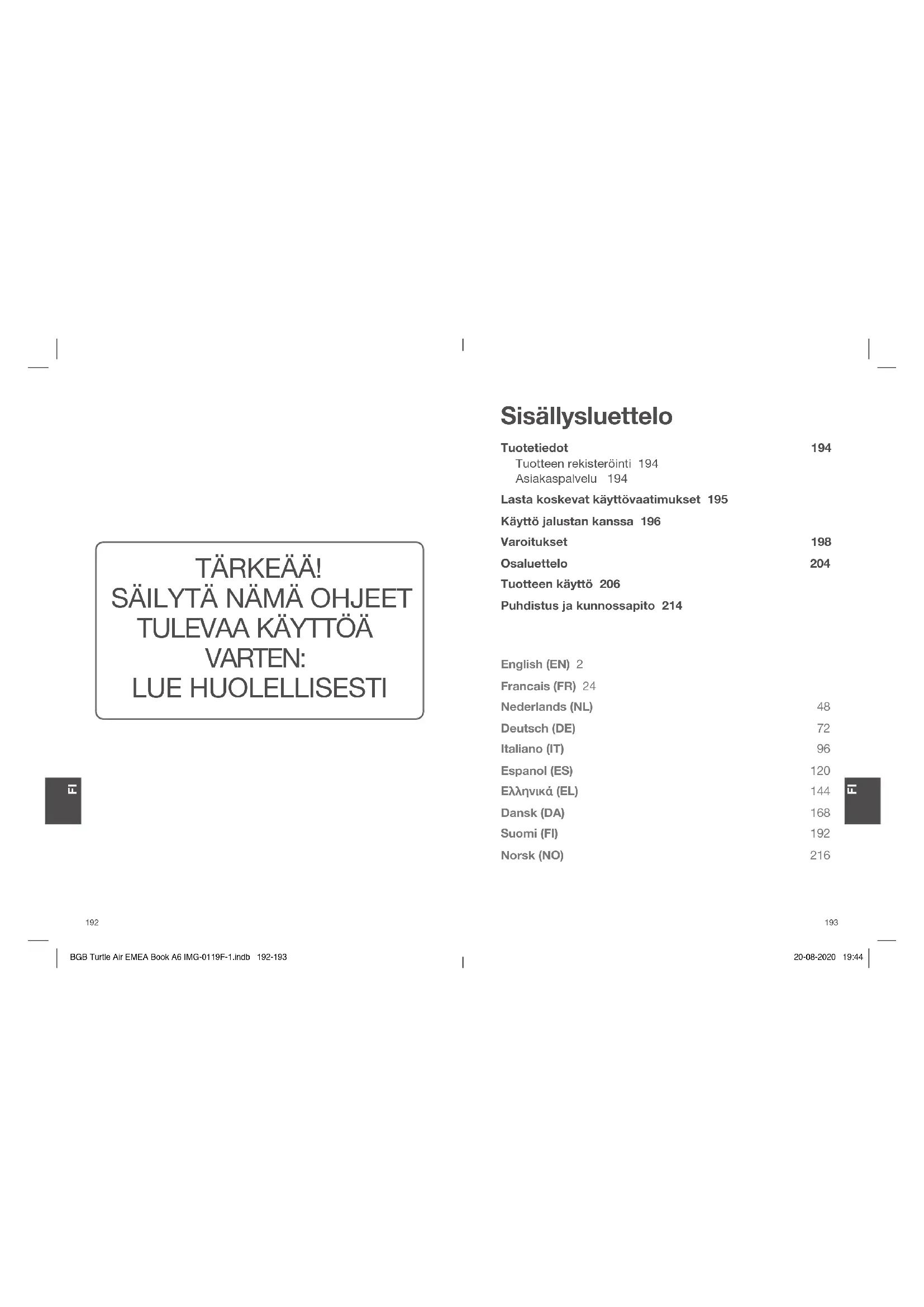 BGB Turtle Air EMEA Book A6 IMG-0119F-1.indb 198-199BGB Turtle Air EMEA Book A6 IMG-0119F-1.indb 198-199 20-08-2020 19:4420-08-2020 19:44ÄLÄ käytä selkä menosuuntaan asennettua tehostettua lasten turvajärjestelmää istuinpaikoissa, joihin on asennettu aktiivinen etuturvatyyny. Kuolema tai vakava henkilövahinko voi esiintyä. Lue auton käyttöoppaasta lisätietoja. ÄLÄ aseta mitään esineitä tukijalan alueelle jalustan eteen. ÄLÄ käytä muita kuormaa kantavia liitoskohtia kuin niitä, jotka on kuvattu ohjeissa ja merkitty tehostettuun lasten turvajärjestelmään. ÄLÄ jatka tämän tehostetun lasten turvajärjestelmän käyttöä minkäänlaisen törmäyksen, edes pienen, jälkeen. Vaihda välittömästi uuteen, koska siinä voi olla törmäyksen aiheuttamia näkymättömiä ja rakenteellisia vaurioita. ÄLÄ asenna tätä tehostettua lasten turvajärjestelmää noudattamatta tämän käyttöoppaan ohjeita tai voit altistaa lapsen vakavalle henkilövahingon tai kuoleman riskille. ÄLÄ tee muokkauksia tähän tehostettuun lasten turvajärjestelmään tai käytä sitä yhdessä muiden valmistajien osien kanssa. ÄLÄ käytä tehostettua lasten turvajärjestelmää ilman pehmusteita. ÄLÄ käytä tätä tehostettua lasten turvajärjestelmää, jos se on vaurioitunut tai siitä puuttuu osia. Tämän tehostetun lasten turvajärjestelmän osia ei saa voidella millään tavalla. Irrota tämä turvakaukalomoduuli ja jalusta auton istuimelta, kun sitä ei käytetä säännöllisesti. Kiinnitä lapsi AINA tehostettuun lasten turvajärjestelmään, myös lyhyillä matkoilla, koska silloin tapahtuu eniten onnettomuuksia. ÄLÄ KOSKAAN jätä lasta yksin valvomatta tähän tehostettuun lasten turvajärjestelmään. ÄLÄ KOSKAAN käytä käytettyä tehostettua lasten turvajärjestelmää tai tehostettua lasten turvajärjestelmää, jonka historiaa et tunne, koska siinä voi olla rakenteellisia vaurioita, jotka vaarantavat lapsesi turvallisuuden. ÄLÄ KOSKAAN käytä köysiä tai muita korvaavia kiinnitysmenetelmiä tehostetun lasten turvajärjestelmän kiinnittämiseen autoon tai lapsen kiinnittämiseksi tehostettuun lasten turvajärjestelmään. MIKÄÄN tehostettu lasten turvajärjestelmä ei pysty täysin takaamaan suojaa henkilövahingoilta onnettomuustapauksessa. Tämän tehostetun lasten turvajärjestelmän asianmukainen käyttö kuitenkin vähentää vakavan henkilövahingon tai kuoleman riskiä lapsellasi.