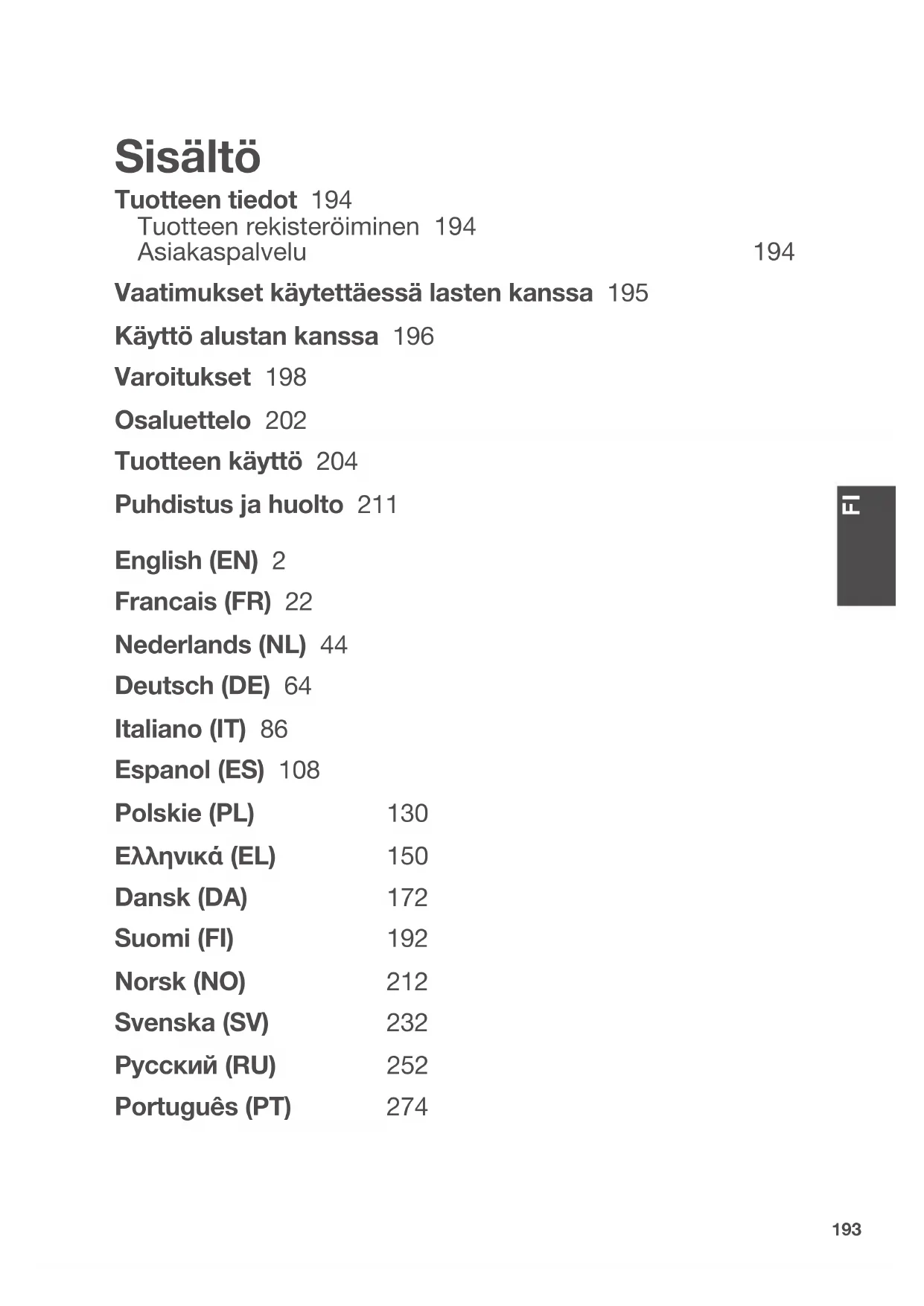 Sisältö Tuotteen tiedot 194 Tuotteen rekisteröiminen 194 Asiakaspalvelu 194 Vaatimukset käytettäessä lasten kanssa 195 Käyttö alustan kanssa 196 Varoitukset 198 Osaluettelo 202 Tuotteen käyttö 204 Puhdistus ja huolto 211 English (EN) 2 Francais (FR) 22 Nederlands (NL) 44 Deutsch (DE) 64 Italiano (IT) 86 Espanol (ES) 108 Polskie (PL) 130 Ελληνικά (EL) 150 Dansk (DA) 172 Suomi (FI) 192 Norsk (NO) 212 Svenska (SV) 232 Pусский (RU) 252 Português (PT) 274194