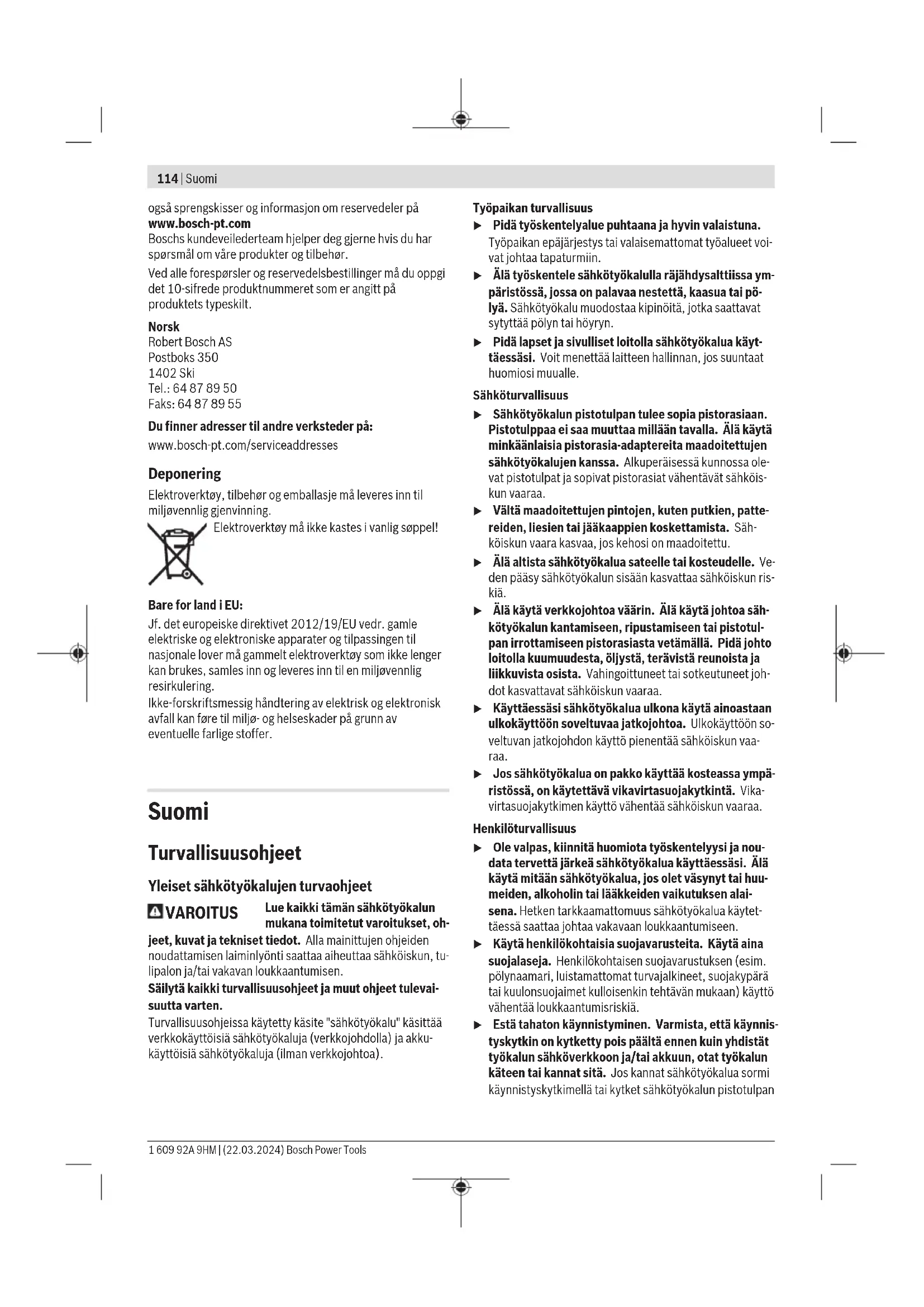 Bryterutførelse med lås For å slå på elektroverktøyet trykker du først på på/av- bryteren(2) ➊ og skyver den forover ➋. Trykk deretter på den og hold den inne ➌. For å låse den inntrykte av/på-bryteren(2) skyver du den(2) lenger forover ➍. For å slå av elektroverktøyet slipper du på/av-bryteren(2), eller du trykker kort på av/på-bryteren(2) og slipper den hvis den er låst. Bryterutførelse uten lås For å slå på elektroverktøyet trykker du først på på/av- bryteren(2) ➊ og skyver den forover ➋. Trykk deretter på den og hold den inne ➌. For å slå av elektroverktøyet slipper du på/av-bryteren(2). u Kontroller slipeverktøyet før bruk. Slipeverktøyet må være riktig montert, og må kunne rotere fritt. Test verktøyet i minst ett minutt uten belastning. Bruk ikke skadde, deformerte eller vibrerende slipeverktøy. Skadde slipeverktøy kan gå i stykker og forårsake personskader. Service og vedlikehold Vedlikehold og rengjøring u Før alle arbeider på elektroverktøyet utføres må støpselet trekkes ut av stikkontakten. u Hold selve elektroverktøyet og ventilasjonsslissene alltid rene, for å kunne arbeide bra og sikkert. u Bruk om mulig et avsugsanlegg ved ekstreme forhold på arbeidsplassen. Blås ventilasjonsslissene rene ofte, og koble til en feilstrømvernebryter (PRCD). Ved bearbeidelse av metall kan det sette seg lededyktig støv inne i elektroverktøyet. Beskyttelsesisolasjonen til elektroverktøyet kan innskrenkes. Tilbehøret må lagres og behandles med omhu. Hvis det er nødvendig å skifte ut tilkoblingsledningen, må dette gjøres av Bosch eller godkjente Bosch- serviceverksteder, slik at det ikke oppstår fare for sikkerheten. Kundeservice og kundeveiledning Kundeservice hjelper deg ved spørsmål om reparasjon og vedlikehold av produktet ditt og reservedelene. Du finner Bosch Power Tools 1 609 92A 9HM | (22.03.2024)114 | Suomi også sprengskisser og informasjon om reservedeler på www.bosch-pt.com Boschs kundeveilederteam hjelper deg gjerne hvis du har spørsmål om våre produkter og tilbehør. Ved alle forespørsler og reservedelsbestillinger må du oppgi det 10‑sifrede produktnummeret som er angitt på produktets typeskilt. Norsk Robert Bosch AS Postboks 350 1402 Ski Tel.: 64 87 89 50 Faks: 64 87 89 55 Du finner adresser til andre verksteder på: www.bosch-pt.com/serviceaddresses Deponering Elektroverktøy, tilbehør og emballasje må leveres inn til miljøvennlig gjenvinning. Elektroverktøy må ikke kastes i vanlig søppel! Bare for land i EU: Jf. det europeiske direktivet 2012/19/EU vedr. gamle elektriske og elektroniske apparater og tilpassingen til nasjonale lover må gammelt elektroverktøy som ikke lenger kan brukes, samles inn og leveres inn til en miljøvennlig resirkulering. Ikke-forskriftsmessig håndtering av elektrisk og elektronisk avfall kan føre til miljø- og helseskader på grunn av eventuelle farlige stoffer. Suomi Turvallisuusohjeet Yleiset sähkötyökalujen turvaohjeet VAROITUS Lue kaikki tämän sähkötyökalun mukana toimitetut varoitukset, oh- jeet, kuvat ja tekniset tiedot. Alla mainittujen ohjeiden noudattamisen laiminlyönti saattaa aiheuttaa sähköiskun, tu- lipalon ja/tai vakavan loukkaantumisen. Säilytä kaikki turvallisuusohjeet ja muut ohjeet tulevai- suutta varten. Turvallisuusohjeissa käytetty käsite "sähkötyökalu" käsittää verkkokäyttöisiä sähkötyökaluja (verkkojohdolla) ja akku- käyttöisiä sähkötyökaluja (ilman verkkojohtoa). Työpaikan turvallisuus u Pidä työskentelyalue puhtaana ja hyvin valaistuna. Työpaikan epäjärjestys tai valaisemattomat työalueet voi- vat johtaa tapaturmiin. u Älä työskentele sähkötyökalulla räjähdysalttiissa ym- päristössä, jossa on palavaa nestettä, kaasua tai pö- lyä. Sähkötyökalu muodostaa kipinöitä, jotka saattavat sytyttää pölyn tai höyryn. u Pidä lapset ja sivulliset loitolla sähkötyökalua käyt- täessäsi. Voit menettää laitteen hallinnan, jos suuntaat huomiosi muualle. Sähköturvallisuus u Sähkötyökalun pistotulpan tulee sopia pistorasiaan. Pistotulppaa ei saa muuttaa millään tavalla. Älä käytä minkäänlaisia pistorasia-adaptereita maadoitettujen sähkötyökalujen kanssa. Alkuperäisessä kunnossa ole- vat pistotulpat ja sopivat pistorasiat vähentävät sähköis- kun vaaraa. u Vältä maadoitettujen pintojen, kuten putkien, patte- reiden, liesien tai jääkaappien koskettamista. Säh- köiskun vaara kasvaa, jos kehosi on maadoitettu. u Älä altista sähkötyökalua sateelle tai kosteudelle. Ve- den pääsy sähkötyökalun sisään kasvattaa sähköiskun ris- kiä. u Älä käytä verkkojohtoa väärin. Älä käytä johtoa säh- kötyökalun kantamiseen, ripustamiseen tai pistotul- pan irrottamiseen pistorasiasta vetämällä. Pidä johto loitolla kuumuudesta, öljystä, terävistä reunoista ja liikkuvista osista. Vahingoittuneet tai sotkeutuneet joh- dot kasvattavat sähköiskun vaaraa. u Käyttäessäsi sähkötyökalua ulkona käytä ainoastaan ulkokäyttöön soveltuvaa jatkojohtoa. Ulkokäyttöön so- veltuvan jatkojohdon käyttö pienentää sähköiskun vaa- raa. u Jos sähkötyökalua on pakko käyttää kosteassa ympä- ristössä, on käytettävä vikavirtasuojakytkintä. Vika- virtasuojakytkimen käyttö vähentää sähköiskun vaaraa. Henkilöturvallisuus u Ole valpas, kiinnitä huomiota työskentelyysi ja nou- data tervettä järkeä sähkötyökalua käyttäessäsi. Älä käytä mitään sähkötyökalua, jos olet väsynyt tai huu- meiden, alkoholin tai lääkkeiden vaikutuksen alai- sena. Hetken tarkkaamattomuus sähkötyökalua käytet- täessä saattaa johtaa vakavaan loukkaantumiseen. u Käytä henkilökohtaisia suojavarusteita. Käytä aina suojalaseja. Henkilökohtaisen suojavarustuksen (esim. pölynaamari, luistamattomat turvajalkineet, suojakypärä tai kuulonsuojaimet kulloisenkin tehtävän mukaan) käyttö vähentää loukkaantumisriskiä. u Estä tah