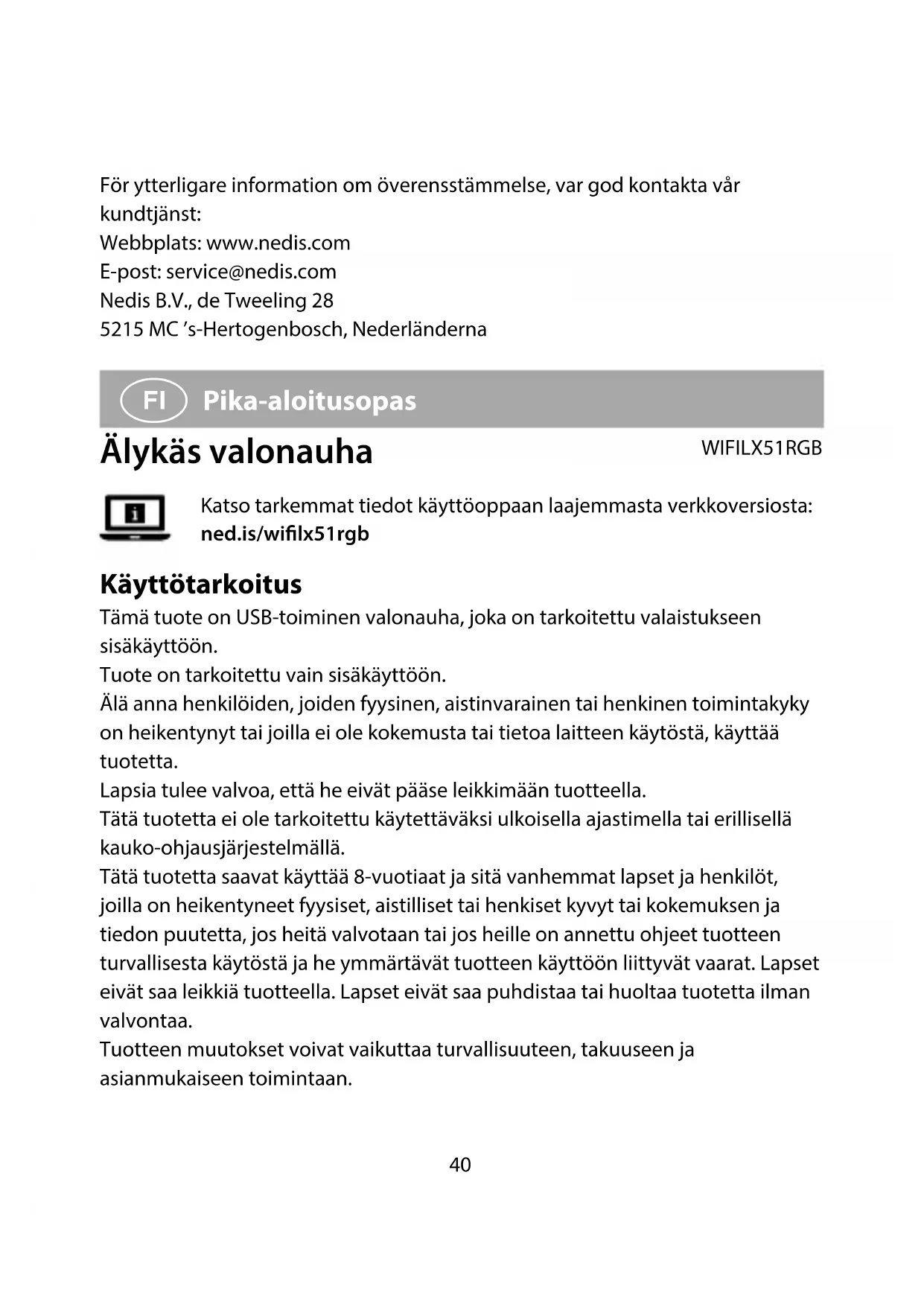 Vaatimustenmukaisuusvakuutus Nedis B.V. ilmoittaa valmistajana, että tuote WIFILX51RGB tuotemerkistämme Nedis®, valmistettu Kiinassa, on testattu kaikkien asiaankuuluvien CE- standardien ja määräysten mukaisesti ja tuote on läpäissyt kaikki testit. Tämä sisältää RED 2014/53/EU -direktiivin siihen kuitenkaan rajoittumatta.44 Täydellinen vaatimustenmukaisuusvakuutus (ja käyttöturvallisuustiedote, mikäli käytettävissä) on saatavilla ja ladattavissa osoitteesta: nedis./WIFILX51RGB#support Lisätietoa vaatimustenmukaisuudesta saat ottamalla yhteyttä asiakaspalveluun: Internet: www.nedis.com Sähköposti: service@nedis.com Nedis B.V., de Tweeling 28 5215 MC ’s-Hertogenbosch, Alankomaat
