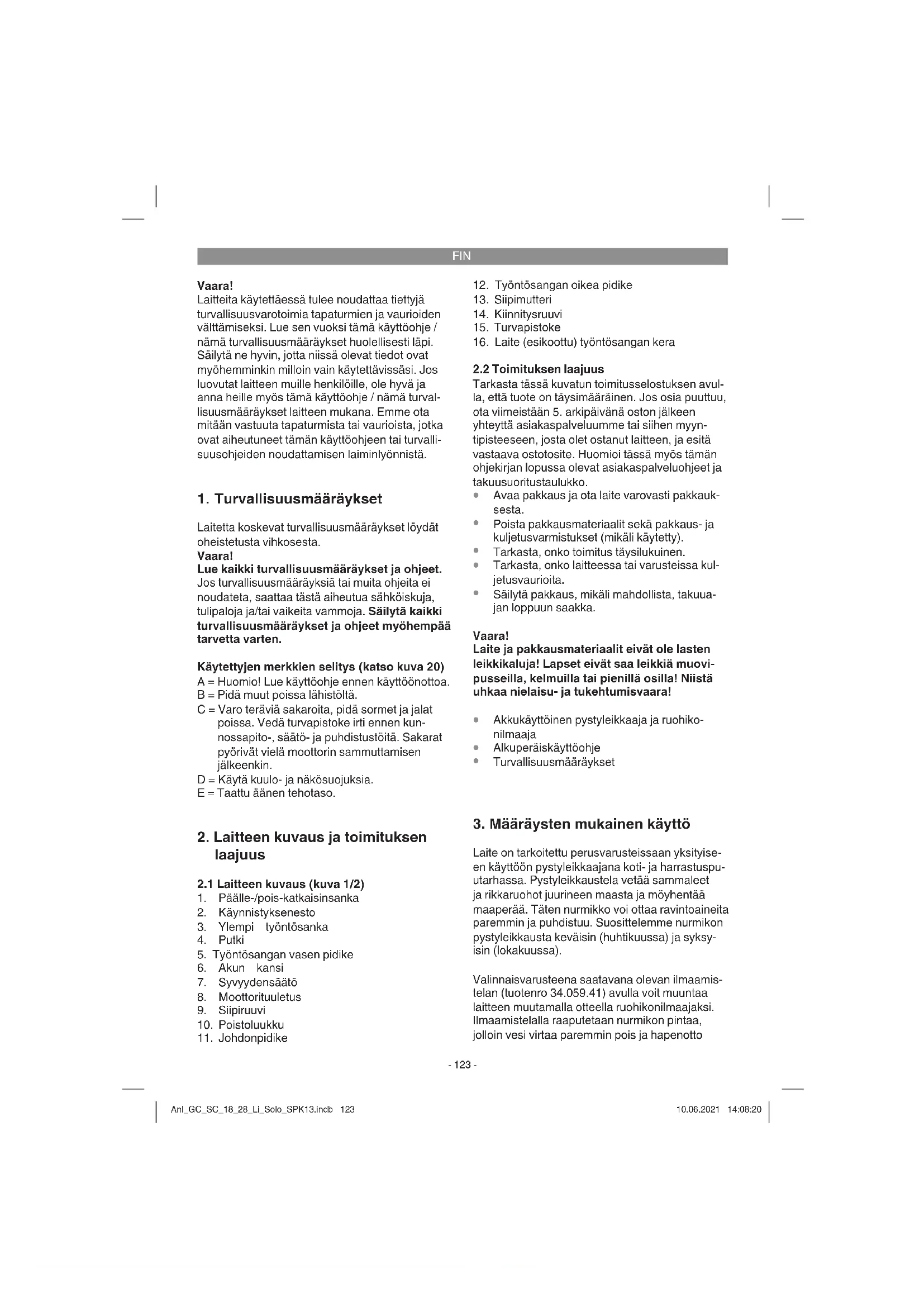 Laite on tarkoitettu perusvarusteissaan yksityise- en käyttöön pystyleikkaajana koti- ja harrastuspu- utarhassa. Pystyleikkaustela vetää sammaleet ja rikkaruohot juurineen maasta ja möyhentää maaperää. Täten nurmikko voi ottaa ravintoaineita paremmin ja puhdistuu. Suosittelemme nurmikon pystyleikkausta keväisin (huhtikuussa) ja syksy- isin (lokakuussa). Valinnaisvarusteena saatavana olevan ilmaamis- telan (tuotenro 34.059.41) avulla voit muuntaa laitteen muutamalla otteella ruohikonilmaajaksi. Ilmaamistelalla raaputetaan nurmikon pintaa, jolloin vesi virtaa paremmin pois ja hapenotto Anl_GC_SC_18_28_Li_Solo_SPK13.indb 123Anl_GC_SC_18_28_Li_Solo_SPK13.indb 123 10.06.2021 14:08:2010.06.2021 14:08:20FIN