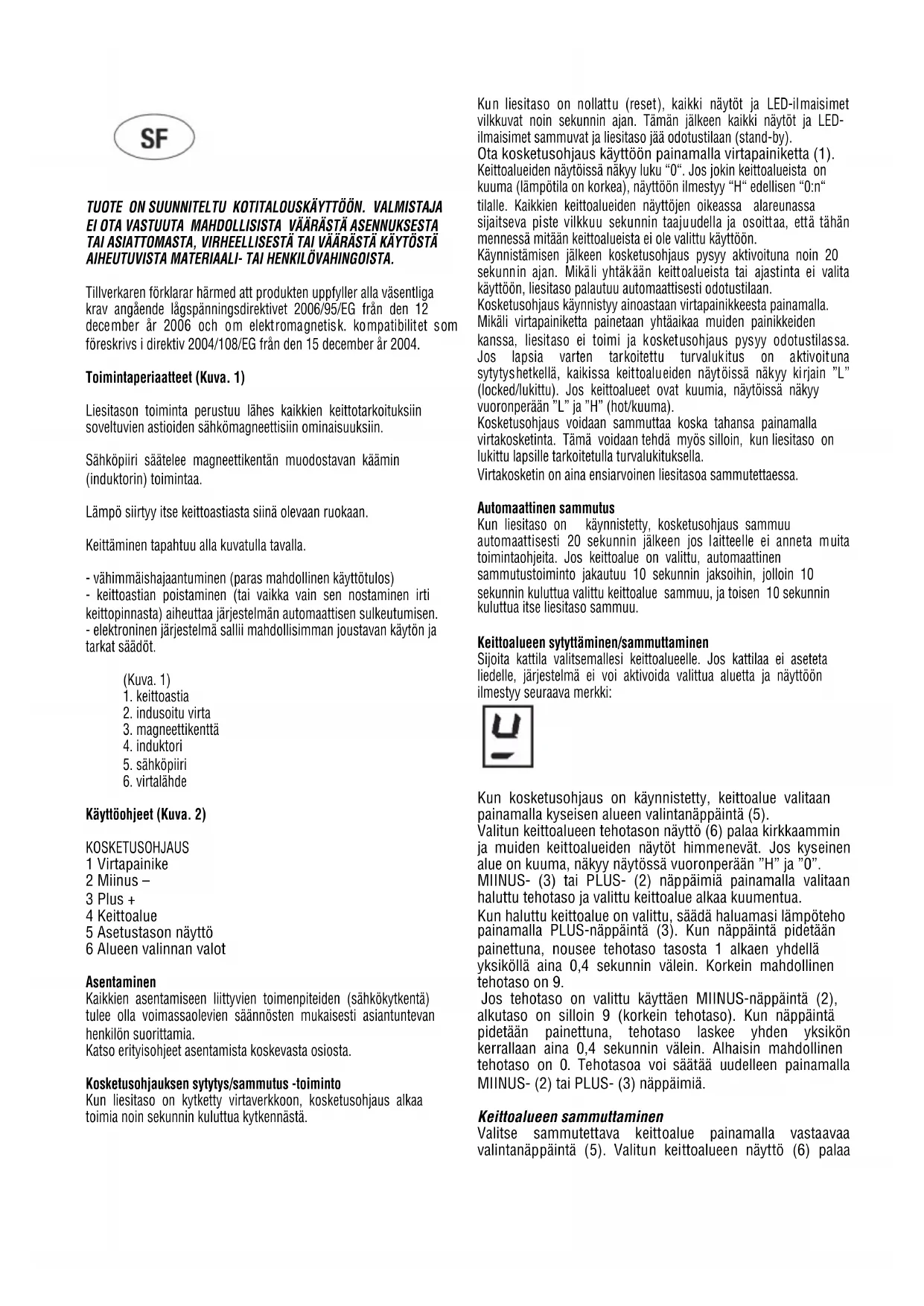 Käyttöohjeet (Kuva. 2) KOSKETUSOHJAUS 1 Virtapainike 2 Miinus – 3 Plus + 4 Keittoalue 5 Asetustason näyttö 6 Alueen valinnan valot Asentaminen Kaikkien asentamiseen liittyvien toimenpiteiden (sähkökytkentä) tulee olla voimassaolevien säännösten mukaisesti asiantuntevan henkilön suorittamia. Katso erityisohjeet asentamista koskevasta osiosta. Kosketusohjauksen sytytys/sammutus -toiminto Kun liesitaso on kytketty virtaverkkoon, kosketusohjaus alkaa toimia noin sekunnin kuluttua kytkennästä. Kun liesitaso on nollattu (reset), kaikki näytöt ja LED-ilmaisimet vilkkuvat noin sekunnin ajan. Tämän jälkeen kaikki näytöt ja LED- ilmaisimet sammuvat ja liesitaso jää odotustilaan (stand-by). Ota kosketusohjaus käyttöön painamalla virtapainiketta (1). Keittoalueiden näytöissä näkyy luku “0“. Jos jokin keittoalueista on kuuma (lämpötila on korkea), näyttöön ilmestyy “H“ edellisen “0:n“ tilalle. Kaikkien keittoalueiden näyttöjen oikeassa alareunassa sijaitseva piste vilkkuu sekunnin taajuudella ja osoittaa, että tähän mennessä mitään keittoalueista ei ole valittu käyttöön. Käynnistämisen jälkeen kosketusohjaus pysyy aktivoituna noin 20 sekunnin ajan. Mikäli yhtäkään keittoalueista tai ajastinta ei valita käyttöön, liesitaso palautuu automaattisesti odotustilaan. Kosketusohjaus käynnistyy ainoastaan virtapainikkeesta painamalla. Mikäli virtapainiketta painetaan yhtäaikaa muiden painikkeiden kanssa, liesitaso ei toimi ja kosketusohjaus pysyy odotustilassa. Jos lapsia varten tarkoitettu turvalukitus on aktivoituna sytytyshetkellä, kaikissa keittoalueiden näytöissä näkyy kirjain ”L” (locked/lukittu). Jos keittoalueet ovat kuumia, näytöissä näkyy vuoronperään ”L” ja ”H” (hot/kuuma). Kosketusohjaus voidaan sammuttaa koska tahansa painamalla virtakosketinta. Tämä voidaan tehdä myös silloin, kun liesitaso on lukittu lapsille tarkoitetulla turvalukituksella. Virtakosketin on aina ensiarvoinen liesitasoa sammutettaessa. Automaattinen sammutus Kun liesitaso on käynnistetty, kosketusohjaus sammuu automaattisesti 20 sekunnin jälkeen jos laitteelle ei anneta muita toimintaohjeita. Jos keittoalue on valittu, automaattinen sammutustoiminto jakautuu 10 sekunnin jaksoihin, jolloin 10 sekunnin kuluttua valittu keittoalue sammuu, ja toisen 10 sekunnin kuluttua itse liesitaso sammuu. Keittoalueen sytyttäminen/sammuttaminen Sijoita kattila valitsemallesi keittoalueelle. Jos kattilaa ei aseteta liedelle, järjestelmä ei voi aktivoida valittua aluetta ja näyttöön ilmestyy seuraava merkki:
