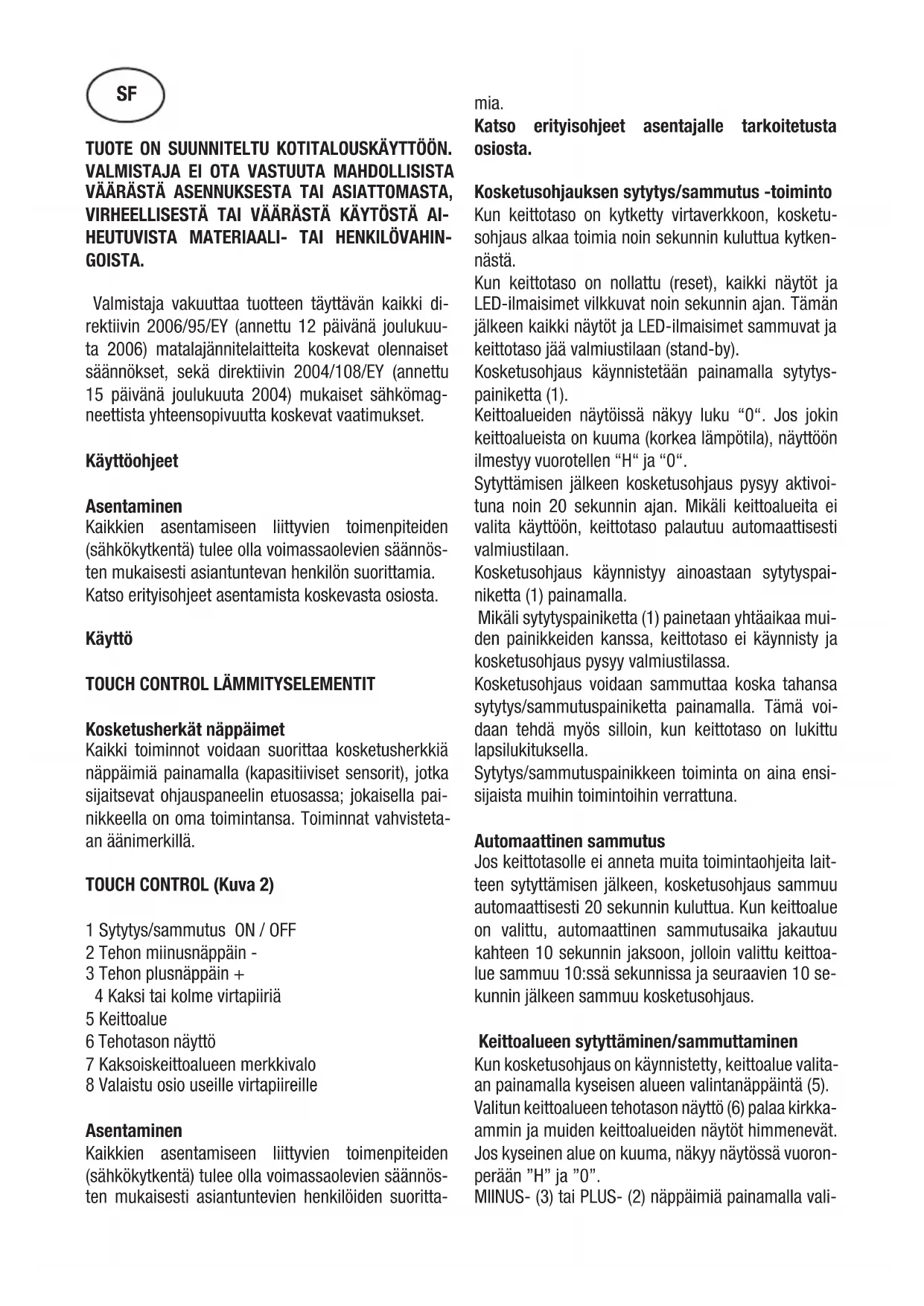 Kosketusherkät näppäimet Kaikki toiminnot voidaan suorittaa kosketusherkkiä näppäimiä painamalla (kapasitiiviset sensorit), jotka sijaitsevat ohjauspaneelin etuosassa; jokaisella pai- nikkeella on oma toimintansa. Toiminnat vahvisteta- an äänimerkillä. TOUCH CONTROL (Kuva 2) 1 Sytytys/sammutus ON / OFF 2 Tehon miinusnäppäin - 3 Tehon plusnäppäin + 4 Kaksi tai kolme virtapiiriä 5 Keittoalue 6 Tehotason näyttö 7 Kaksoiskeittoalueen merkkivalo 8 Valaistu osio useille virtapiireille Asentaminen Kaikkien asentamiseen liittyvien toimenpiteiden (sähkökytkentä) tulee olla voimassaolevien säännös- ten mukaisesti asiantuntevien henkilöiden suoritta- mia. Katso erityisohjeet asentajalle tarkoitetusta osiosta. Kosketusohjauksen sytytys/sammutus -toiminto Kun keittotaso on kytketty virtaverkkoon, kosketu- sohjaus alkaa toimia noin sekunnin kuluttua kytken- nästä. Kun keittotaso on nollattu (reset), kaikki näytöt ja LED-ilmaisimet vilkkuvat noin sekunnin ajan. Tämän jälkeen kaikki näytöt ja LED-ilmaisimet sammuvat ja keittotaso jää valmiustilaan (stand-by). Kosketusohjaus käynnistetään painamalla sytytys- painiketta (1). Keittoalueiden näytöissä näkyy luku “0“. Jos jokin keittoalueista on kuuma (korkea lämpötila), näyttöön ilmestyy vuorotellen “H“ ja “0“. Sytyttämisen jälkeen kosketusohjaus pysyy aktivoi- tuna noin 20 sekunnin ajan. Mikäli keittoalueita ei valita käyttöön, keittotaso palautuu automaattisesti valmiustilaan. Kosketusohjaus käynnistyy ainoastaan sytytyspai- niketta (1) painamalla. Mikäli sytytyspainiketta (1) painetaan yhtäaikaa mui- den painikkeiden kanssa, keittotaso ei käynnisty ja kosketusohjaus pysyy valmiustilassa. Kosketusohjaus voidaan sammuttaa koska tahansa sytytys/sammutuspainiketta painamalla. Tämä voi- daan tehdä myös silloin, kun keittotaso on lukittu lapsilukituksella. Sytytys/sammutuspainikkeen toiminta on aina ensi- sijaista muihin toimintoihin verrattuna. Automaattinen sammutus Jos keittotasolle ei anneta muita toimintaohjeita lait- teen sytyttämisen jälkeen, kosketusohjaus sammuu automaattisesti 20 sekunnin kuluttua. Kun keittoalue on valittu, automaattinen sammutusaika jakautuu kahteen 10 sekunnin jaksoon, jolloin valittu keittoa- lue sammuu 10:ssä sekunnissa ja seuraavien 10 se- kunnin jälkeen sammuu kosketusohjaus. Keittoalueen sytyttäminen/sammuttaminen Kun kosketusohjaus on käynnistetty, keittoalue valita- an painamalla kyseisen alueen valintanäppäintä (5). Valitun keittoalueen tehotason näyttö (6) palaa kirkka- ammin ja muiden keittoalueiden näytöt himmenevät. Jos kyseinen alue on kuuma, näkyy näytössä vuoron- perään ”H” ja ”0”. MIINUS- (3) tai PLUS- (2) näppäimiä painamalla vali- SFtaan haluttu tehotaso ja valittu keittoalue alkaa kuu- mentua. Kun haluttu keittoalue on valittu, säädä haluama- si lämpöteho painamalla PLUS-näppäintä (3). Kun näppäintä pidetään painettuna, nousee tehotaso tasosta 1 alkaen yhdellä yksiköllä aina 0,4 sekunnin välein. Korkein mahdollinen tehotaso on 9. Jos tehotaso on valittu käyttäen MIINUS-näppäintä (2), alkutaso on silloin 9 (korkein tehotaso). Kun näppäintä pidetään painettuna, tehotaso laskee yhden yksikön kerrallaan aina 0,4 sekunnin välein. Alhaisin mahdollinen tehotaso on 0. Tehotasoa voi säätää uudelleen painamalla MIINUS- (2) tai PLUS- (3) näppäimiä. Keittoalueen sammuttaminen Valitse sammutettava keittoalue painamalla vasta- avaa valintanäppäintä (5). Valitun keittoalueen näyttö (6) palaa kirkkaammin ja muut näytöt himmenevät. Kun PLUS- (3) ja MIINUS –näppäimiä (2) painetaan yhtäaikaa, keittoalueen tehotaso asettuu nollaan. Vai- htoehtoisesti voi painaa MIINUS-näppäintä (2), kun- nes tehotaso laskee nollaan. Jos jokin keittoalueista on kuuma, ilmestyy näyttöön vuoronperään ”H” ja ”0”. Kaikkien keittoalueiden sammuttaminen Kaikki keittoalueet voi sammuttaa yhtä aikaa paina- malla sytytys/sammutuspainiketta (1). Keittotason ollessa valmiustilassa ilmestyy “H” niiden keittoaluei- den näyttöön, jotka ovat vielä kuumia. Kaikki muut näytöt sammuvat. Tehotaso Keittoalueen tehotaso käsittää 9 eri astetta. Tehotaso näkyy näytössä numeroina 1-9 seitsemänlohkoisten LED-ilmaisimien (6) avulla. Jäännöslämmön ilmaisin Ilmaisin kertoo käyttäjälle, että keraamisen keitto- tason lämpötila on edelleen vaarallisen korkea eikä keittoalueeseen voi koskea. Lämpötila määritetään matemaattisen mallin mukaan ja mikäli keittoalueella havaitaan jäännöslämpöä, ilmoitetaan se näytössä seitsemänlohkoisesta merkkivalosta muodostuvalla symbolilla ”H”. Kuumeneminen ja jäähtyminen lasketaan seuraavin perustein: