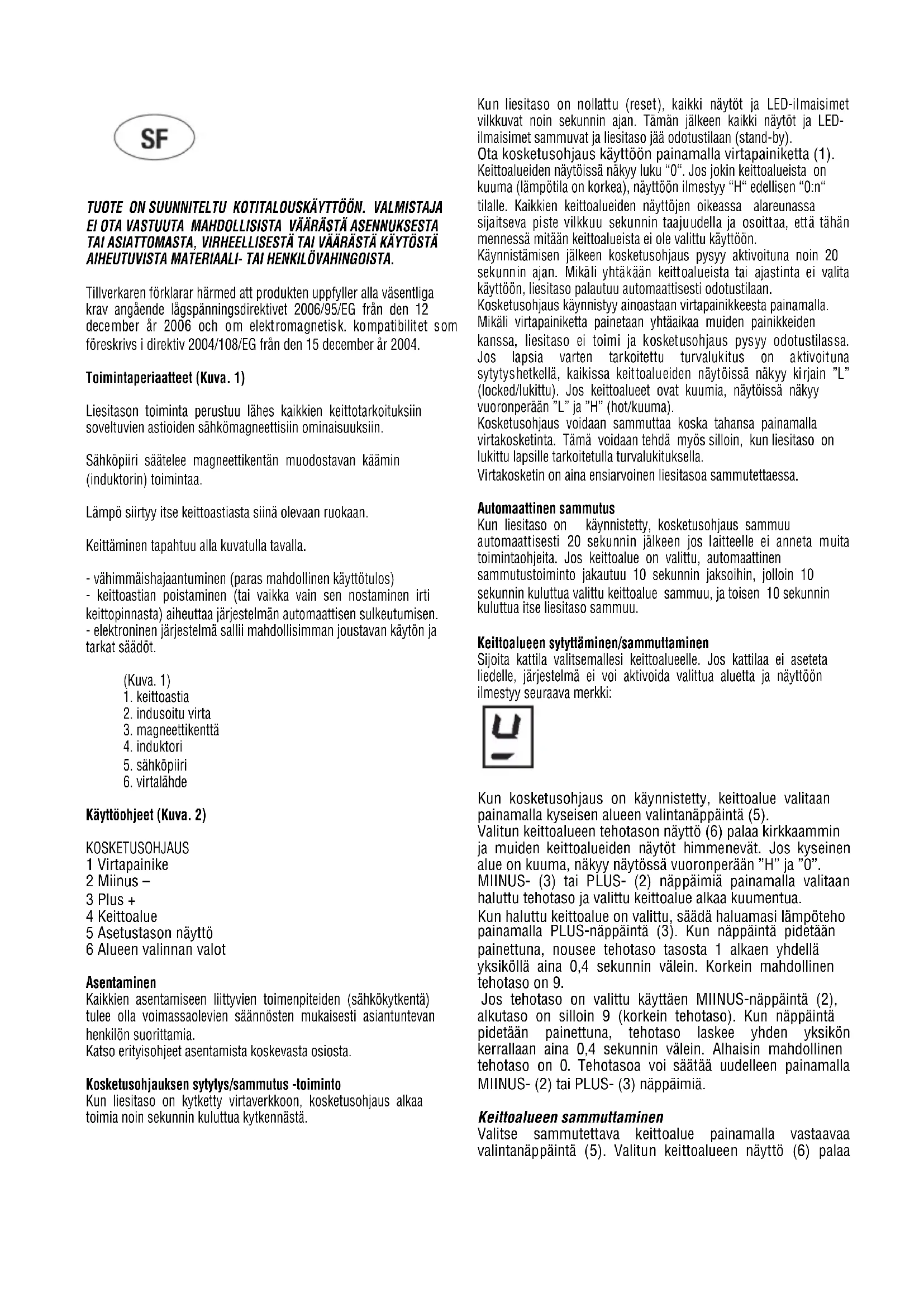 Käyttöohjeet (Kuva. 2) KOSKETUSOHJAUS 1 Virtapainike 2 Miinus – 3 Plus + 4 Keittoalue 5 Asetustason näyttö 6 Alueen valinnan valot Asentaminen Kaikkien asentamiseen liittyvien toimenpiteiden (sähkökytkentä) tulee olla voimassaolevien säännösten mukaisesti asiantuntevan henkilön suorittamia. Katso erityisohjeet asentamista koskevasta osiosta. Kosketusohjauksen sytytys/sammutus -toiminto Kun liesitaso on kytketty virtaverkkoon, kosketusohjaus alkaa toimia noin sekunnin kuluttua kytkennästä. Kun liesitaso on nollattu (reset), kaikki näytöt ja LED-ilmaisimet vilkkuvat noin sekunnin ajan. Tämän jälkeen kaikki näytöt ja LED- ilmaisimet sammuvat ja liesitaso jää odotustilaan (stand-by). Ota kosketusohjaus käyttöön painamalla virtapainiketta (1). Keittoalueiden näytöissä näkyy luku “0“. Jos jokin keittoalueista on kuuma (lämpötila on korkea), näyttöön ilmestyy “H“ edellisen “0:n“ tilalle. Kaikkien keittoalueiden näyttöjen oikeassa alareunassa sijaitseva piste vilkkuu sekunnin taajuudella ja osoittaa, että tähän mennessä mitään keittoalueista ei ole valittu käyttöön. Käynnistämisen jälkeen kosketusohjaus pysyy aktivoituna noin 20 sekunnin ajan. Mikäli yhtäkään keittoalueista tai ajastinta ei valita käyttöön, liesitaso palautuu automaattisesti odotustilaan. Kosketusohjaus käynnistyy ainoastaan virtapainikkeesta painamalla. Mikäli virtapainiketta painetaan yhtäaikaa muiden painikkeiden kanssa, liesitaso ei toimi ja kosketusohjaus pysyy odotustilassa. Jos lapsia varten tarkoitettu turvalukitus on aktivoituna sytytyshetkellä, kaikissa keittoalueiden näytöissä näkyy kirjain ”L” (locked/lukittu). Jos keittoalueet ovat kuumia, näytöissä näkyy vuoronperään ”L” ja ”H” (hot/kuuma). Kosketusohjaus voidaan sammuttaa koska tahansa painamalla virtakosketinta. Tämä voidaan tehdä myös silloin, kun liesitaso on lukittu lapsille tarkoitetulla turvalukituksella. Virtakosketin on aina ensiarvoinen liesitasoa sammutettaessa. Automaattinen sammutus Kun liesitaso on käynnistetty, kosketusohjaus sammuu automaattisesti 20 sekunnin jälkeen jos laitteelle ei anneta muita toimintaohjeita. Jos keittoalue on valittu, automaattinen sammutustoiminto jakautuu 10 sekunnin jaksoihin, jolloin 10 sekunnin kuluttua valittu keittoalue sammuu, ja toisen 10 sekunnin kuluttua itse liesitaso sammuu. Keittoalueen sytyttäminen/sammuttaminen Sijoita kattila valitsemallesi keittoalueelle. Jos kattilaa ei aseteta liedelle, järjestelmä ei voi aktivoida valittua aluetta ja näyttöön ilmestyy seuraava merkki: