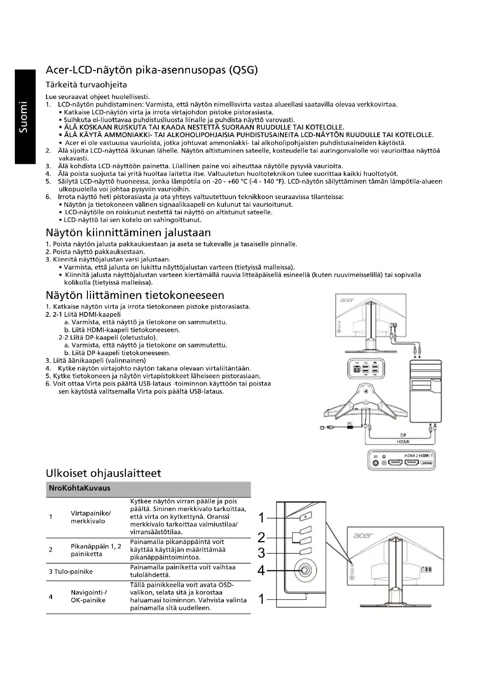 (typisk) Kontrast 100000000:1 Maks. (ACM) Betragtningsvinkel 170° (H) 160° (V) (CR=10) Svartid 0,5 ms (G til G) Paneltype TN H-frekvens HDMI 2.0: 31 - 222 KHz DP: 222 - 222 KHz V-frekvens HDMI 2.0: 56 - 144 Hz DP: 40 - 144 Hz HDMI 2.0: 40-144 Hz (FreeSync aktiveret) Skærmfarver 16,7 millioner Pixelfrekvens HDMI 2.0/DP: 600 MHz Maksimal opløsning 2560 x 1440 @ 144 Hz Plug & Play VESA DDCCI/DDC2B Energiklasse A *Årligt energiforbrug 42 (kWh) (til model med HDMI-indgang) Strømforbrug (ved 200 enheder) Tændt tilstand 25,0 W (typisk) Slumretilstand 0,4 W (typisk) Slukket tilstand 0,3 W (typisk) Indgangsstik HDMI 19 ben (kun model med HDMI-indgang) DP (kun model med DP-indgang) Videoindgangssignal HDMI-signal (kun model med HDMI-indgang) (ekstraudstyr) DP (kun model med DP-indgang) (ekstraudstyr) Højttalere 7 W x 2 (kun model med lydindgang) (ekstraudstyr) USB USB 3.0 x 4 Maksimal skærmstørrelse Vandret: 596,74 mm Lodret: 335,66 mm Strømkilde 100-240 V, 50/60 Hz Miljøhensyn Driftstemperatur: 0° til 40° C Opbevaringsgtemp.: -20° til 60° C Luftfugtighed ved drift: 20 % til 80 % Mål 613,68 (B) x 401,59 ~ 511,59 (H) x 268,38 (D) mm Vægt (N. W.) 8,35 kg (netto) Funktionsspecifikationer Hældning: -5° til +25° (der kan kun opnås en bagudvendt hældning på 25 grader i den højeste position) Drejning: -30° til +30° Højdeindstilling: 0 mm til 110 mm Drejetap: Nej Aftagelig fod: Ja Udvendige knapper Knapper Tænd/sluk-knap Genvej 1 Genvej 2 Indgang 5 Navigationsknap Funktioner Lysstyrke Kontrast Mørkeforstærkning Blåt lys ACM Super skarphed Gamma Farvetemperatur Tilstande sRGB-tilstand 6-akset nuance 6-akset mætning Lydstyrke Overgear FreeSync MPRT Sigtekikkert Sprog OSD-timeout Gennemsigtighed Refresh Rate Num Indgang Automatisk kilde DP-format Bredformat Tildel genvejstaster DDC/CI HDMI sort niveau Hurtig opstart Sluk for USB-opladning Oplysninger om skærm Nulstil alle indstillinger Afslut Alle specifikationer kan ændres uden varsel.Suomi Acer-LCD-näytön pika-asennusopas (QSG) Tärkeitä turvaohjeita Lue seuraavat ohjeet huolellisesti.