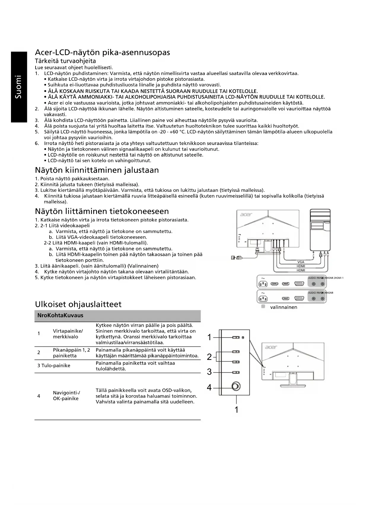 (tyypillinen) Kontrasti 100 000 000:1 enint. (ACM) Katselukulma 178° (V) 178° (P) (CR=10) Vasteaika 1 ms (VRB) Video R, G, B Analoginen liitäntä Paneelityyppi VA H-taajuus 30–85 kHz V-taajuus 56–76 Hz Näyttövärit 16,7 miljoonaa Pistekellotaajuus 174,5 MHz Enimmäistarkkuus VGA: 1920 x 1080 @ 75 Hz HDMI: 1920 x 1080 @ 75 Hz Plug & Play VESA DDCCI/DDC2B Virrankulutus (200 nitiä) Päällä 26 W Lepotila 0,5 W Pois 0,3 W Tuloliitäntä D-Sub HDMI (vain HDMI-tulomalli) Videotulosignaali Analoginen: 0,7 Vp-p (standardi), 75 OHM, positiivinen HDMI (vain HDMI-tulomalli) (valinnainen) Kaiuttimet 2 W x 2 (vain äänitulomalli) (valinnainen) Näyttöruudun enimmäiskoko Vaakasuora: 597,6 mm Pystysuora: 336,1 mm Virtalähde 100–240 V, 50/60 Hz Ympäristötekijät Käyttölämpötila: 0–40 °C Varastointilämpötila: -20–+60 °C Ilmankosteus: 20–80 % Mitat 614,3 (L) x 440,62 (K) x 248,98 (S) mm Paino (netto) 5,4 kg (netto) Mekanismin tiedot Kallistus: -5°–+20° Kierto: Ei Korkeuden säätö: Ei Nivelöinti: Ei Irrotettava jalusta: Kyllä Ulkoiset ohjauslaitteet Vaihto/painikkeet Virtapainike Pikanäppäin 1 Pikanäppäin 2 Tulo Valikko/Navigointi/OK Toiminnot Kirkkaus Kontrasti Sininen valo Mustan vahvistus ACM Superterävyys Vaakasijainti (vain analoginen tulomalli) Pystysijainti (vain analoginen tulomalli) Taajuus (vain analoginen tulomalli) Tarkennus (vain analoginen tulomalli) Autom. asetukset (vain analoginen tulomalli) Gamma Värin lämpöisyys Tilat sRGB-tila Harmaasävytila 6-aksel. sävy 6-aksel. satur. Äänenvoim. Mykistä Ylivaihde FreeSync Virkist.taaj.num VRB Kieli Aikakatkaisu Läpikuultavuus Lukitse OSD Tulo Autom. lähde Pikanäppäinmääritys Laajakuva DDC/CI HDMI-mustan taso Pika-aloitustila Näyttötiedot Nollaa kaikki asetuks. Lopeta Tekniset tiedot saattavat vaihdella mallin ja/tai alueen mukaan.Norsk Hurtigstartveiledning (QSG) for LCD-skjerm fra Acer Viktige sikkerhetsinstruksjoner Les følgende instruksjoner nøye.