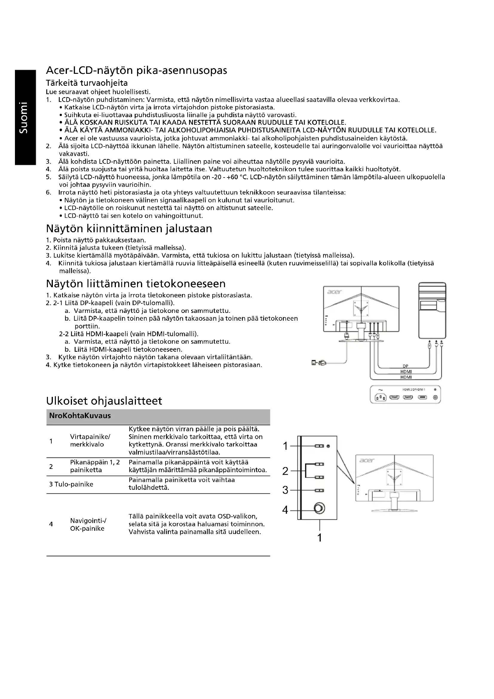 - LCD-näyttö tai sen kotelo on vahingoittunut. Näytön kiinnittäminen jalustaan 1. Poista näyttö pakkauksestaan.2. Kiinnitä jalusta tukeen (tietyissä malleissa).3. Lukitse kiertämällä myötäpäivään. Varmista, että tukiosa on lukittu jalustaan (tietyissä malleissa). 4. Kiinnitä tukiosa jalustaan kiertämällä ruuvia litteäpäisellä esineellä (kuten ruuvimeisselillä) tai sopivalla kolikolla (tietyissä malleissa). Näytön liittäminen tietokoneeseen 1. Katkaise näytön virta ja irrota tietokoneen pistoke pistorasiasta.2. 2-1 Liitä DP-kaapeli (vain DP-tulomalli).a. Varmista, että näyttö ja tietokone on sammutettu.b. Liitä DP-kaapelin toinen pää näytön takaosaan ja toinen pää tietokoneen porttiin.2-2 Liitä HDMI-kaapeli (vain HDMI-tulomalli).a. Varmista, että näyttö ja tietokone on sammutettu.b. Liitä HDMI-kaapeli tietokoneeseen.