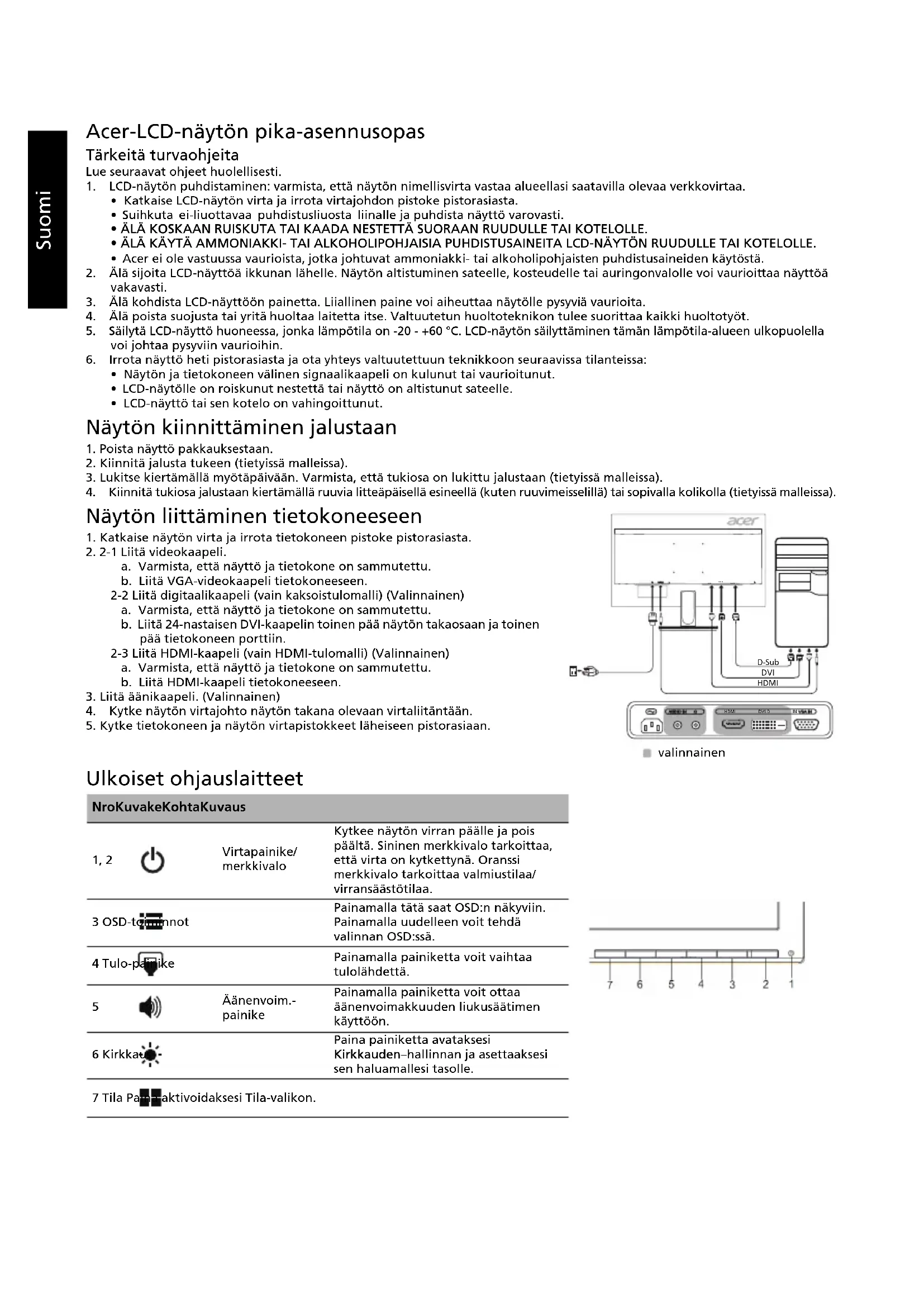 HDMI D-Sub DVI valinnainenSuomi Määräykset ja turvallisuusilmoitukset FCC-ilmoitus Tämä laite on testattu ja sen on todettu olevan FCC:n sääntöjen osan 15 mukaisten luokan B digitaaliselle laitteelle asetettujen rajoitusten mukainen. Nämä rajoitukset määrittävät riittävän suojauksen haitallisilta häiriöiltä kotitalousasennuksissa. Tämä laite muodostaa, käyttää ja saattaa säteillä radiotaajuusenergiaa. Jos sitä ei asenneta ja käytetä ohjeiden mukaisesti, se saattaa aiheuttaa haitallisia häiriöitä radioliikenteelle. Mitään takeita häiriöttömyydestä ei voida kuitenkaan antaa. Jos tämä laite aiheuttaa haitallisia häiriöitä radio- ja TV-vastaanotolle (häiriö voidaan havaita katkaisemalla laitteesta virta ja kytkemällä se uudelleen), käyttäjää kehotetaan korjaamaan häiriöt jollakin seuraavista tavoista: muuttamalla vastaanottoantennin asentoa tai paikkaa siirtämällä vastaanotin ja laite kauemmaksi toisistaan liittämällä laite pistorasiaan, joka kuuluu eri virtapiiriin kuin mihin vastaanotin on kytketty pyytämällä apua jälleenmyyjältä tai kokeneelta radio- ja TV-asentajalta. CE-vaatimustenmukaisuusvakuutus Acer Inc. vakuuttaa täten, että tämä LCD-näyttö on seuraavien direktiivien oleellisten vaatimusten ja muiden ehtojen mukainen: EMC-direktiivi 2014/30/EU, pienjännitedirektiivi 2014/35/EU, RoHS-direktiivi 2011/65/EU ja direktiivi 2009/125/EY energiaan liittyvien tuotteiden ekologiselle suunnittelulle asetettavien vaatimusten puitteista. Huomautus: Älä nosta näyttöä sen pohjasta, jotta se ei vahingoittuisi. Huomautus: suojatut kaapelit Kaikki liitännät muihin tietokonelaitteisiin tulee tehdä suojatuilla kaapeleilla EMC-direktiivin säännösten mukaisesti. Huomautus: oheislaitteet Tähän laitteeseen voi liittää vain sellaisia oheislaitteita (tiedonsiirtolaitteet, päätteet, tulostimet jne.), jotka on sertifioitu luokan B rajoitusten mukaisiksi. Käyttö ei-sertifioitujen oheislaitteiden kanssa aiheuttaa todennäköisesti häiriöitä radio- ja TV-vastaanotolle. Varoitus Muutokset, joita valmistaja ei ole erikseen hyväksynyt, saattavat mitätöidä FCC:n (Federal Communications Commission) käyttäjälle myöntämän luvan käyttää tätä laitetta. Käyttöehdot Tämä laite on FCC:n sääntöjen osan 15 mukainen. Käyttö on seuraavien ehtojen alaista: (1) Tämä laite ei saa aiheuttaa haitallisia häiriöitä, ja (2) tämän laitteen on hyväksyttävä kaikki vastaanotettu häiriö, mukaan lukien häiriöt, jotka saattavat aiheuttaa virheellistä käyttöä. Huomautus: Kanadassa asuvat käyttäjät Tämä luokan B digitaalinen laite on Kanadan ICES-003-standardin mukainen. Remarque à l'intention des utilisateurs canadiens Cet appareil numérique de la classe B est conforme à la norme NMB-003 du Canada. Käytöstä poistettujen laitteiden hävittäminen kotitalouksissa Euroopan unionin alueella Tämä laitteeseen tai sen pakkaukseen merkitty symboli tarkoittaa, että laitetta ei saa hävittää muun kotitalousjätteen mukana. Vastuullasi on viedä käytöstä poistettu laite sille tarkoitettuun elektronisten laitteiden ja sähkölaitteiden keräyspisteeseen kierrätettäväksi. Käytöstä poistetun laitteen erillinen keräys ja kierrätys auttavat säästämään luonnonvaroja ja varmistaa, että laite kierrätetään ihmisten terveyttä ja ympäristöä suojaavalla tavalla. Lisätietoa siitä, mihin voit viedä käytöstä poistetun laitteen kierrätettäväksi, saat ottamalla yhteyttä paikallisiin viranomaisiin, kierrätyskeskukseen tai jälleenmyyjään, jolta ostit laitteen.Suomi TEKNISET TIEDOT Acerin tuotteiden käyttöoppaita ja muita asiakirjoja on saatavilla Acerin virallisella tukisivustolla. *Vuosittaisen energiankulutuksen laskenta perustuu tyypilliseen 4 tunnin päivittäiseen virrankulutukseen 365 päivänä vuodessa. LCD-paneeli Ohjausjärjestelmä TFT Color LCD Koko 23,8”W (60 cm) Pikseliväli 0,2745 mm (V) x 0,2745 mm (P) Kirkkaus 250 cd/m