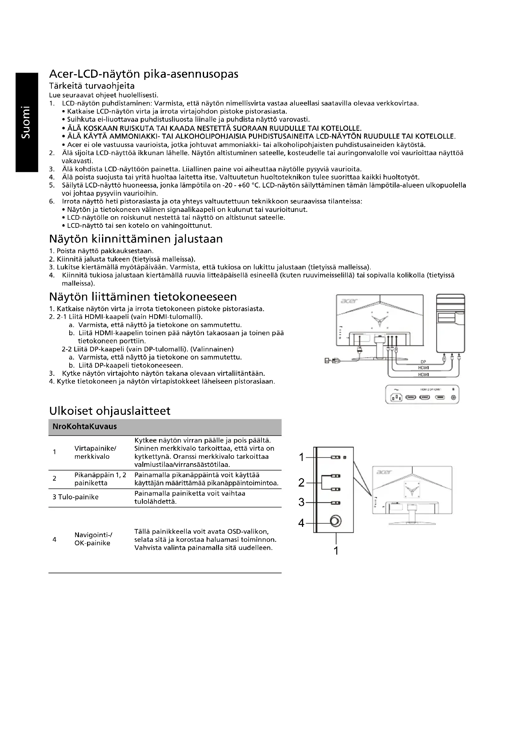 (tyypillinen) Kontrasti 100 000 000:1 enint. (ACM) Katselukulma 178° (V) 178° (P) (CR=10) Vasteaika 1 ms (VRB) Paneelityyppi In-Plane Switching (IPS) H-taajuus 31 - 292 kHz V-taajuus 56 - 240 Hz Näyttövärit 16,7 miljoonaa Pistekellotaajuus 600 MHz Enimmäistarkkuus 1920 x 1080 @ 240 Hz Plug & Play VESA DDCCI/DDC2B Virrankulutus Päällä 23 W Lepotila 0,5 W Pois 0,3 W Tuloliitäntä HDMI (vain HDMI-tulomalli) DP (vain DP-tulomalli) Videotulosignaali HDMI (vain HDMI-tulomalli) (valinnainen) DP (vain DP-tulomalli) (valinnainen) Kaiuttimet 2 W x 2 (vain äänitulomalli) (valinnainen) Näyttöruudun enimmäiskoko Vaakasuora: 543,744 mm Pystysuora: 302,616 mm Virtalähde 100–240 V, 50/60 Hz Ympäristötekijät Käyttölämpötila: 0–40 °C Varastointilämpötila: -20–+60 °C Ilmankosteus: 20–80 % Mitat 557,79 (L) x 419,61 (K) x 231,75 (S) mm Paino (netto) 4,34 kg (netto) Mekanismin tiedot Kallistus: -5°–+15° Kierto: Ei Korkeuden säätö: Ei Nivelöinti: Ei Irrotettava jalusta: Kyllä Ulkoiset ohjauslaitteet Vaihto/painikkeet Virtapainike Pikanäppäin 1 Pikanäppäin 2 Tulo Valikko/Navigointi/OK Toiminnot Kirkkaus Kontrasti Sininen valo Mustan vahvistus ACM HDR Superterävyys Gamma Värin lämpöisyys Tilat Väriavaruus Harmaasävytila 6-aksel. sävy 6-aksel. satur. Äänenvoim. Mykistä Ylivaihde FreeSync Premium Virkist.taaj.num VRB Ultra-matala latenssi Tähtäyspiste Kieli Aikakatkaisu Läpikuultavuus Lukitse OSD Tulo Autom. lähde DP-muoto Pikanäppäinmääritys Laajakuva DDC/CI HDMI-mustan taso Pika-aloitustila Näyttötiedot Nollaa kaikki asetuks. Lopeta Tekniset tiedot saattavat vaihdella mallin ja/tai alueen mukaan.Norsk Hurtigstartveiledning (QSG) for LCD-skjerm fra Acer Viktige sikkerhetsinstruksjoner Les følgende instruksjoner nøye.