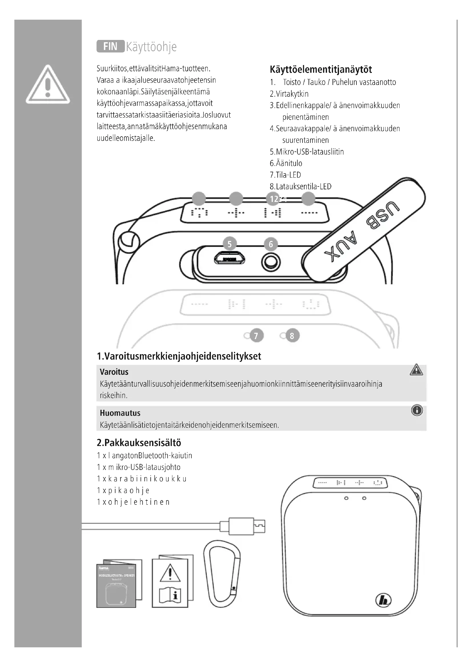 SPEAKER “Pocket 2.0” Suurkiitos, että valitsit Hama-tuotteen. Varaaaikaa ja lue seuraavat ohjeet ensin kokonaan läpi. Säilytä sen jälkeen tämä käyttöohje varmassa paikassa, jotta voit tarvittaessa tarkistaa siitä eri asioita. Jos luovut laitteesta, anna tämä käyttöohje sen mukana uudelle omistajalle. Käyttöelementit ja näytöt