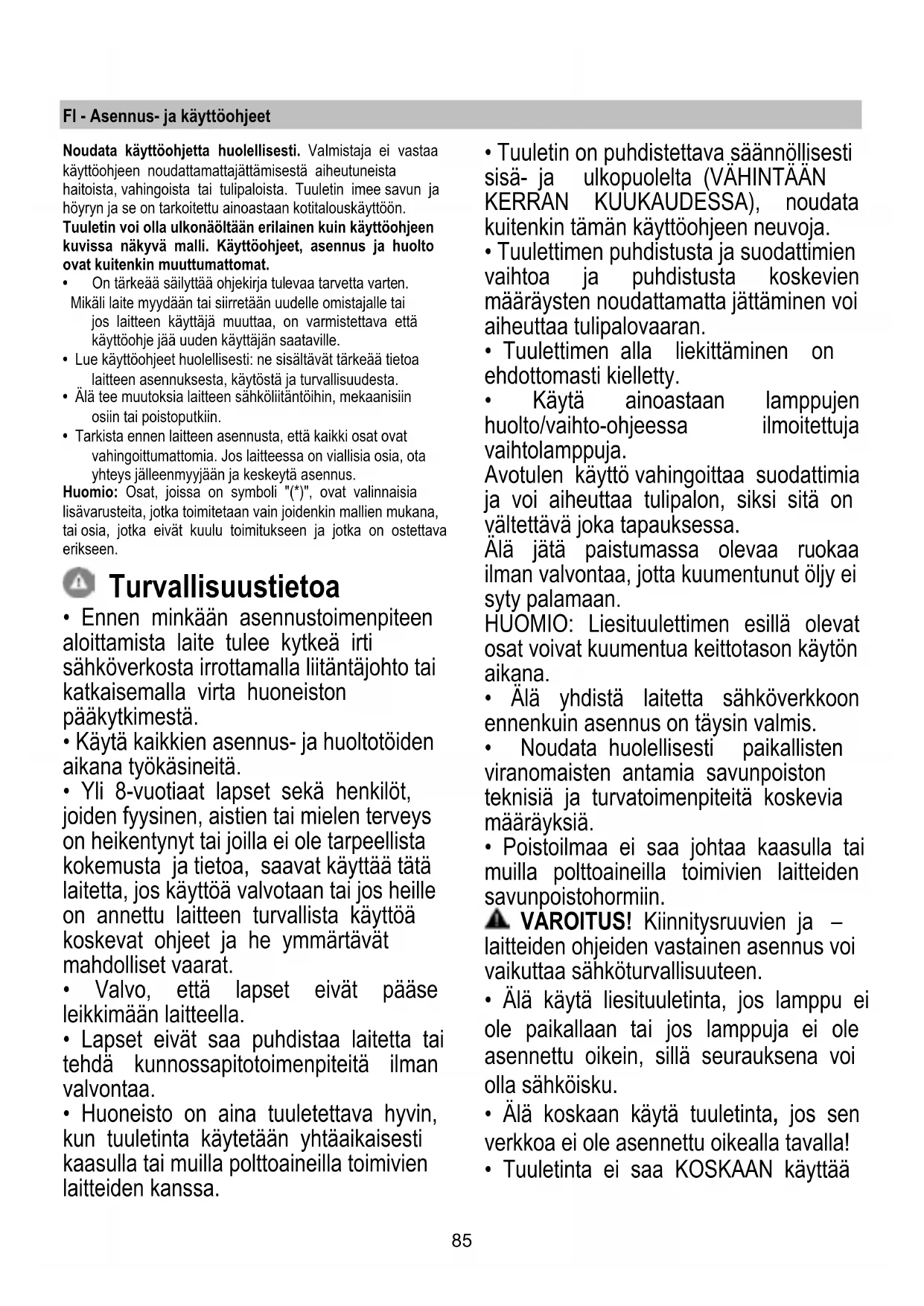 - Huoneisto on aina tuuletettava hyvin, kun tuuletinta käytetään yhtäaikaisesti kaasulla tai muilla polttoaineilla toimivien laitteiden kanssa.