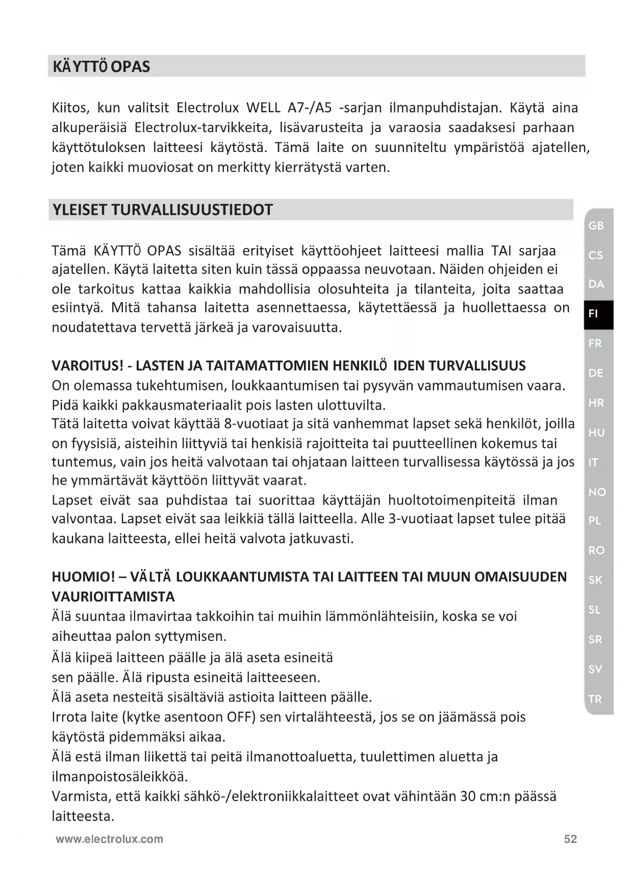 Kiitos, kun valitsit Electrolux WELL A7-/A5 -sarjan ilmanpuhdistajan. Käytä aina alkuperäisiä Electrolux-tarvikkeita, lisävarusteita ja varaosia saadaksesi parhaan käyttötuloksen laitteesi käytöstä. Tämä laite on suunniteltu ympäristöä ajatellen, joten kaikki muoviosat on merkitty kierrätystä varten. YLEISET TURVALLISUUSTIEDOT