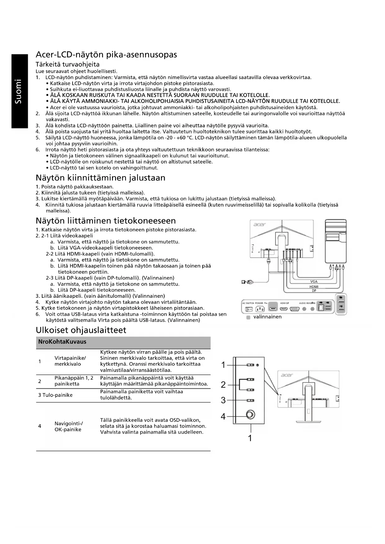 - LCD-näyttö tai sen kotelo on vahingoittunut. Näytön kiinnittäminen jalustaan 1. Poista näyttö pakkauksestaan.2. Kiinnitä jalusta tukeen (tietyissä malleissa).3. Lukitse kiertämällä myötäpäivään. Varmista, että tukiosa on lukittu jalustaan (tietyissä malleissa). 4. Kiinnitä tukiosa jalustaan kiertämällä ruuvia litteäpäisellä esineellä (kuten ruuvimeisselillä) tai sopivalla kolikolla (tietyissä malleissa). Näytön liittäminen tietokoneeseen 1. Katkaise näytön virta ja irrota tietokoneen pistoke pistorasiasta.2. 2-1 Liitä videokaapelia. Varmista, että näyttö ja tietokone on sammutettu.b. Liitä VGA-videokaapeli tietokoneeseen. 2-2 Liitä HDMI-kaapeli (vain HDMI-tulomalli).a. Varmista, että näyttö ja tietokone on sammutettu. b. Liitä HDMI-kaapelin toinen pää näytön takaosaan ja toinen pää tietokoneen porttiin.2-3 Liitä DP-kaapeli (vain DP-tulomalli). (Valinnainen)a. Varmista, että näyttö ja tietokone on sammutettu.b. Liitä DP-kaapeli tietokoneeseen.3. Liitä äänikaapeli. (vain äänitulomalli) (Valinnainen)