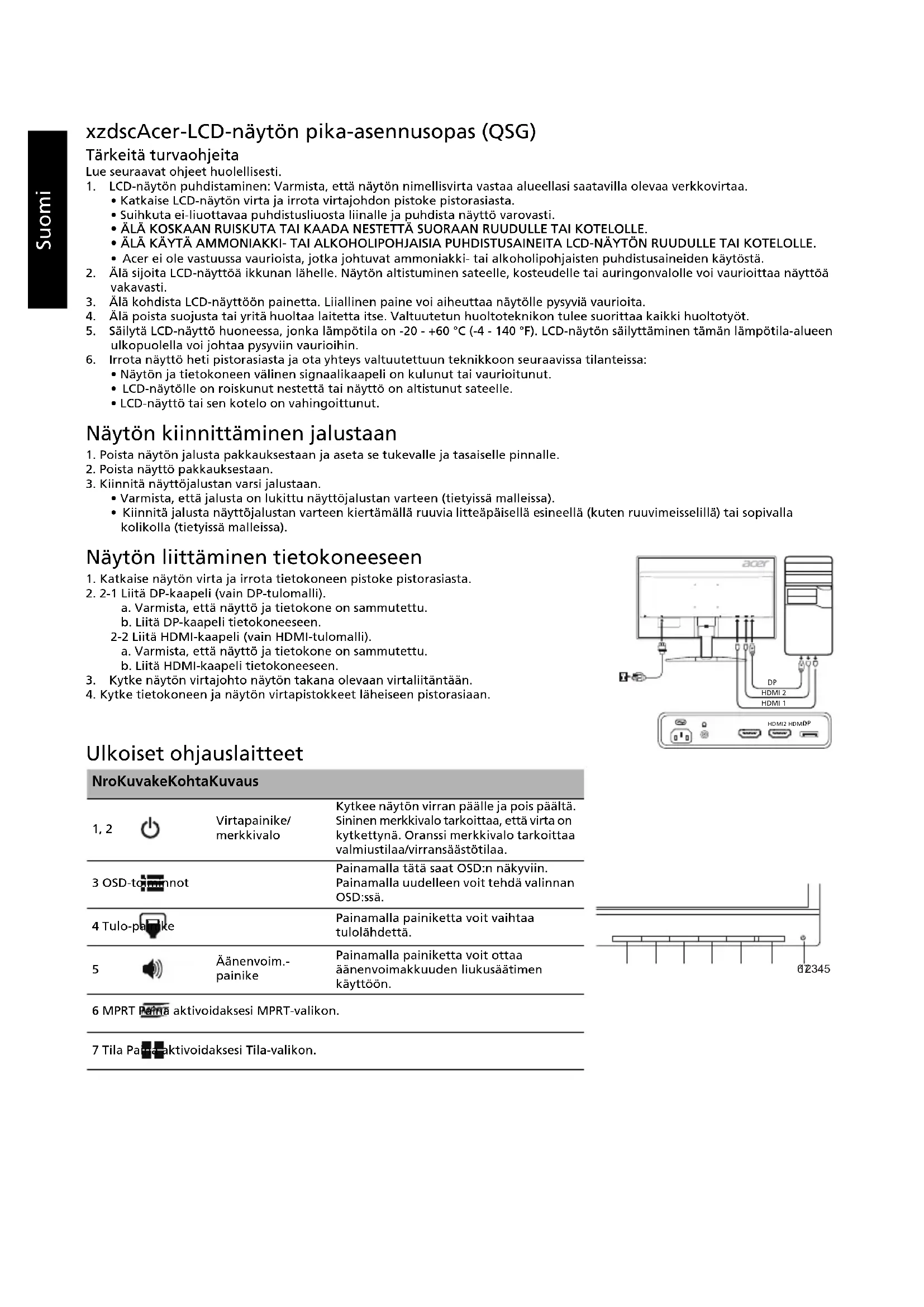 Äänenvoim.- painike Painamalla painiketta voit ottaa äänenvoimakkuuden liukusäätimen käyttöön. 6 MPRT Paina aktivoidaksesi MPRT-valikon. 7 Tila Paina aktivoidaksesi Tila-valikon. HDMI 2 HDMI 1 HDMI2 HDMI1 1234567Suomi Määräykset ja turvallisuusilmoitukset FCC-ilmoitus Tämä laite on testattu ja sen on todettu olevan FCC:n sääntöjen osan 15 mukaisten luokan B digitaaliselle laitteelle asetettujen rajoitusten mukainen. Nämä rajoitukset määrittävät riittävän suojauksen haitallisilta häiriöiltä kotitalousasennuksissa. Tämä laite muodostaa, käyttää ja saattaa säteillä radiotaajuusenergiaa. Jos sitä ei asenneta ja käytetä ohjeiden mukaisesti, se saattaa aiheuttaa haitallisia häiriöitä radioliikenteelle. Mitään takeita häiriöttömyydestä ei voida kuitenkaan antaa. Jos tämä laite aiheuttaa haitallisia häiriöitä radio- ja TV-vastaanotolle (häiriö voidaan havaita katkaisemalla laitteesta virta ja kytkemällä se uudelleen), käyttäjää kehotetaan korjaamaan häiriöt jollakin seuraavista tavoista: muuttamalla vastaanottoantennin asentoa tai paikkaa siirtämällä vastaanotin ja laite kauemmaksi toisistaan liittämällä laite pistorasiaan, joka kuuluu eri virtapiiriin kuin mihin vastaanotin on kytketty pyytämällä apua jälleenmyyjältä tai kokeneelta radio- ja TV-asentajalta. CE-vaatimustenmukaisuusvakuutus Acer Inc. vakuuttaa täten, että tämä LCD-näyttö on seuraavien direktiivien oleellisten vaatimusten ja muiden ehtojen mukainen: EMC-direktiivi 2014/30/EU, pienjännitedirektiivi 2014/35/EU, RoHS-direktiivi 2011/65/EU ja direktiivi 2009/125/EY energiaan liittyvien tuotteiden ekologiselle suunnittelulle asetettavien vaatimusten puitteista. Huomautus: Älä nosta näyttöä sen pohjasta, jotta se ei vahingoittuisi. Huomautus: Suojatut kaapelit Kaikki liitännät muihin tietokonelaitteisiin tulee tehdä suojatuilla kaapeleilla EMC-direktiivin säännösten mukaisesti. Huomautus: Oheislaitteet Tähän laitteeseen voi liittää vain sellaisia oheislaitteita (tiedonsiirtolaitteet, päätteet, tulostimet jne.), jotka on sertifioitu luokan B rajoitusten mukaisiksi. Käyttö ei-sertifioitujen oheislaitteiden kanssa aiheuttaa todennäköisesti häiriöitä radio- ja TV-vastaanotolle. Varoitus Muutokset, joita valmistaja ei ole erikseen hyväksynyt, saattavat mitätöidä FCC:n (Federal Communications Commission) käyttäjälle myöntämän luvan käyttää tätä laitetta. Käyttöehdot Tämä laite on FCC:n sääntöjen osan 15 mukainen. Käyttö on seuraavien ehtojen alaista: (1) Tämä laite ei saa aiheuttaa haitallisia häiriöitä, ja (2) tämän laitteen on hyväksyttävä kaikki vastaanotettu häiriö, mukaan lukien häiriöt, jotka saattavat aiheuttaa virheellistä käyttöä. Huomautus: Kanadassa asuvat käyttäjät Tämä luokan B digitaalinen laite on Kanadan ICES-003-standardin mukainen. Remarque à l'intention des utilisateurs canadiens Cet appareil numérique de la classe B est conforme à la norme NMB-003 du Canada. Käytöstä poistettujen laitteiden hävittäminen kotitalouksissa Euroopan unionin alueella Tämä laitteeseen tai sen pakkaukseen merkitty symboli tarkoittaa, että laitetta ei saa hävittää muun kotitalousjätteen mukana. Vastuullasi on viedä käytöstä poistettu laite sille tarkoitettuun elektronisten laitteiden ja sähkölaitteiden keräyspisteeseen kierrätettäväksi. Käytöstä poistetun laitteen erillinen keräys ja kierrätys auttavat säästämään luonnonvaroja ja varmistaa, että laite kierrätetään ihmisten terveyttä ja ympäristöä suojaavalla tavalla. Lisätietoa siitä, mihin voit viedä käytöstä poistetun laitteen kierrätettäväksi, saat ottamalla yhteyttä paikallisiin viranomaisiin, kierrätyskeskukseen tai jälleenmyyjään, jolta ostit laitteen.Suomi TEKNISET TIEDOT Acerin tuotteiden käyttöoppaita ja muita asiakirjoja on saatavilla Acerin virallisella tukisivustolla. *Vuosittaisen energiankulutuksen laskenta perustuu tyypilliseen 4 tunnin päivittäiseen virrankulutukseen 365 päivänä vuodessa. LCD-paneeli Ohjausjärjestelmä TFT Color LCD Koko 23,8”W (60 cm) Pikseliväli 0,2058 mm (V) x 0,2058 mm (P) Kirkkaus 350 cd/m