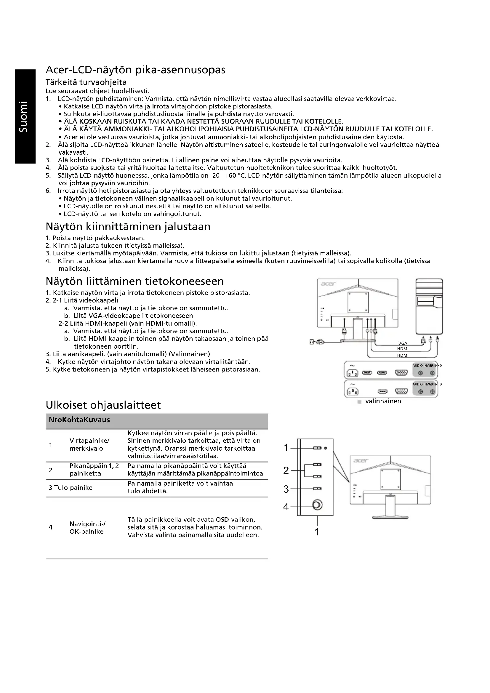 (tyypillinen) Kontrasti 100 000 000:1 enint. (ACM) Katselukulma 178° (V) 178° (P) (CR=10) Vasteaika 1 ms (VRB) Paneelityyppi VA Video R, G, B Analoginen liitäntä H-taajuus 30–85 kHz V-taajuus 56–76 Hz Näyttövärit 16,7 miljoonaa Pistekellotaajuus 174,5 MHz Enimmäistarkkuus HDMI: 1920 x 1080 @ 75 Hz VGA: 1920 x 1080 @ 75 Hz Plug & Play VESA DDCCI/DDC2B Virrankulutus (200 nitiä) Päällä 22 W Lepotila 0,5 W Pois 0,3 W Tuloliitäntä D-Sub HDMI (vain HDMI-tulomalli) Videotulosignaali Analoginen: 0,7 Vp-p (standardi), 75 OHM, positiivinen HDMI (vain HDMI-tulomalli) (valinnainen) Kaiuttimet 2 W x 2 (vain äänitulomalli) (valinnainen) Näyttöruudun enimmäiskoko Vaakasuora: 527,04 mm Pystysuora: 296,46 mm Virtalähde 100–240 V, 50/60 Hz Ympäristötekijät Käyttölämpötila: 0–40 °C Varastointilämpötila: -20–+60 °C Ilmankosteus: 20–80 % Mitat 607 (L) x 409 (K) x 133 (S) mm Paino (netto) 3,80 kg (netto) Mekanismin tiedot Kallistus: -5°–+15° Kierto: Ei Korkeuden säätö: Ei Nivelöinti: Ei Irrotettava jalusta: Kyllä Ulkoiset ohjauslaitteet Vaihto/painikkeet Virtapainike Pikanäppäin 1 Pikanäppäin 2 Tulo Valikko/Navigointi/OK Toiminnot Kirkkaus Kontrasti Sininen valo Mustan vahvistus ACM Superterävyys Vaakasijainti (vain analoginen tulomalli) Pystysijainti (vain analoginen tulomalli) Taajuus (vain analoginen tulomalli) Tarkennus (vain analoginen tulomalli) Autom. asetukset (vain analoginen tulomalli) Gamma Värin lämpöisyys Tilat sRGB-tila Harmaasävytila 6-aksel. sävy 6-aksel. satur. Äänenvoim. Mykistä Ylivaihde FreeSync Virkist.taaj.num VRB Kieli Aikakatkaisu Läpikuultavuus Lukitse OSD Tulo Autom. lähde Pikanäppäinmääritys Laajakuva DDC/CI HDMI-mustan taso Pika-aloitustila Näyttötiedot Nollaa kaikki asetuks. Lopeta Tekniset tiedot saattavat vaihdella mallin ja/tai alueen mukaan.Norsk Hurtigstartveiledning (QSG) for LCD-skjerm fra Acer Viktige sikkerhetsinstruksjoner Les følgende instruksjoner nøye.