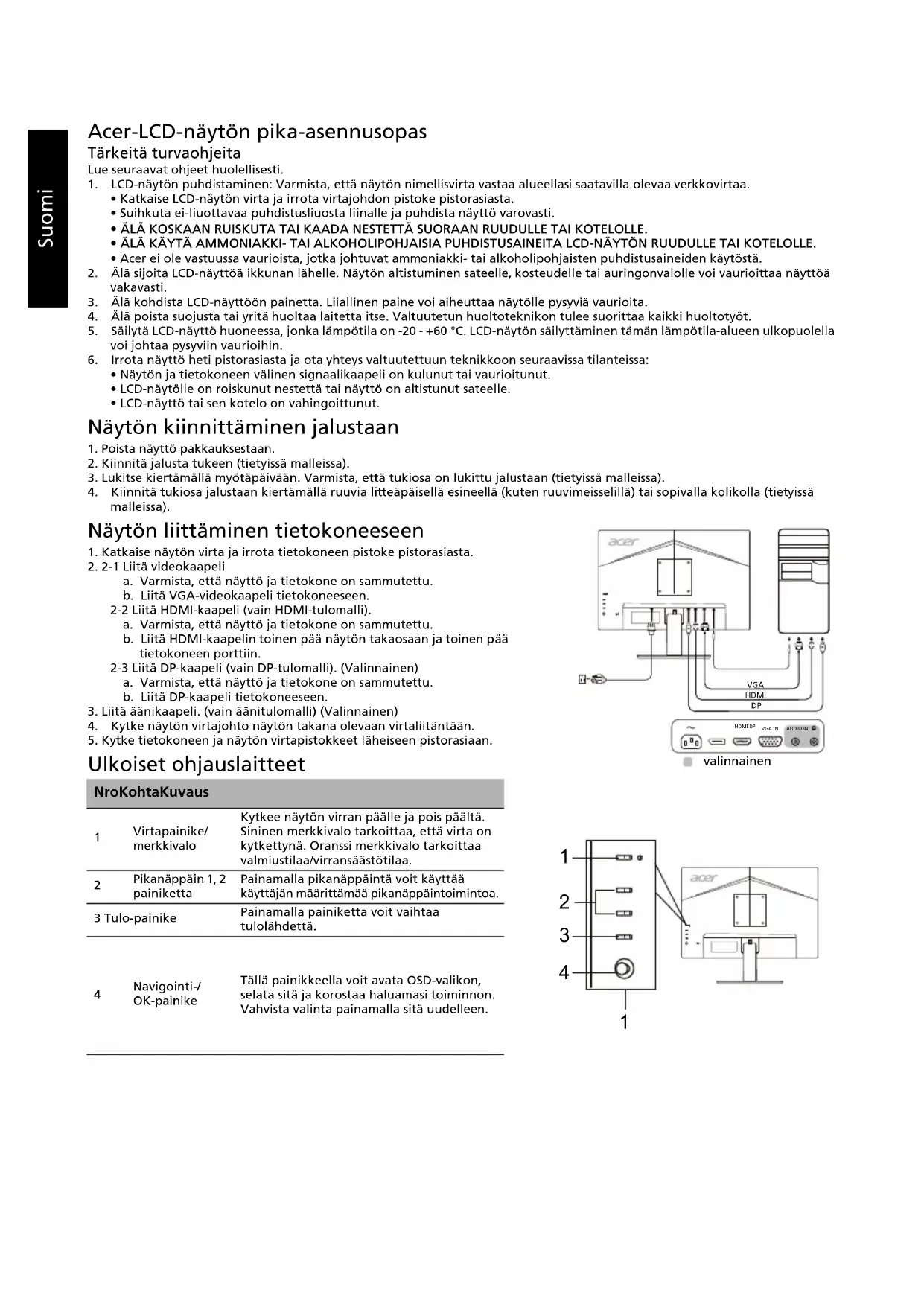2Suomi Määräykset ja turvallisuusilmoitukset FCC-ilmoitus Tämä laite on testattu ja sen on todettu olevan FCC:n sääntöjen osan 15 mukaisten luokan B digitaaliselle laitteelle asetettujen rajoitusten mukainen. Nämä rajoitukset määrittävät riittävän suojauksen haitallisilta häiriöiltä kotitalousasennuksissa. Tämä laite muodostaa, käyttää ja saattaa säteillä radiotaajuusenergiaa. Jos sitä ei asenneta ja käytetä ohjeiden mukaisesti, se saattaa aiheuttaa haitallisia häiriöitä radioliikenteelle. Mitään takeita häiriöttömyydestä ei voida kuitenkaan antaa. Jos tämä laite aiheuttaa haitallisia häiriöitä radio- ja TV- vastaanotolle (häiriö voidaan havaita katkaisemalla laitteesta virta ja kytkemällä se uudelleen), käyttäjää kehotetaan korjaamaan häiriöt jollakin seuraavista tavoista: muuttamalla vastaanottoantennin asentoa tai paikkaa siirtämällä vastaanotin ja laite kauemmaksi toisistaan liittämällä laite pistorasiaan, joka kuuluu eri virtapiiriin kuin mihin vastaanotin on kytketty pyytämällä apua jälleenmyyjältä tai kokeneelta radio- ja TV-asentajalta. CE-vaatimustenmukaisuusvakuutus Acer Inc. vakuuttaa täten, että tämä LCD-näyttö on seuraavien direktiivien oleellisten vaatimusten ja muiden ehtojen mukainen: EMC-direktiivi 2014/30/EU, pienjännitedirektiivi 2014/35/EU, RoHS-direktiivi 2011/65/EU ja direktiivi 2009/125/EY energiaan liittyvien tuotteiden ekologiselle suunnittelulle asetettavien vaatimusten puitteista. Huomautus: Älä nosta näyttöä sen pohjasta, jotta se ei vahingoittuisi. Huomautus: Suojatut kaapelit Kaikki liitännät muihin tietokonelaitteisiin tulee tehdä suojatuilla kaapeleilla EMC-direktiivin säännösten mukaisesti. Huomautus: Oheislaitteet Tähän laitteeseen voi liittää vain sellaisia oheislaitteita (tiedonsiirtolaitteet, päätteet, tulostimet jne.), jotka on sertifioitu luokan B rajoitusten mukaisiksi. Käyttö ei-sertifioitujen oheislaitteiden kanssa aiheuttaa todennäköisesti häiriöitä radio- ja TV-vastaanotolle. Varoitus Muutokset, joita valmistaja ei ole erikseen hyväksynyt, saattavat mitätöidä FCC:n (Federal Communications Commission) käyttäjälle myöntämän luvan käyttää tätä laitetta. Käyttöehdot Tämä laite on FCC:n sääntöjen osan 15 mukainen. Käyttö on seuraavien ehtojen alaista: (1) Tämä laite ei saa aiheuttaa haitallisia häiriöitä, ja (2) tämän laitteen on hyväksyttävä kaikki vastaanotettu häiriö, mukaan lukien häiriöt, jotka saattavat aiheuttaa virheellistä käyttöä. Huomautus: Kanadassa asuvat käyttäjät Tämä luokan B digitaalinen laite on Kanadan CAN ICES-003(B)/NMB-003(B)-standardin mukainen. Remarque à l'intention des utilisateurs canadiens Cet appareil numérique de la classe B est conforme à la norme NMB-003 du Canada. Käytöstä poistettujen laitteiden hävittäminen kotitalouksissa Euroopan unionin alueella Tämä laitteeseen tai sen pakkaukseen merkitty symboli tarkoittaa, että laitetta ei saa hävittää muun kotitalousjätteen mukana. Vastuullasi on viedä käytöstä poistettu laite sille tarkoitettuun elektronisten laitteiden ja sähkölaitteiden keräyspisteeseen kierrätettäväksi. Käytöstä poistetun laitteen erillinen keräys ja kierrätys auttavat säästämään luonnonvaroja ja varmistaa, että laite kierrätetään ihmisten terveyttä ja ympäristöä suojaavalla tavalla. Lisätietoa siitä, mihin voit viedä käytöstä poistetun laitteen kierrätettäväksi, saat ottamalla yhteyttä paikallisiin viranomaisiin, kierrätyskeskukseen tai jälleenmyyjään, jolta ostit laitteen.Suomi TEKNISET TIEDOT Acerin tuotteiden käyttöoppaita ja muita asiakirjoja on saatavilla Acerin virallisella tukisivustolla. LCD-paneeli Ohjausjärjestelmä TFT Color LCD Koko 24”W (61 cm) Pikseliväli 0,270 mm (V) x 0,270 mm (P) Kirkkaus 300 cd/m