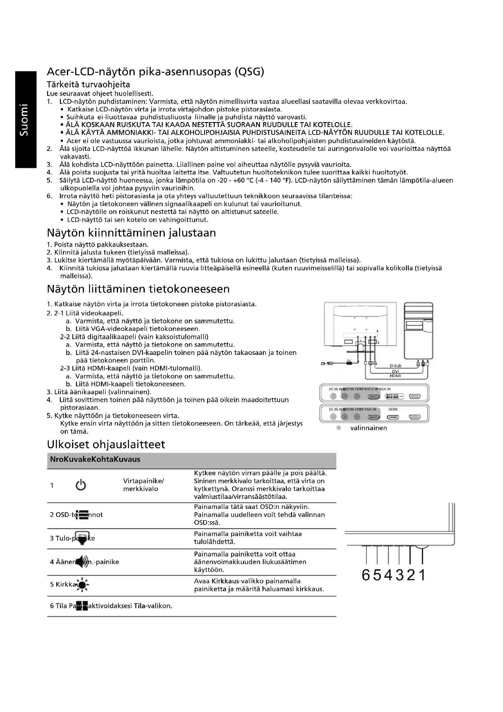 (typisk) Kontrast 100000000:1 Maks. (ACM) Betragtningsvinkel 178° (H) 178° (V) (CR=10) 170° (H) 160° (V) (CR=10) Svartid 4 ms (G til G) 1 ms (G til G) Paneltype VA TN Video R, G, B analogt interface H-frekvens 30 kHz - 85 kHz V-frekvens 56 - 76 Hz Skærmfarver 16,7 millioner Pixelfrekvens VGA/DVI: 148,5 MHz HDMI 1.4: 174,5 MHz Maksimal opløsning VGA/DVI: 1920 x 1080 ved 60 Hz HDMI: 1920 x 1080 ved 75 Hz Plug & Play VESA DDCCI/DDC2B Energiklasse B *Årligt energiforbrug 50 (kWh) (til model med HDMI-indgang) Strømforbrug (ved 200 enheder) Tændt tilstand 25,8 W (typisk) Slumretilstand 0,49 W (typisk) Slukket tilstand 0,36 W (typisk) Indgangsstik D-Sub DVI-D 24 ben (kun model med dual-indgang) HDMI 19 ben (kun model med HDMI-indgang) Videoindgangssignal Analog: 0,7 Vp-p (standard), 75 OHM, positiv Digitalt signal (kun model med dual-indgang) HDMI (kun model med HDMI-indgang) (ekstraudstyr) Højttalere 2 W x 2 (kun model med lydindgang) (ekstraudstyr) Maksimal skærmstørrelse Vandret: 597,6 mm Lodret: 336,15 mm Strømkilde 19 V 2.1 A (2,1 A) Miljøhensyn Driftstemperatur: 0° til 40° C Opbevaringsgtemp.: -20° til 60° C Luftfugtighed ved drift: 20% til 80% Mål 614 (B) x 424,8 (H) x 178,9 (D) mm Vægt (N. W.) 4,6 kg (netto) 4,6 kg (netto) Funktionsspecifikationer Hældning: -5° til +15° Aftagelig fod: Ja (aftagelig fod med skrueudløsning) Udvendige knapper Knapper Tænd/sluk-knap MENU/ENTER Indgang Lydstyrke Lysstyrke Tilstand Funktioner Lysstyrke Kontrast Blåt lys Mørkeforstærkning ACM Til/Fra Super skarphed H.-position (kun model med analog indgang) V.-position (kun model med analog indgang) Fokus (kun model med analog indgang) Ur (kun model med analog indgang) Automatisk konfiguration (kun model med analog indgang) Gamma Farvetemperatur Tilstande sRGB-tilstand Gråskala-tilstand 6-akset nuance 6-akset mætning Lydstyrke Lydløs Overgear FreeSync Sigtekikkert Sprog OSD-timeout Gennemsigtighed Opdateringshastighed OSD-lås Indgang Automatisk kilde Tildeling af genvejstast Bred tilstand DDC/CI Til/Fra HDMI sort niveau Hurtig opstart Oplysninger om skærm Nulstil alle indstillinger Afslut Alle specifikationer kan ændres uden varsel.Suomi Acer-LCD-näytön pika-asennusopas (QSG) Tärkeitä turvaohjeita Lue seuraavat ohjeet huolellisesti.